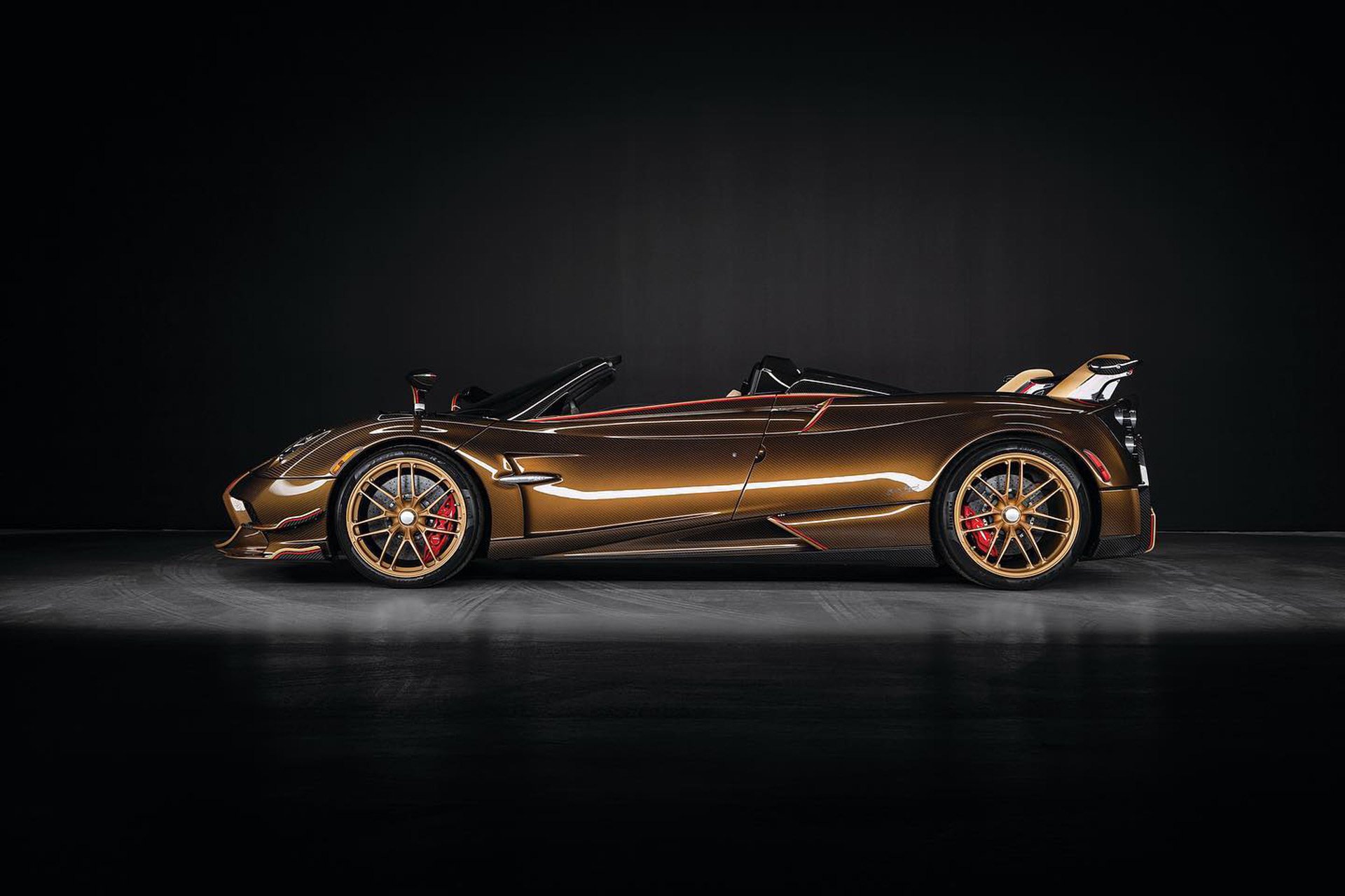 Huayra BC Roadster คันนี้มีชื่อเล่นว่า Supernova สั่งทำพิเศษด้วยผิวตัวถังแบบ exposed carbon fiber โชว์ลวดลายคาร์บอนฯ ทั้งคัน สาดด้วยสีทอง Ora Rosa ต่อเนื่องกับชุดล้อฟอร์จอลูมิเนียมสี Bronzo Chiaro มองใกล้ๆ จะเห็นเนื้อสีมีประกาย ตัดกับคาลิปเปอร์เบรกสีแดงได้อย่างลงตัว ภายในห้องโดยสารถือว่าเนี๊ยบสุดๆ มาในโทนอบอุ่น เบาะนั่งใช้หนังแท้สี Tan สอดแทรกด้วยผ้าทอลายสกอต แต่ยังคงดุดันด้วยการใช้คาร์บอนไฟเบอร์สลับกับ Alcantara เกจ์วัดความเร็ว 4 วง เปลี่ยนพื้นหลังเป็นสีทอง หัวเกียร์อลูมิเนียมตกแต่งด้วยไม้ และที่ฐานใช้คาร์บอนฯ สีทอง Ora Rosa แบบเดียวกับภายนอกรถ