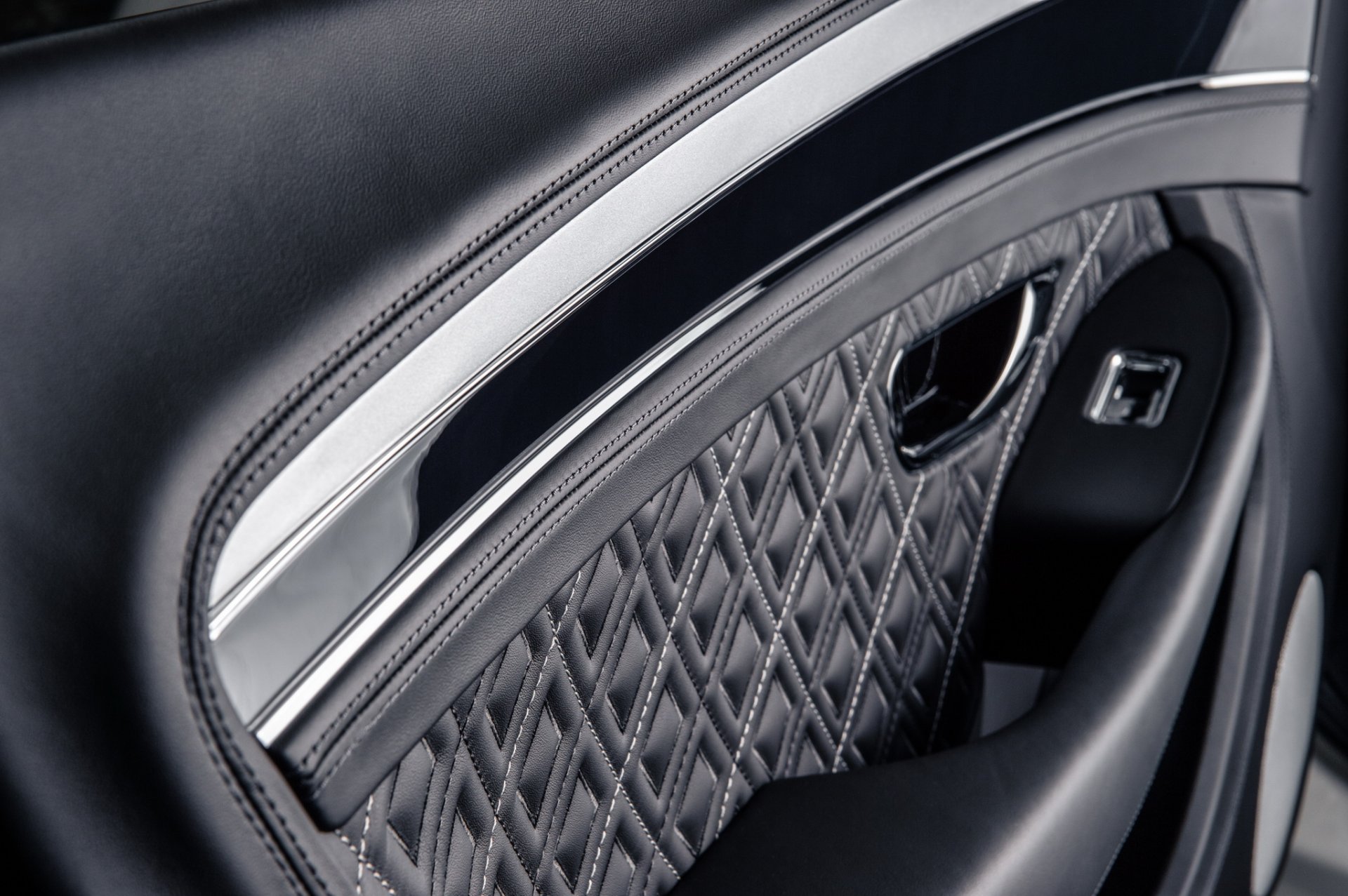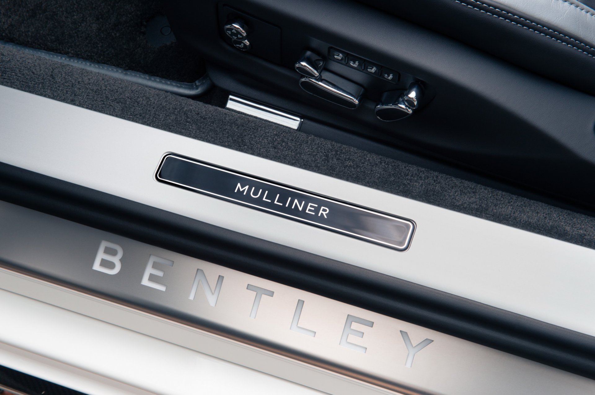 บรรยากาศห้องโดยสารยังเน้นแนวโมโนโครมดำขาวทำให้ดูร่วมสมัย แผงคอนโซล แผงประตู เลือกใช้ไม้วีเนียร์สี Piano Moonbeam กับ Grand Black ซึ่งถูกพ่นสีด้วยมืออย่างประณีตไม่ว่าคุณจะมองจากมุมไหนเนื้อสีเมทัลลิกจะเนียนกริ๊บเท่ากันหมด เบาะนั่งลวดลายเพชรใช้สีดำ Beluga ตราเบนท์ลีย์บนหมอนรองศรีษะตัดเย็บด้วยด้ายสีเงิน พรมปูพื้นสั่งทำพิเศษ และคิ้วบันไดสีเงินเรืองแสงติดตรา Mulliner ทำให้รถคันนี้ดูนุ่มนวลไปหมดทุกอย่าง