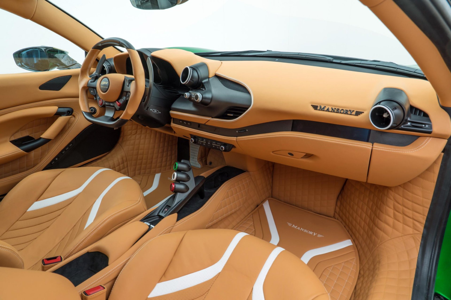 ต่อกันที่ห้องโดยสารก็จัดแจงทำใหม่ เปิดประตูเข้ามาจะพบกับคิ้วบันไดที่ใช้วัสดุฟอร์จคาร์บอนเงา ส่วนพื้นรถกับพรมวางเท้าตัดเย็บเป็นลายสี่เหลี่ยมเพชร แทบทุกส่วนถูกหุ้มด้วยหนังแท้ทั้งหมดมาในโทนสีเบจ เบาะนั่งปักตรา Mansory ไว้ที่หมอนรองศรีษะ ตัดเย็บลวดลายใหม่สอดแทรกสีขาวเพิ่มความหรูโดดเด่นได้ดี พวงมาลัยติดตรา F8XX หุ้มหนังสลับคาร์บอนไฟเบอร์พร้อมไฟ LED shift light