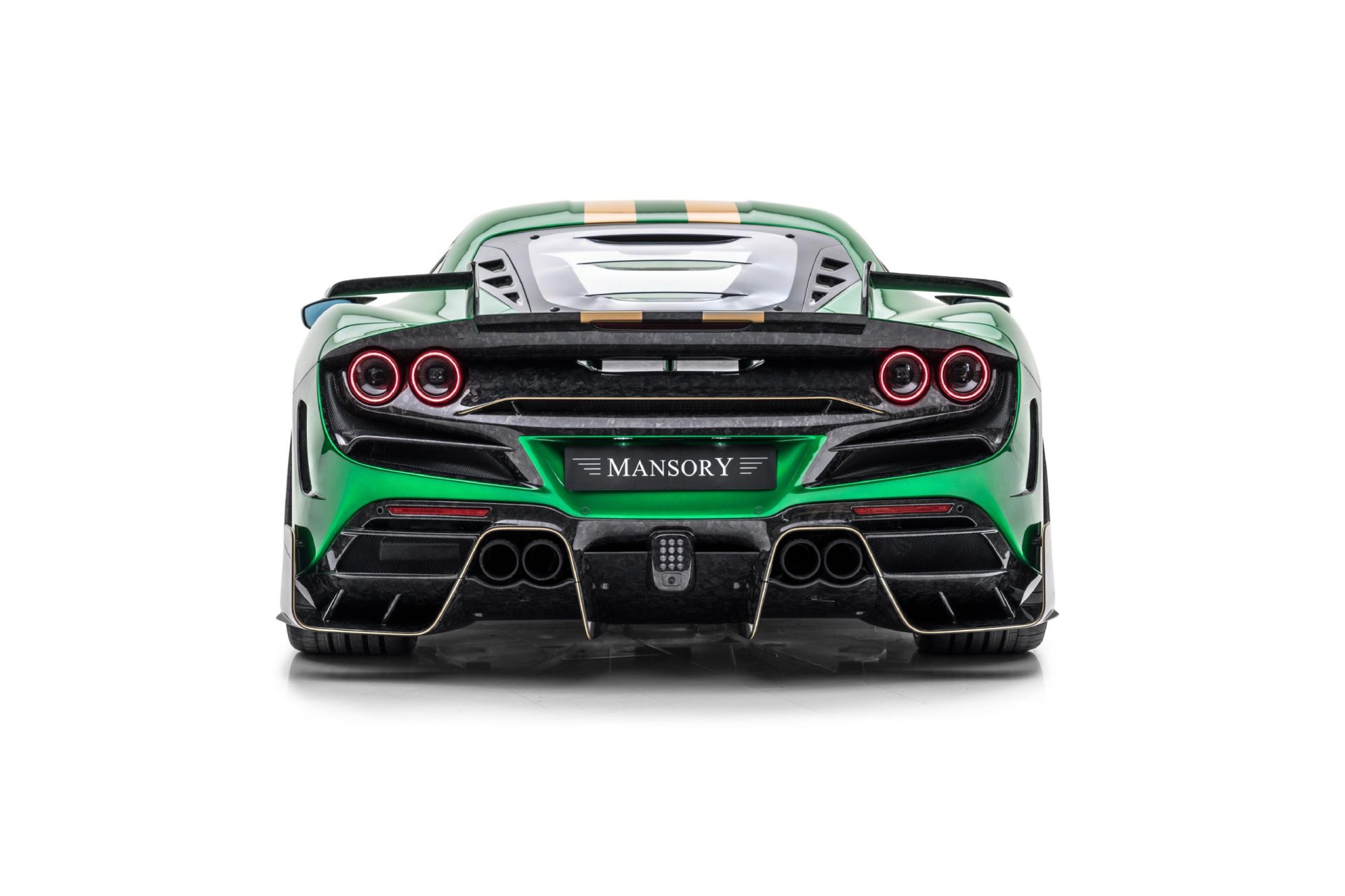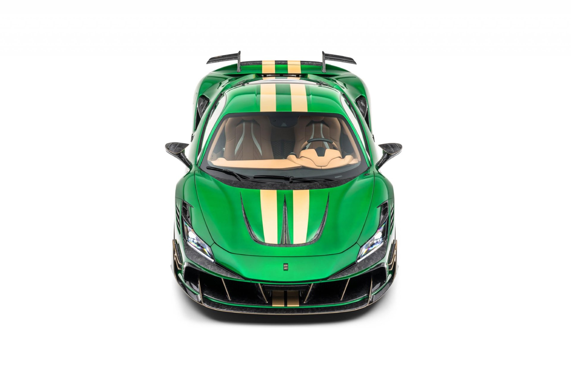 นี่คือการแปลงโฉมรอบคันในสไตล์แมนซอรี่ F8XX มากับตัวถังสีเขียวพิเศษ Catania Green เสริมความอลังกาลด้วยชิ้นส่วนฟอร์จคาร์บอนลายหินอ่อนทั่วคันที่มีน้ำหนักเบาพิเศษ แถมด้านแอร์โรไดนามิกก็ดีขึ้นด้วย ไม่ว่าจะเป็น ชุดกันชนหน้าเสริมลิ้นกับคาร์นาดด้านข้าง, ฝากระโปรงหน้า, กระจกมองข้างเสริมครีบ,สกิร์ตข้าง, ช่องดักอากาศข้างตัวรถเสริมครีบ, ฝาห้องเครื่องยนต์ใหม่วัสดุโพลีคาร์บอเนตเสริมช่องระบายความร้อนมากกว่าเดิม, Diffuser ท้ายขนาดใหญ่จัดเต็มพร้อมปลายท่อไอเสียออก 4 ท่อ, ปีกท้ายดีไซน์โดดเด่นทรงตัว L แบบแยกชิ้นซ้าย-ขวา คล้ายคลึงกับในรถแข่ง Ferrari FXX-K ส่วนของล้อฟอร์จมาเป็นสีทองลายใหม่ YT.5 ด้านหน้าขอบ 21 นิ้ว หลัง 22 นิ้ว จับคู่กับยางสมรรถนะสูงไซส์ 255/30 ZR21 และ 335/25 ZR22