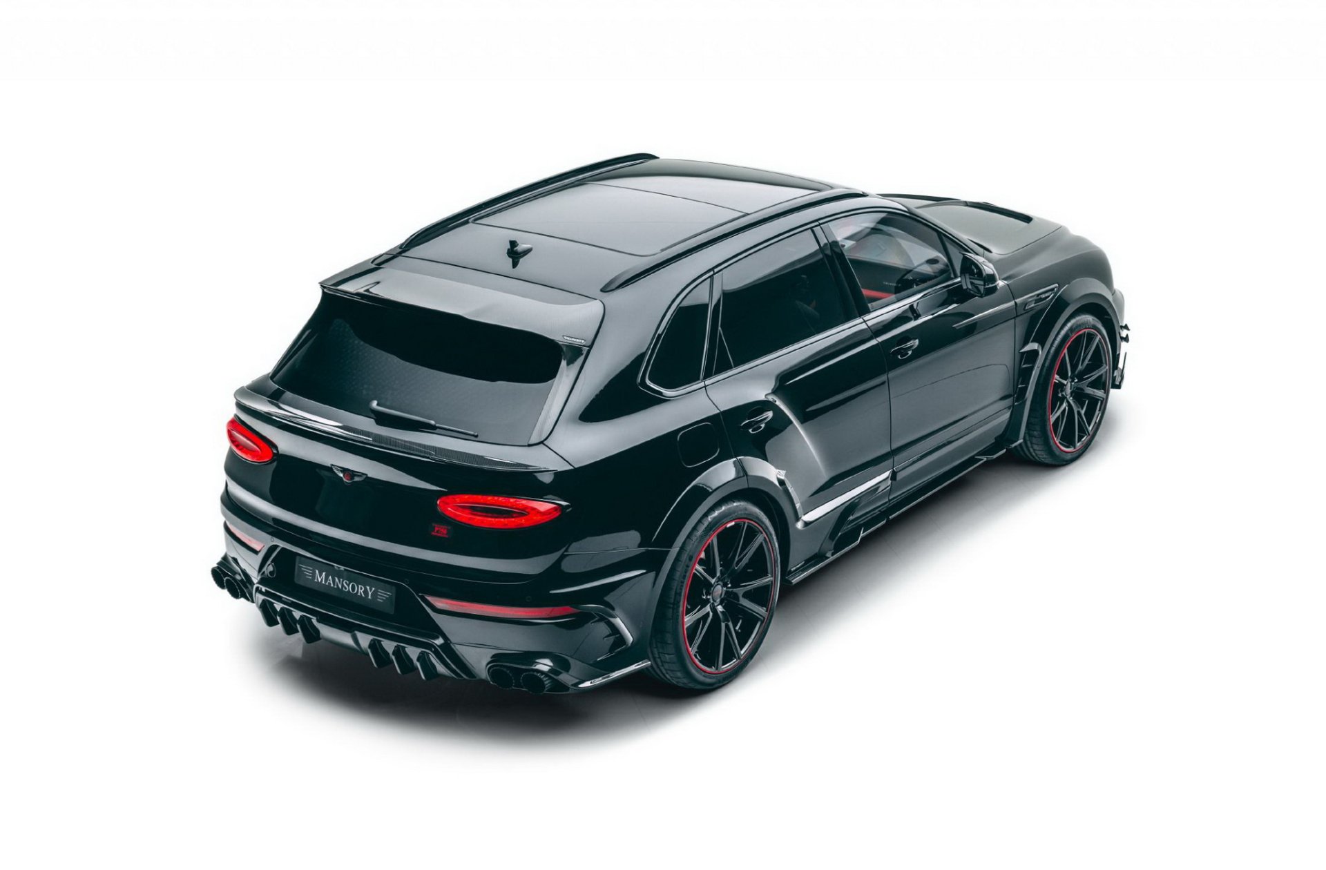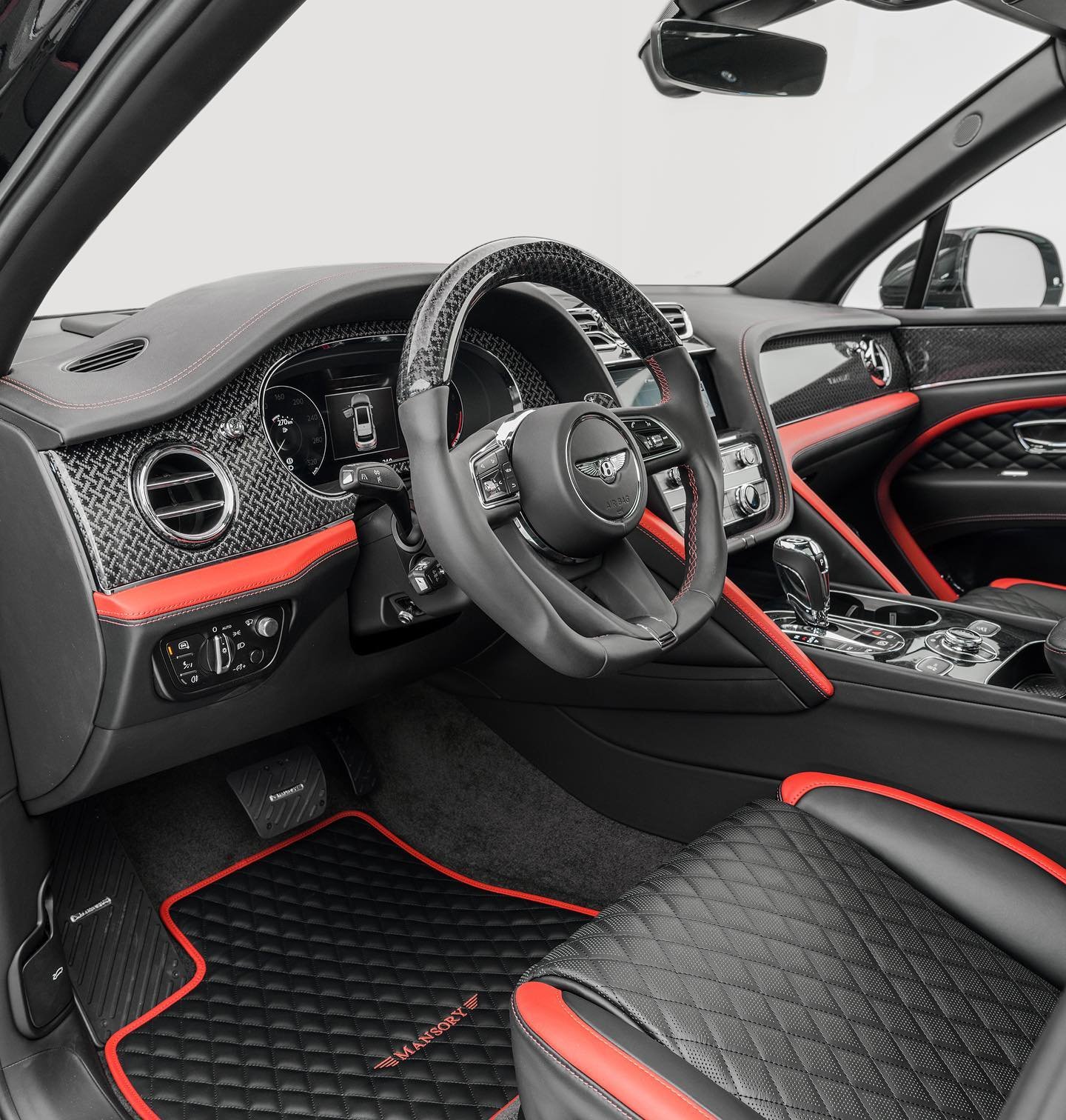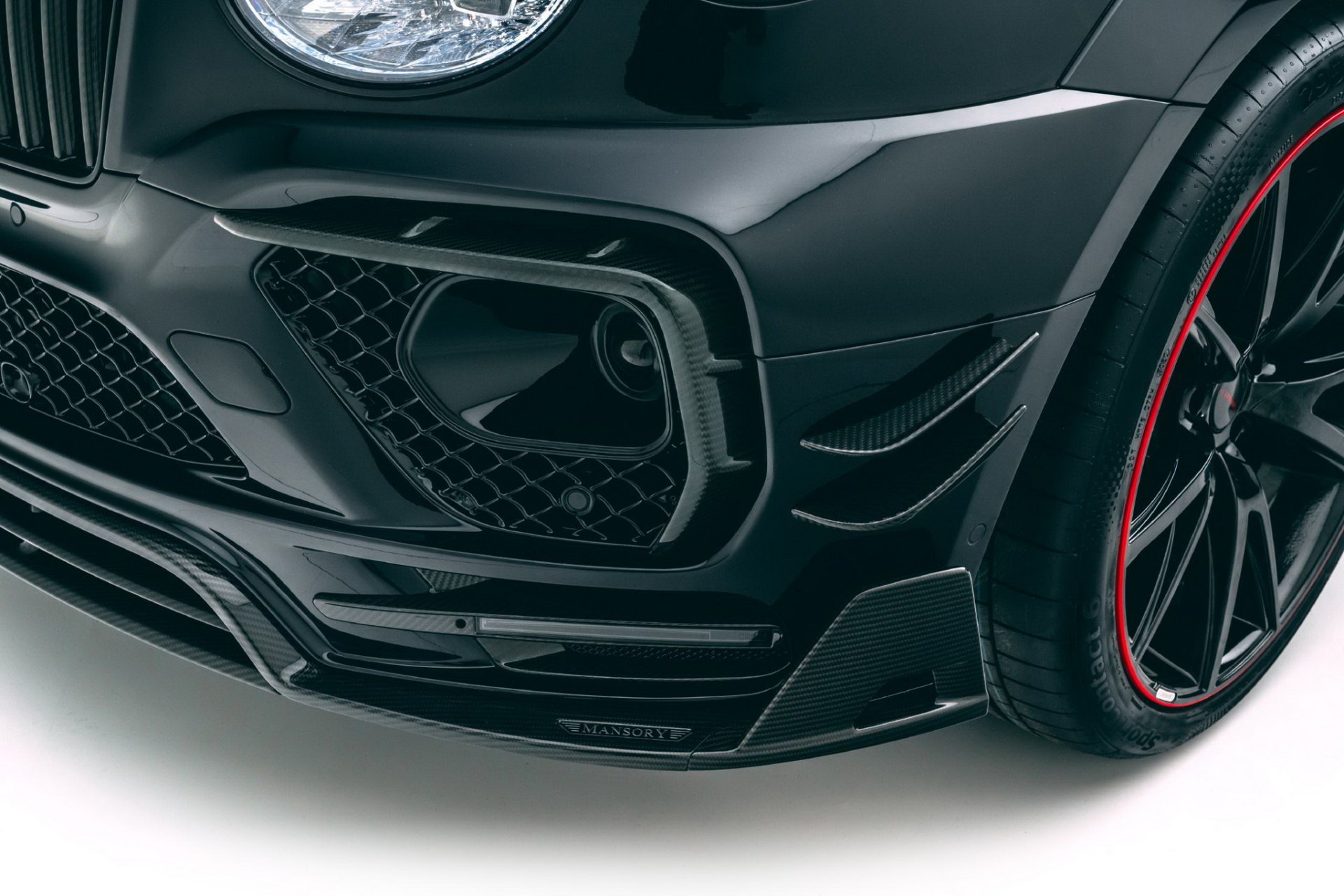 ใครที่ต้องการเพิ่มความโหดให้กับรถ Bentayga นี่อาจจะโดนใจคุณ ชุดแต่ง Mansory จัดเต็มรอบคันแบบตัวถัง Wide body วัสดุทุกจุดเป็นคาร์บอนไฟเบอร์ทั้งหมด ที่ด้านหน้ารถเราจะได้ลิ้นหน้าเสริมไฟ LED เพิ่มความหรู คาร์นาด 2 ชั้นสไตล์รถแข่ง ฝากระโปรงหน้าเสริมช่องระบายความร้อน กระจังหน้าเปลี่ยนใหม่แบบแนวตั้งดุดันขึ้นชัดเจน ด้านข้างได้สกิร์ตข้างใหม่ ฝาครอบกระจกมองข้างใหม่ และช่องลมตัว B ก็ต่อปีกให้ยาวกว่าปกติ บั้นท้ายติดสกิร์ตหลังใหม่รับกับดิฟฟิวเซอร์ 6 ครีบ ปลายท่อไอเสียคู่ใหม่ และลดอาการท้ายลอยด้วยสปอยเลอร์ท้ายชิ้นใหญ่บนหลังคา และชิ้นเล็กที่ฝากระโปรงท้าย ส่วนล้อใส่มาขนาด 23 นิ้ว สีดำ high gloss แต่ถ้ายังดูเล็กอีกก็สั่งไซส์ 24 นิ้ว มาสวมได้