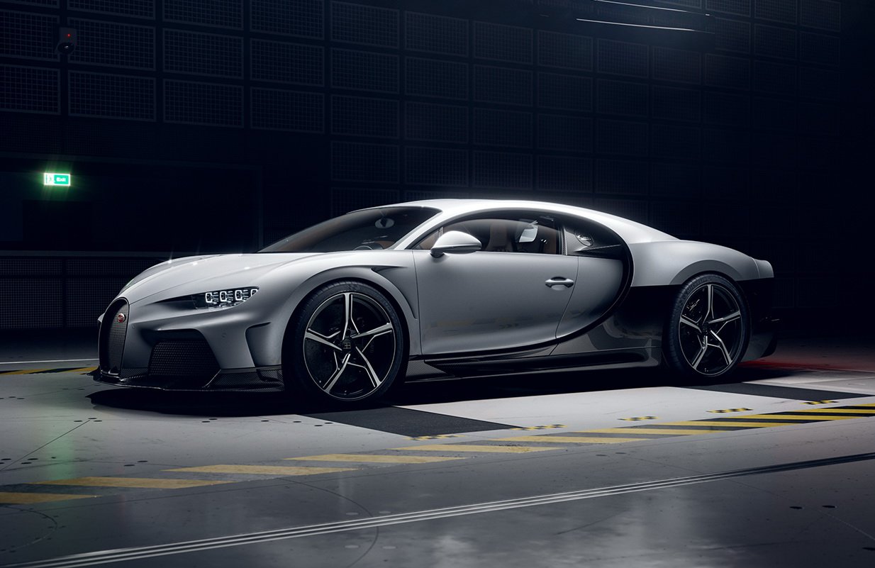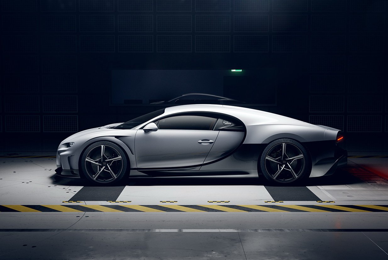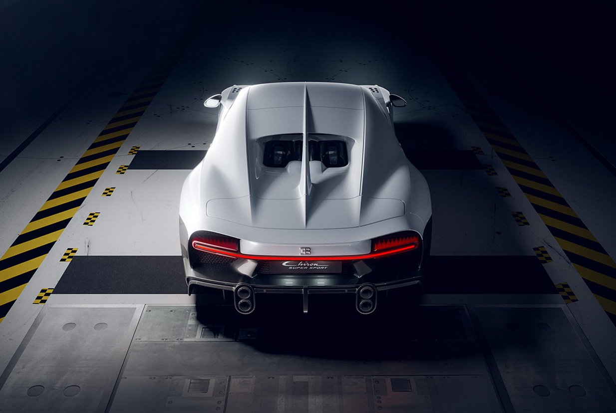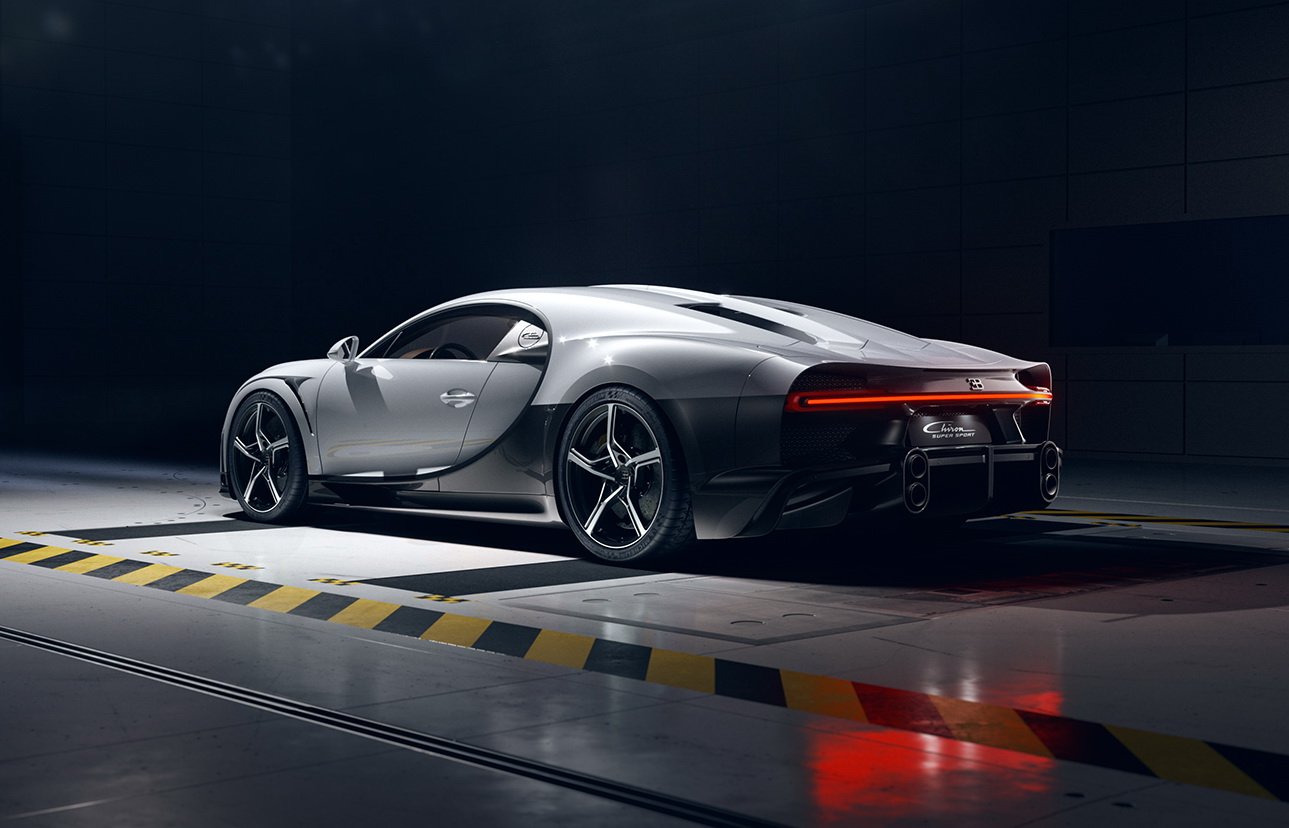 CHIRON Super Sport พัฒนาใหม่หมดทั้งแชสซีส์ ระบบบังคับเลี้ยว สปริงที่แข็งขึ้น ใช้ยาง Michelin Pilot Sport Cup 2 เน้นนุ่มนวลกว่ายาง Pilot Sport Cup 2R ที่ใส่ในรุ่น Pur Sport งานดีไซน์ภายนอกได้กันชนหน้าใหม่ที่ดูเซ็กซี่ออกแบบให้มีช่อง Air Curtain สร้างม่านอากาศไหลออกไปข้างตัวรถได้อย่างรวดเร็ว เหนือซุ้มล้อหน้ายังเพิ่มช่องระบายอากาศทรงกลมฝั่งละ 9 รู นอกจากจะสวยงามแบบรุ่น EB 110 Super Sport มันยังทำหน้าที่ช่วยควบคุมสมดุลระหว่างแรงกดกับแรงยกที่บริเวณล้อหน้าได้อย่างดี มาที่บั้นท้ายซึ่งเป็นจุดสำคัญของรุ่นนี้ สังเกตได้ว่าท้ายจะลาดต่ำลง และยาวเพิ่มขึ้นจาก Chiron ปกติประมาณ 25 ซม. เพื่อให้อากาศไหลผ่านผิวตัวถังได้แนบเนียนเน้นลดแรงต้านโดยเฉพาะ ส่วนตัวดิฟฟิวเซอร์ก็ถูกขยายอาณาเขตกินไปถึงขอบตัวรถซึ่งมันกลายเป็นพระเอกในการสร้างแรงกดแทนที่ปีกท้าย Active ไปเลย ตัวท่อไอเสียก็ย้ายตำแหน่งไปด้านข้างมาเป็นแนวตั้ง ซุ่มเสียงถูกปรับให้นุ่มลึกยิ่งขึ้น และยังได้ล้ออลูมิเนียมดีไซน์ใหม่ 5 ก้าน เลือกสีได้จะเป็นดำตัดเงิน หรือเป็นดำเงาล้วนแนวดุๆ แต่ถ้าต้องการรีดน้ำหนักลงอีกสามารถสั่งล้อแม็กนีเซียมที่อยู่ใน Chiron Pur Sport มาใส่ได้
