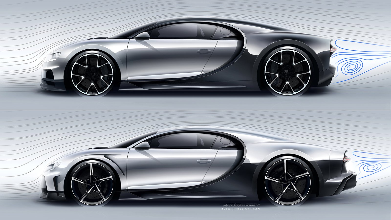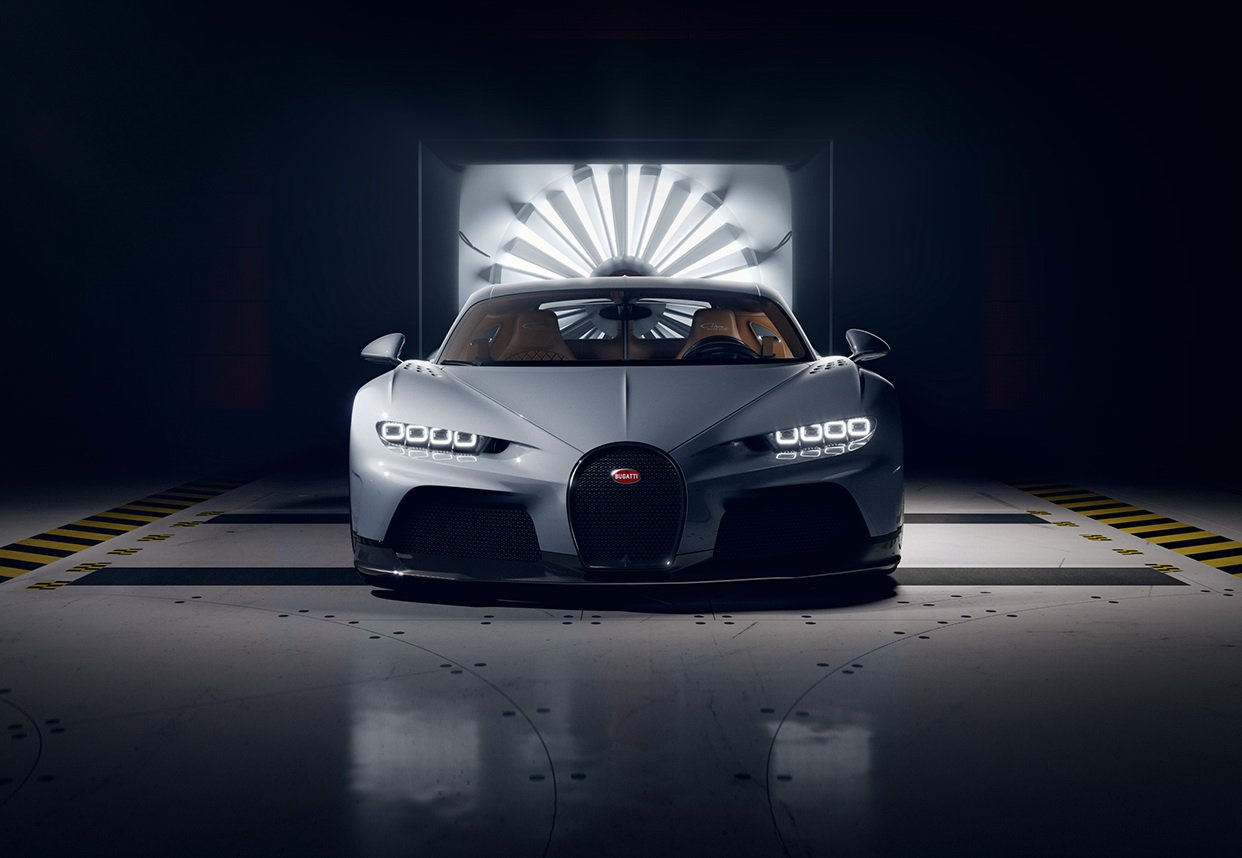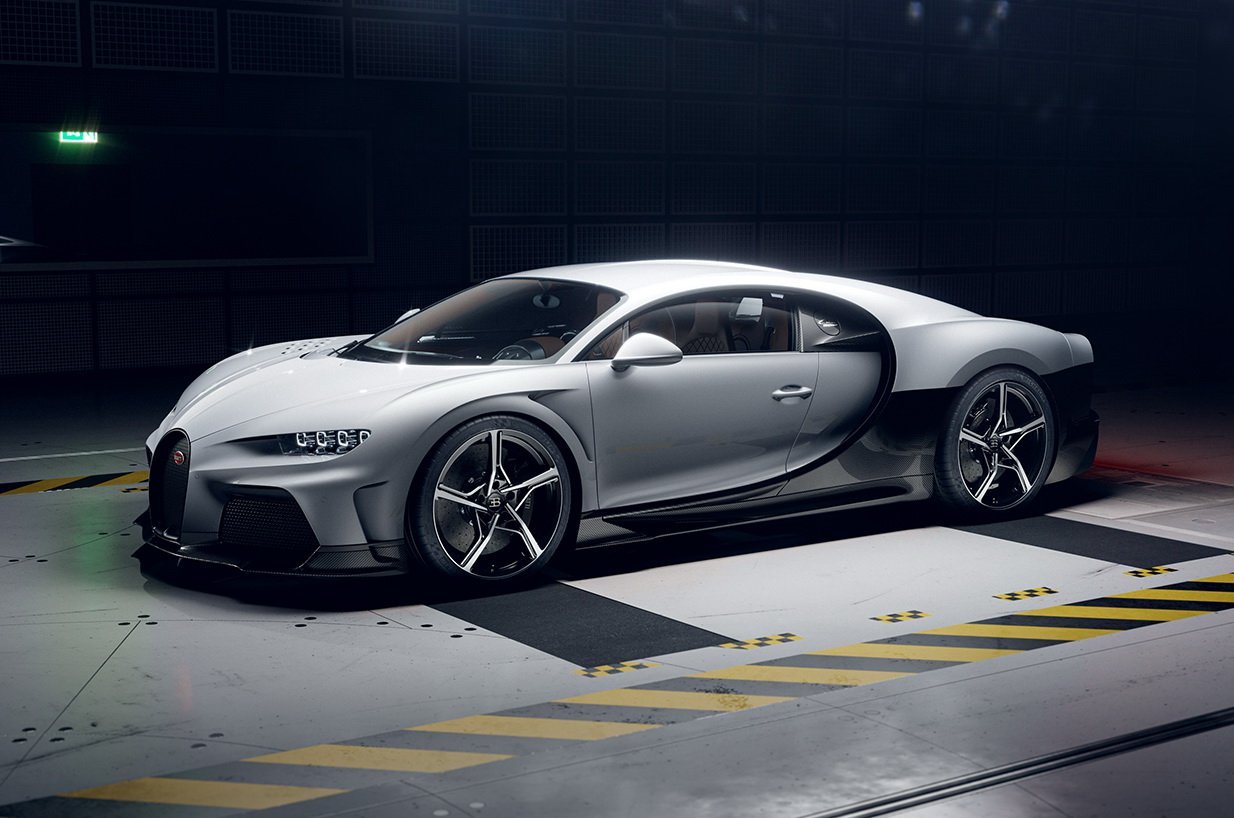 CHIRON Super Sport พัฒนาใหม่หมดทั้งแชสซีส์ ระบบบังคับเลี้ยว สปริงที่แข็งขึ้น ใช้ยาง Michelin Pilot Sport Cup 2 เน้นนุ่มนวลกว่ายาง Pilot Sport Cup 2R ที่ใส่ในรุ่น Pur Sport งานดีไซน์ภายนอกได้กันชนหน้าใหม่ที่ดูเซ็กซี่ออกแบบให้มีช่อง Air Curtain สร้างม่านอากาศไหลออกไปข้างตัวรถได้อย่างรวดเร็ว เหนือซุ้มล้อหน้ายังเพิ่มช่องระบายอากาศทรงกลมฝั่งละ 9 รู นอกจากจะสวยงามแบบรุ่น EB 110 Super Sport มันยังทำหน้าที่ช่วยควบคุมสมดุลระหว่างแรงกดกับแรงยกที่บริเวณล้อหน้าได้อย่างดี มาที่บั้นท้ายซึ่งเป็นจุดสำคัญของรุ่นนี้ สังเกตได้ว่าท้ายจะลาดต่ำลง และยาวเพิ่มขึ้นจาก Chiron ปกติประมาณ 25 ซม. เพื่อให้อากาศไหลผ่านผิวตัวถังได้แนบเนียนเน้นลดแรงต้านโดยเฉพาะ ส่วนตัวดิฟฟิวเซอร์ก็ถูกขยายอาณาเขตกินไปถึงขอบตัวรถซึ่งมันกลายเป็นพระเอกในการสร้างแรงกดแทนที่ปีกท้าย Active ไปเลย ตัวท่อไอเสียก็ย้ายตำแหน่งไปด้านข้างมาเป็นแนวตั้ง ซุ่มเสียงถูกปรับให้นุ่มลึกยิ่งขึ้น และยังได้ล้ออลูมิเนียมดีไซน์ใหม่ 5 ก้าน เลือกสีได้จะเป็นดำตัดเงิน หรือเป็นดำเงาล้วนแนวดุๆ แต่ถ้าต้องการรีดน้ำหนักลงอีกสามารถสั่งล้อแม็กนีเซียมที่อยู่ใน Chiron Pur Sport มาใส่ได้