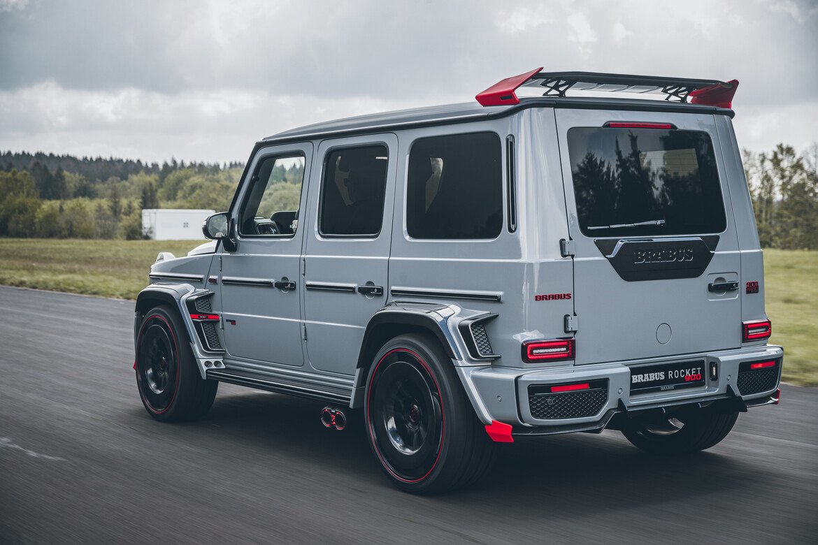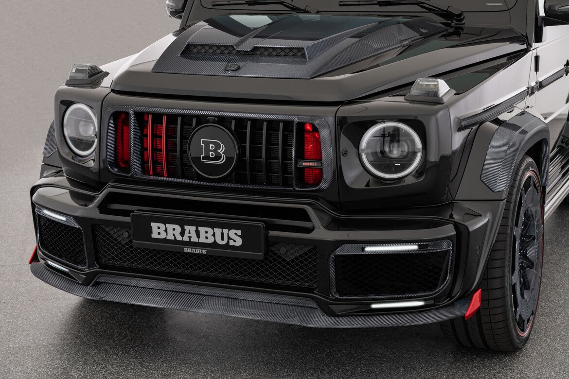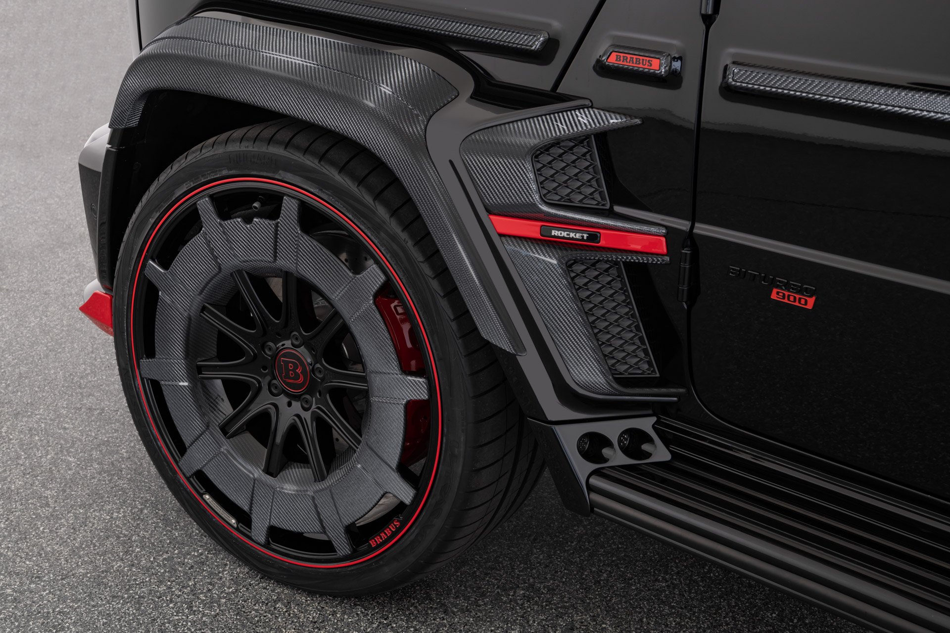 Brabus 900 Rocket ถือเป็น G-Class ที่ส่งตรงจากโรงงาน Brabus แบบจัดเต็มที่สุด มีมาให้เลือก 2 สีพิเศษ คือ เทา Stealth Grey และดำ Signature Black จัดเต็มด้วยชิ้นส่วนคาร์บอนไฟเบอร์ทั้งหมดตั้งแต่ ชิ้นสปอยเลอร์หน้า, กระจังหน้าดูดอากาศ RamAir, ชิ้นส่วนเสริมบังโคลน, สปอยเลอร์หลังคา, ดิฟฟิวเซอร์หลัง ชุดแต่ง Widestar ก็มาเต็มระบบ ยกตัวอย่างเช่น สเกิร์ตหน้า, สเกิร์ตหลัง, ตราโลโก้ Rocket ที่กระจังหน้ามีไฟเรื่องแสง, ฝากระโปรงหน้าคาร์บอนไฟเบอร์เงา, มือจับประตูคาร์บอนไฟเบอร์ เรียกว่าคาร์บอนแทบทุกจุด ท่อไอเสียออกข้างตัวรถเป็นปลายคาร์บอนฯ เพิ่มลูกเล่นด้วยไฟซ่อนสีแดงด้านในราวกับท่อจรวด ล้อให้มาแบบฟอร์จลาย Monoblock Z ขอบ 24 นิ้ว มีการติดตั้งจาน Aero-Discs ช่วยลดแรงต้านอากาศได้ด้วย ระบบกันสะเทือนก็เปลี่ยนใหม่เป็นของ Brabus RideControl พร้อมยางประสิทธิภาพสูงให้คุณเลือกได้เลยทั้งแบรนด์ Continental, Pirelli และ Yokohama