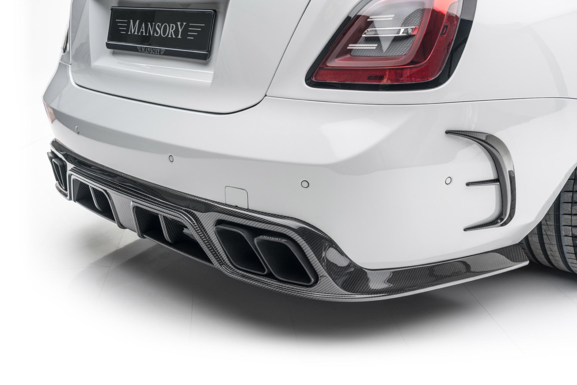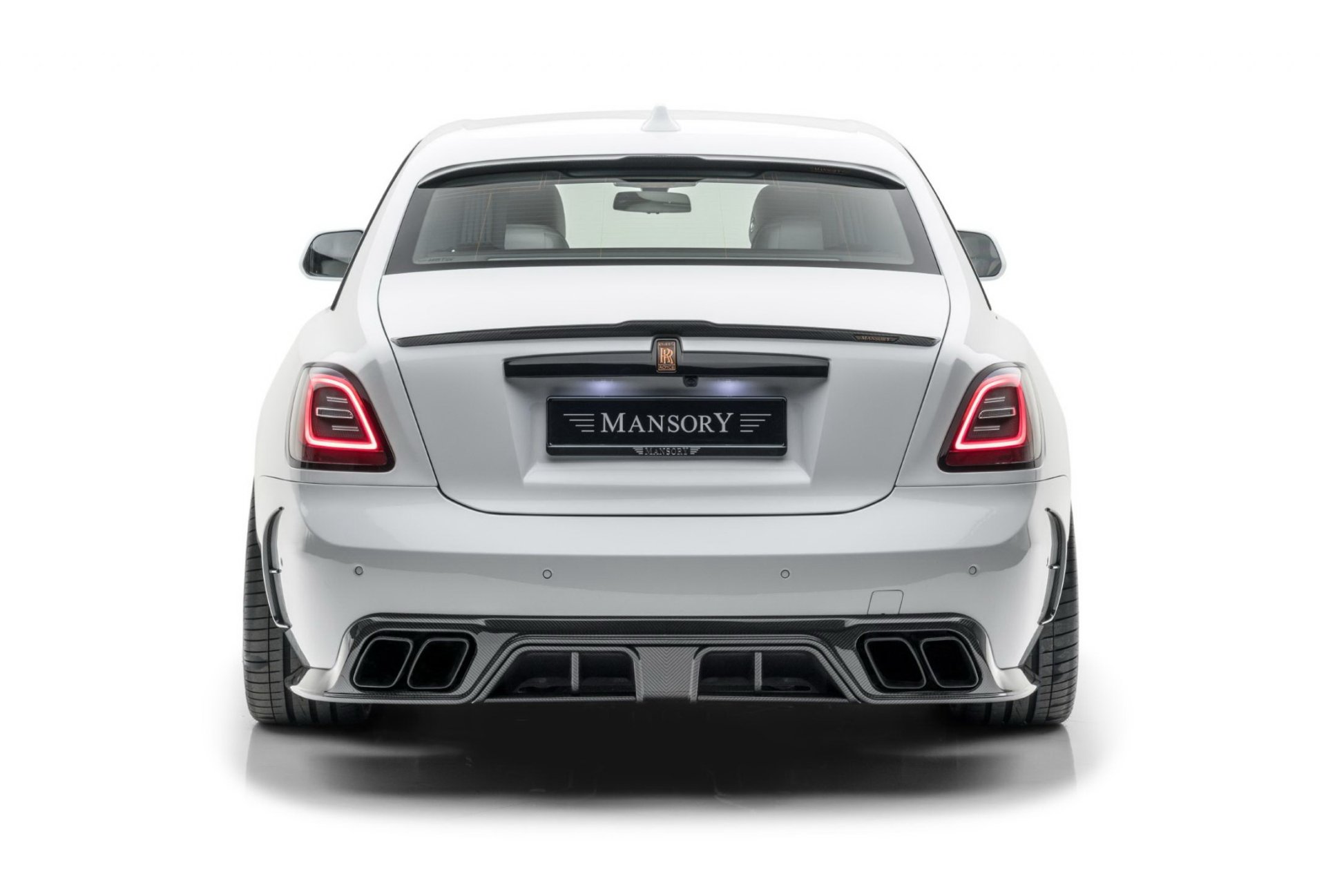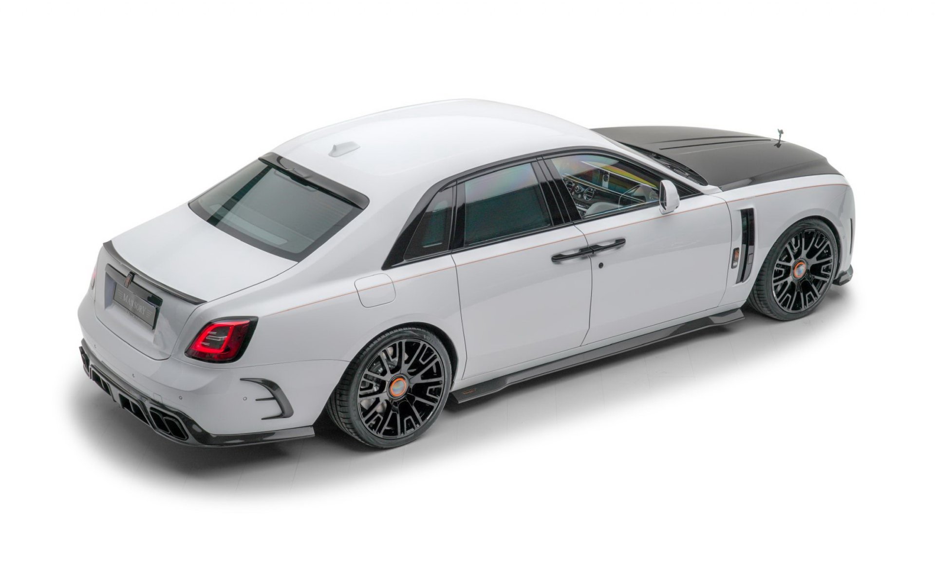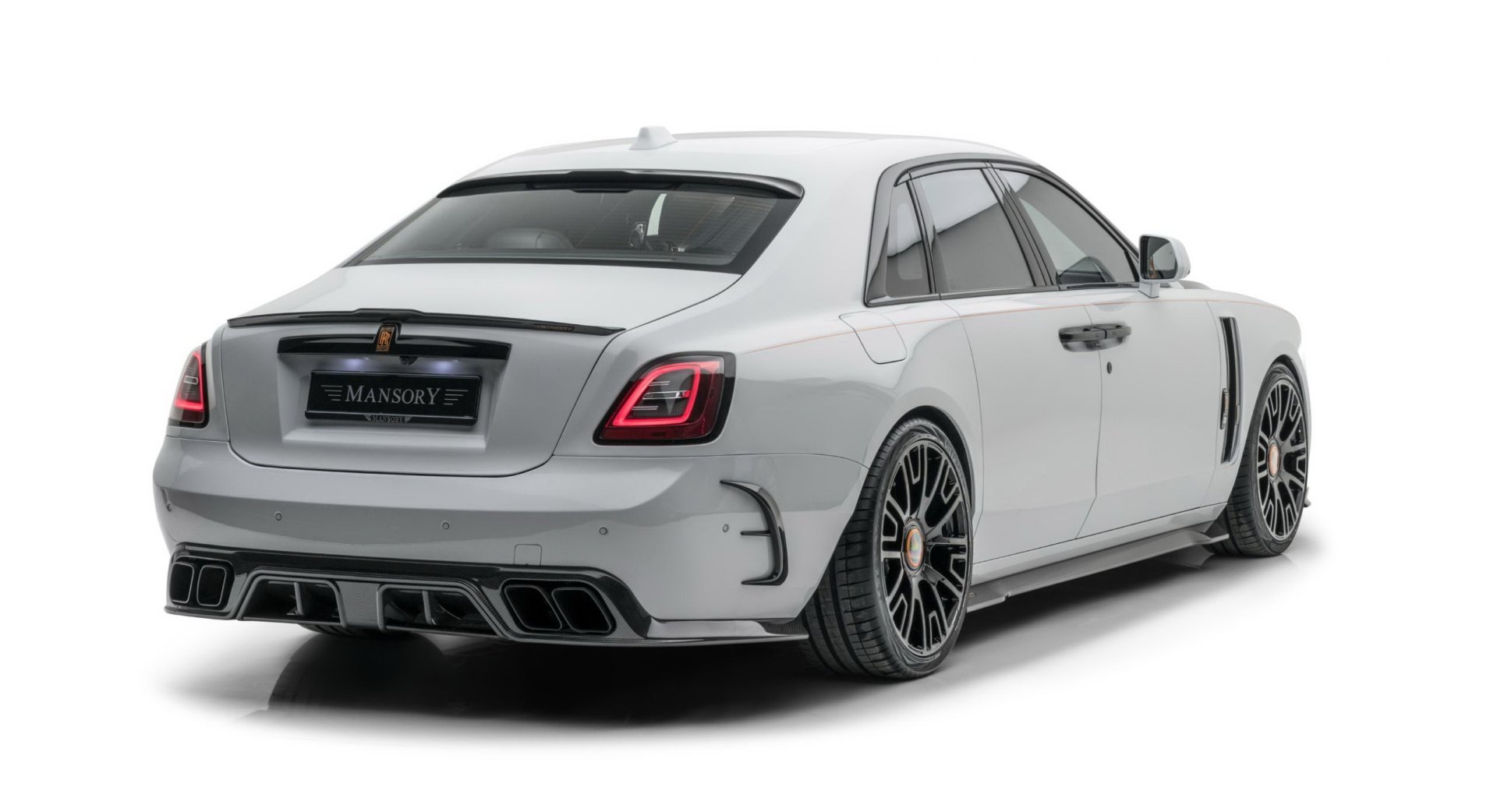 RR Ghost Mansory รูปลักษณ์ปรับเปลี่ยนแบบจัดเต็มตั้งแต่ชุดกระจังหน้าใหม่พร้อมไฟเรืองแรงสีส้ม กันชนหน้าใหม่เพิ่มไฟ DRL, ช่องลมข้างตัวรถ, ฝากระโปรงหน้าใหม่, สกิร์ตข้างใหม่, มือจับประตู, สปอยเลอร์เหนือหลังคา, ปีกท้ายตูดเป็ด และที่เด่นมากคือกันชนดิฟฟิวเซอร์ท้ายที่ทำปลายท่อไอเสียขนาดใหญ่ถึง 4 รู ได้ล้อชุดใหม่ทรงหรูสีดำเงา ขนาด 22 นิ้ว ทั้งสี่ล้อ สวมพร้อมยางสมรรถนะสูงไซด์หน้า 265/35 R22 และหลัง 295/30 R22