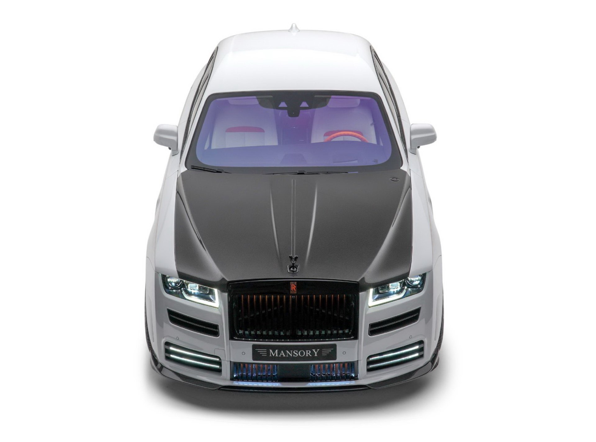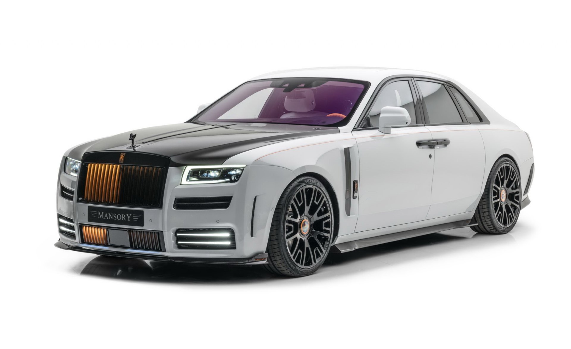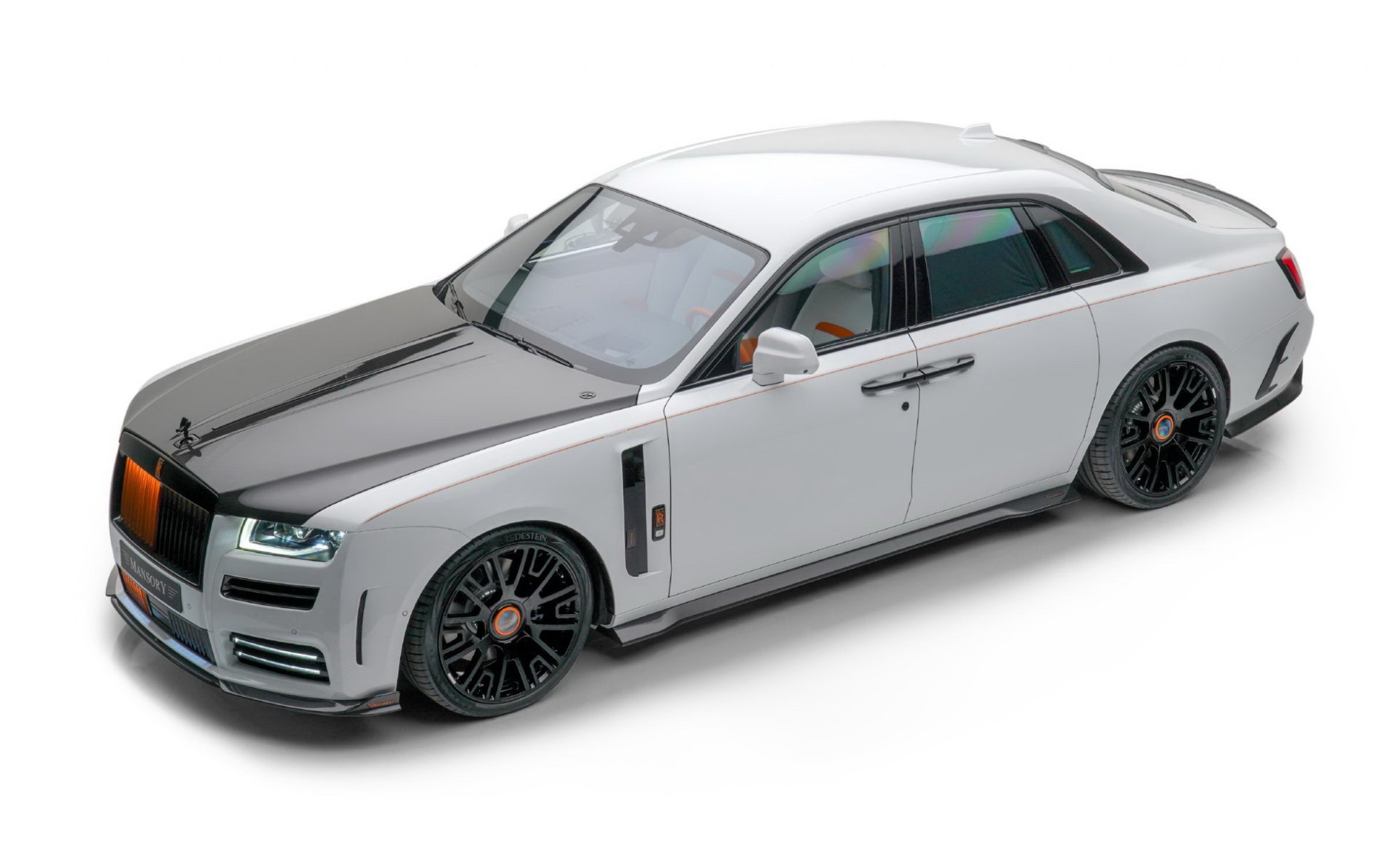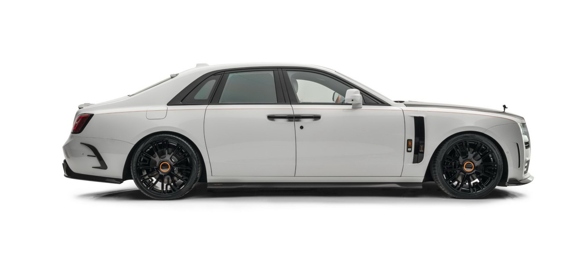 RR Ghost Mansory รูปลักษณ์ปรับเปลี่ยนแบบจัดเต็มตั้งแต่ชุดกระจังหน้าใหม่พร้อมไฟเรืองแรงสีส้ม กันชนหน้าใหม่เพิ่มไฟ DRL, ช่องลมข้างตัวรถ, ฝากระโปรงหน้าใหม่, สกิร์ตข้างใหม่, มือจับประตู, สปอยเลอร์เหนือหลังคา, ปีกท้ายตูดเป็ด และที่เด่นมากคือกันชนดิฟฟิวเซอร์ท้ายที่ทำปลายท่อไอเสียขนาดใหญ่ถึง 4 รู ได้ล้อชุดใหม่ทรงหรูสีดำเงา ขนาด 22 นิ้ว ทั้งสี่ล้อ สวมพร้อมยางสมรรถนะสูงไซด์หน้า 265/35 R22 และหลัง 295/30 R22