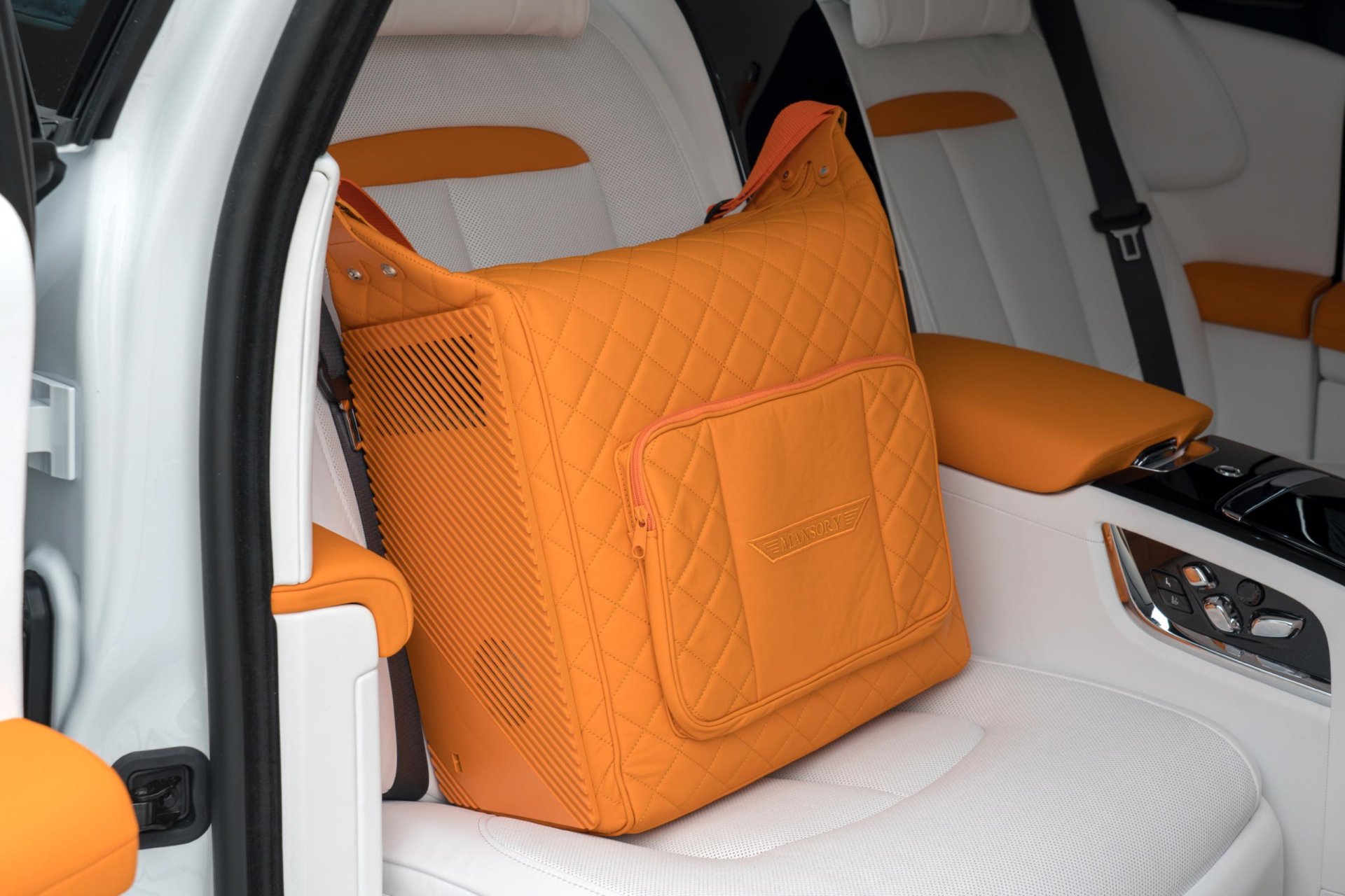 ภายในห้องโดยสารยังคงหรูตามแบบฉบับ RR ทาง Mansory เลือกใช้เบาะหนังแท้สีขาว สลับกับสีส้ม Mandarin ให้โดดเด่นขึ้น มีคิ้วบันไดคาร์บอนฯ พวงมาลัยเปลี่ยนใหม่ทรงสปอร์ตจับกระชับมือขึ้น ติดตั้งไฟ LED เพิ่มบรรยากาศ และกระเป๋าสีส้มที่วางอยู่เบาะหลังเป็นของที่ต้องซื้อเพิ่ม มันคือกระเป๋าเก็บความเย็นขนาด 14 ลิตร มีสีให้เลือกตามความชอบ