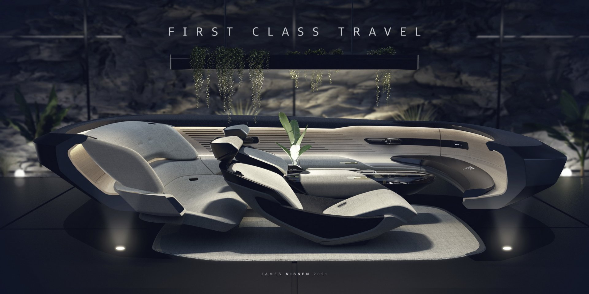 ภายในห้องโดยสารออกแบบมาเน้นกว้างโปร่งสบายด้วยกระจกชิ้นใหญ่รอบด้าน เหมือนอยู่ใน Lounge หรูระดับเฟิร์สคลาส เน้นใช้วัสดุยั่งยืนคุณภาพสูงทั้ง ไม้และขนสัตว์, ผ้าทอสังเคราะห์ และโลหะ รถคันนี้ไม่มีหน้าจอเหมือนรถทั่วไป แต่จะใช้การฉายภาพลงบนพื้นผิวไม้อัดฮอร์นบีมแทน กลายเป็นพื้นที่นอนดูหนัง หรือจะใช้สำหรับประชุมทางวิดีโอก็ได้ สำหรับพวงมาลัยกับแป้นคันเร่งยังมีในรถคันนี้ แต่เมื่อคุณใช้โหมดการขับขี่อัตโนมัติระดับ 4 ตัวรถจะซ่อนทั้งพวงมาลัย และคันเร่งไปทันที
