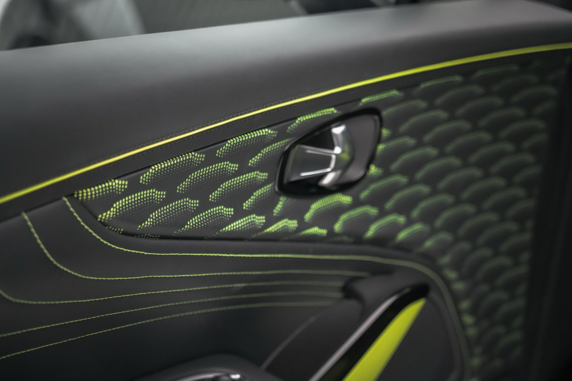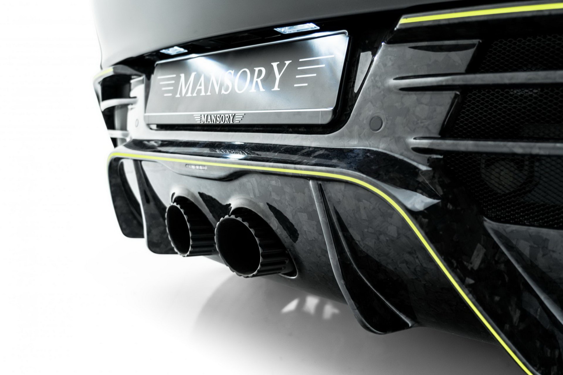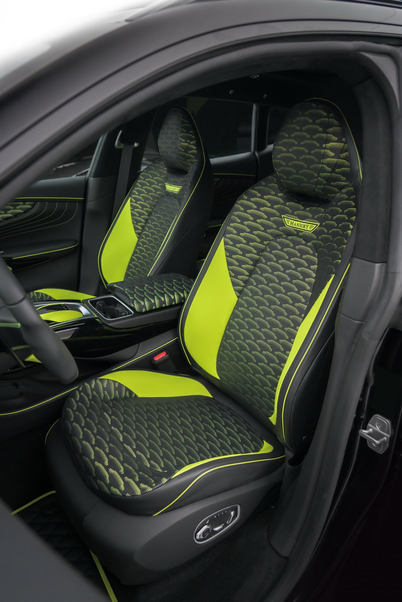 ห้องโดยสารยังล้อกับภายนอก ด้วยการใช้โทนสีดำตัดสีเขียว Limegreen เน้นใช้วัสดุหนังทั้งหมด เบาะนั่งกับแผงประตูมองผ่านๆ อาจนึกว่าผ้า แต่เป็นหนังที่มีการเจาะรูเป็นลวดลายซึ่งเผยให้เห็นสีเขียวที่ซ้อนทับอยู่ข้างใต้ถือเป็นไอเดียที่ดีทีเดียว พวงมาลัยก็เปลี่ยนโลโก้เป็นของ Mansory พรมปูพื้นสั่งทำพิเศษ และคาร์บอนไฟเบอร์ที่เพิ่มความดุดัน