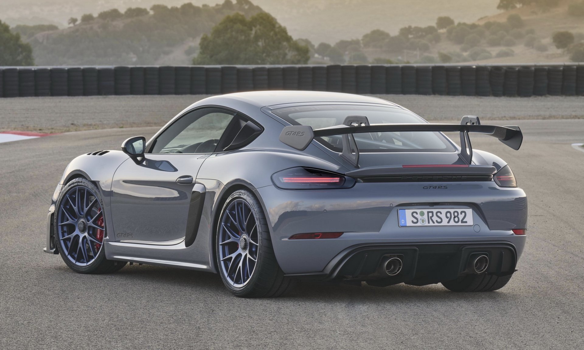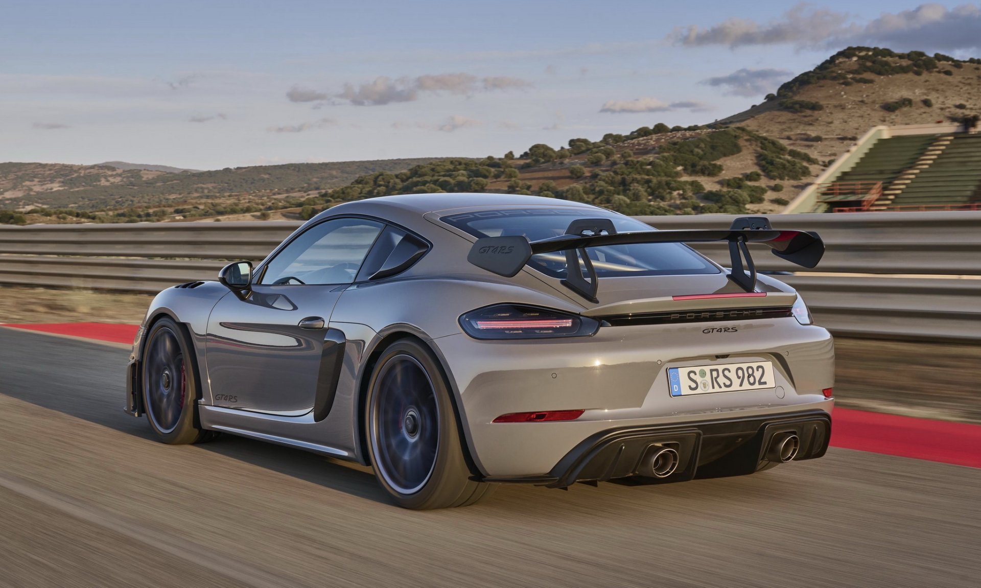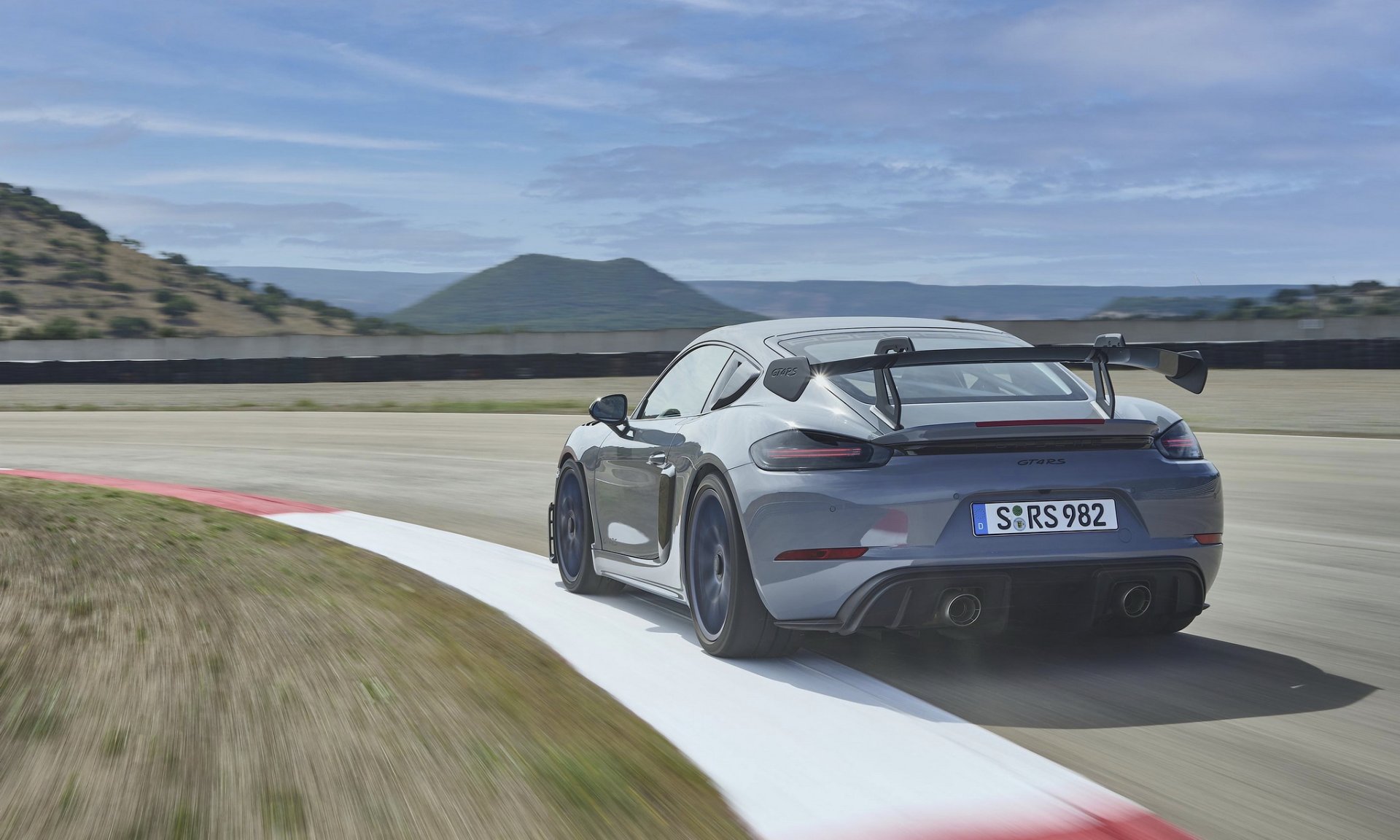 718 Cayman GT4 RS รถถนนจิตวิญญาณรถแข่ง รูปลักษณ์ภายนอกดุกว่า Cayman รุ่นอื่นชัดเจน เริ่มจากด้านหน้า กันชนจะได้ดิฟฟิวเซอร์แบบปรับได้บวกกับช่องม่านอากาศด้านข้าง ฝากระโปรงทำจากพลาสติกผสมเส้นใยคาร์บอนเสริมแรง (CFRP) เสริมด้วยช่องลม NACA Duct เอาไปช่วยระบายความร้อนระบบเบรก เหนือซุ้มล้อมีช่องบานเกล็ดช่วยระบายแรงดันอากาศส่วนเกินออกจากซุ้มล้อและเพิ่มแรงกด ด้านข้างรถตรงหน้าต่างชิ้นเล็กถูกแทนที่ด้วยช่องดักอากาศส่งเข้าเครื่องยนต์ บั้นท้ายได้ปีกหลังยึดตายตัวขนาดใหญ่ ปรับองศาด้วยมือได้ 4 ระดับ ได้ท่อไอเสียไทเทเนียมลั่นสุดในรุ่น และดิฟฟิวเซอร์ทรงเดียวกับตัว GT4 แต่แอบเสริมครีบด้านข้าง ตัวรถสร้างแรงกดได้มากกว่ารุ่น GT4 ถึง 25% ช่วงล่างมีการปรับจูนใหม่เฉพาะในรุ่น RS ให้ล้ออลูมิเนียมขนาด 20 นิ้ว แบบ Center Lock เป็นมาตรฐาน และล้อแบบแม็กนีเซียมให้จ่ายเงินเพิ่ม เบรกใช้จานเหล็ก ด้านหน้าขนาด 408 มม. คาลิปเปอร์ 6 สูบ และด้านหลังขนาด 380 มม. คาลิปเปอร์ 4 สูบ ส่วนจานคาร์บอน-เซรามิค เป็นออฟชั่นเสริมจะได้ขนาดใหญ่ขึ้น ด้านหน้า 410 มม. กับหลัง 390 มม. แถมเบากว่าแบบเหล็กถึง 50%