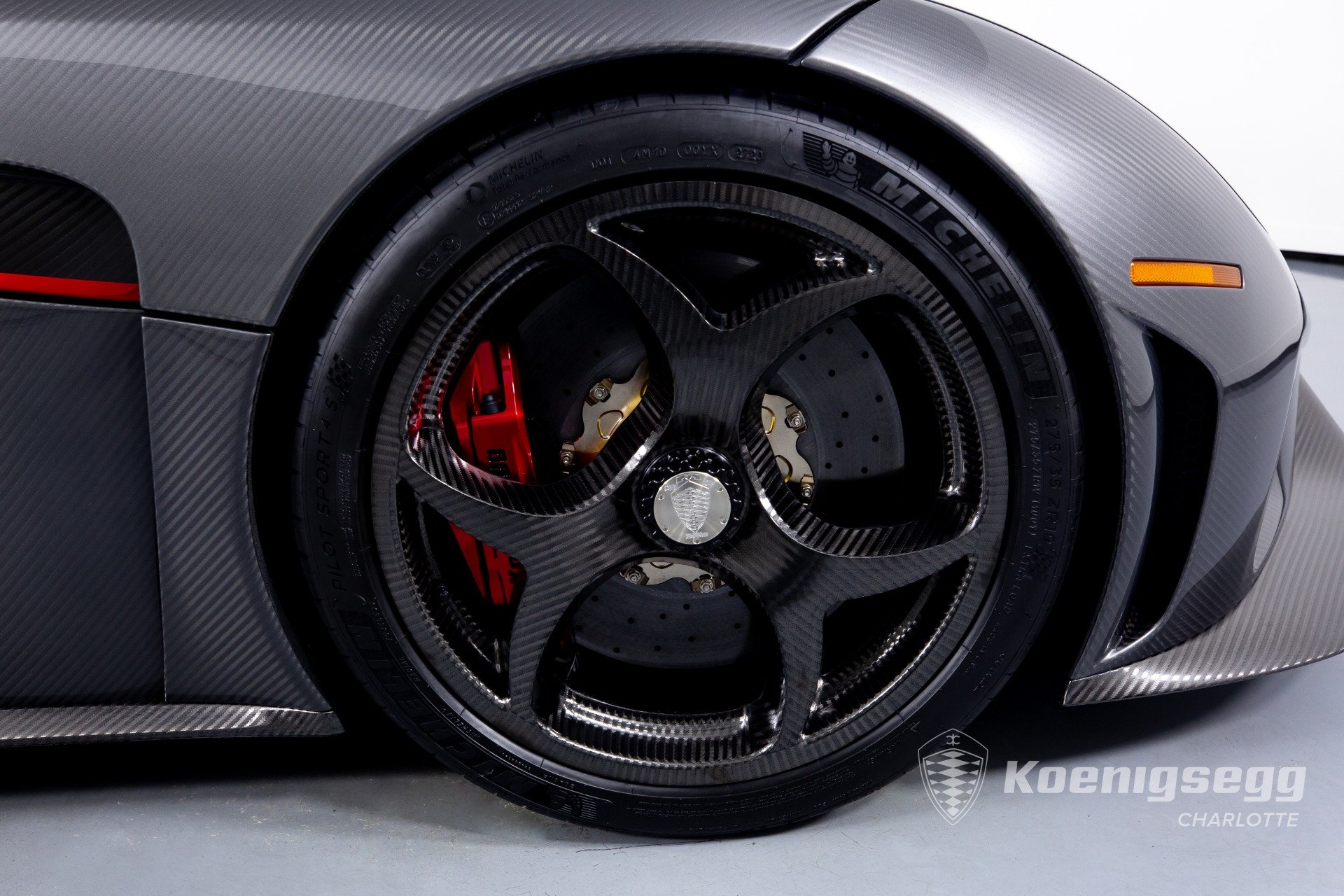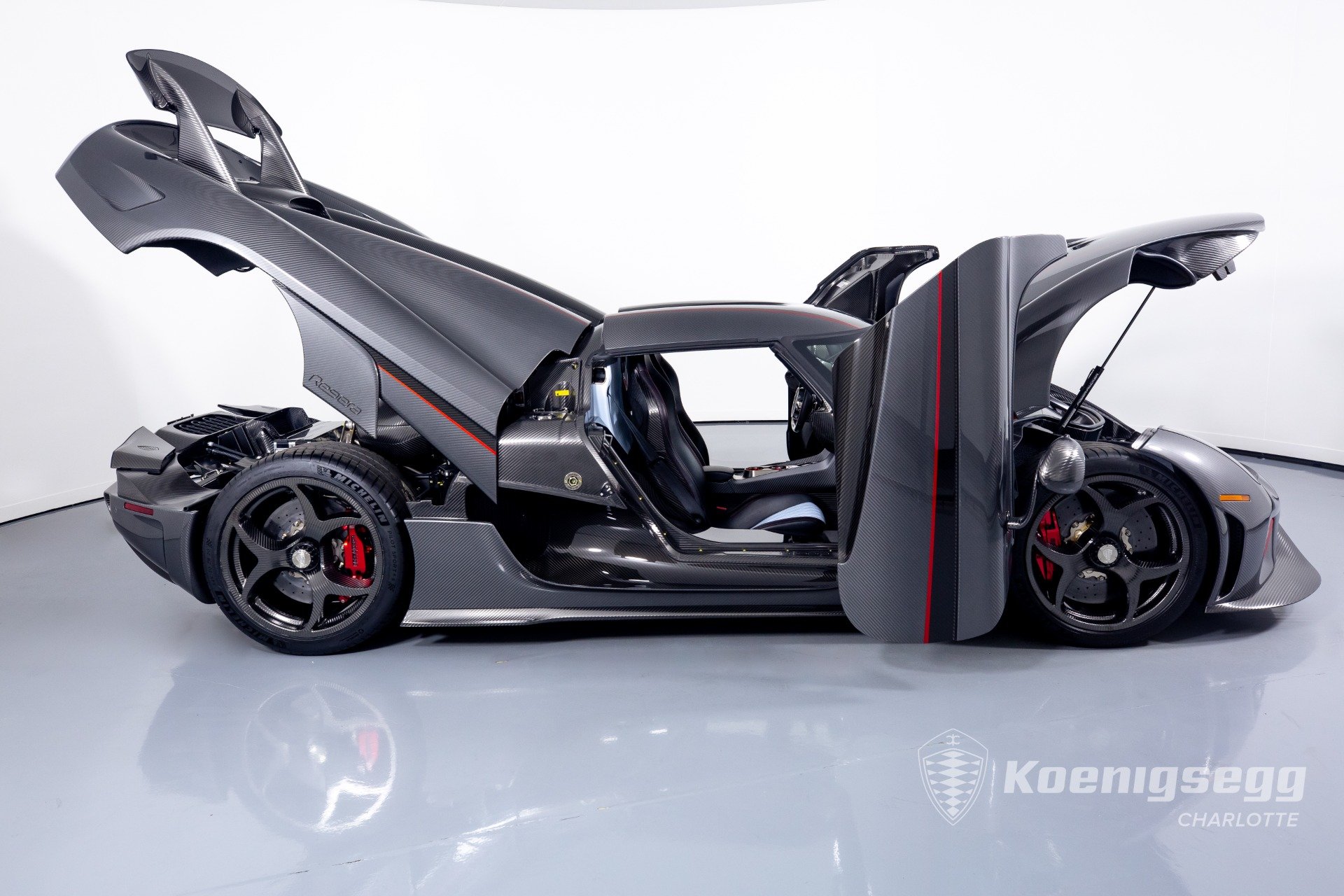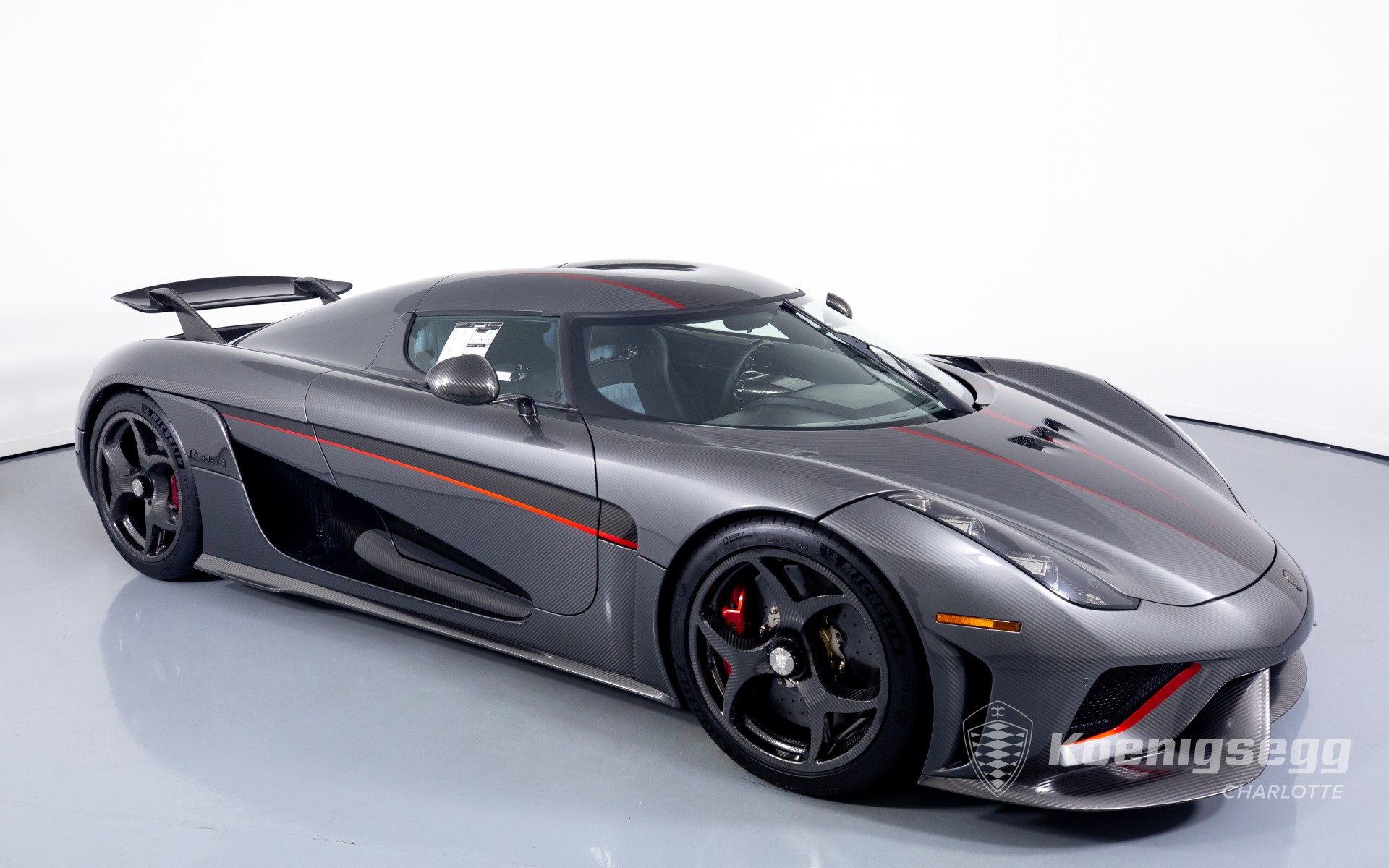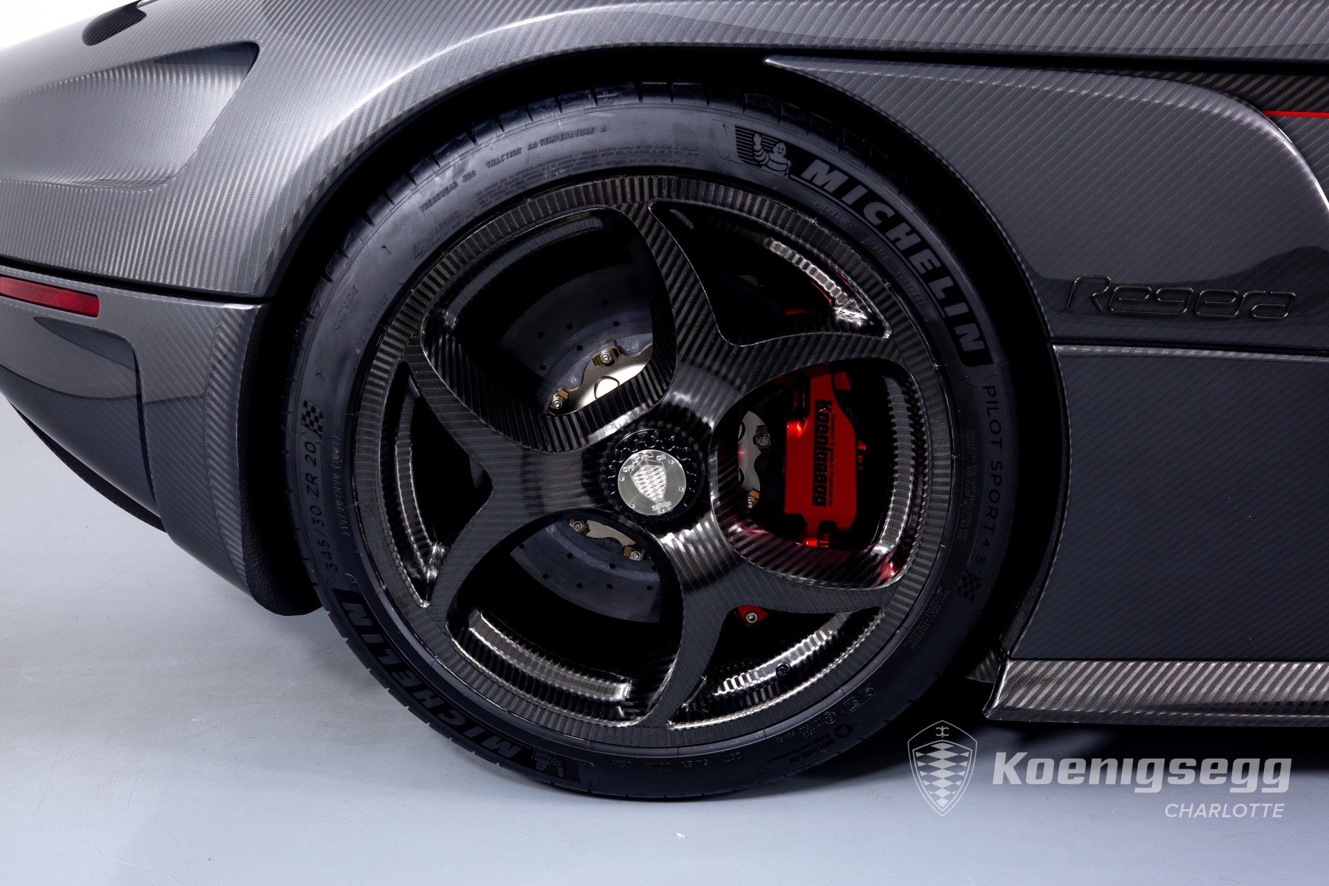 Regera คันนี้สั่งทำพิเศษแบบจัดเต็ม มากับตัวถังงาน Exposed carbon รอบคันสีเงิน Silver Carbon กับตัดเส้นสีแดง Apple Red คาดยาวกลางรถกับด้านข้าง ล้อก็เป็นคาร์บอนไฟเบอร์ Center Lock ขอบหน้า 19 นิ้ว กับหลัง 20 นิ้ว คู่กับจานคาร์บอน-เซรามิก หน้าขนาด 397 มม. หลัง 380 มม. คาลิปเปอร์สีแดงสด