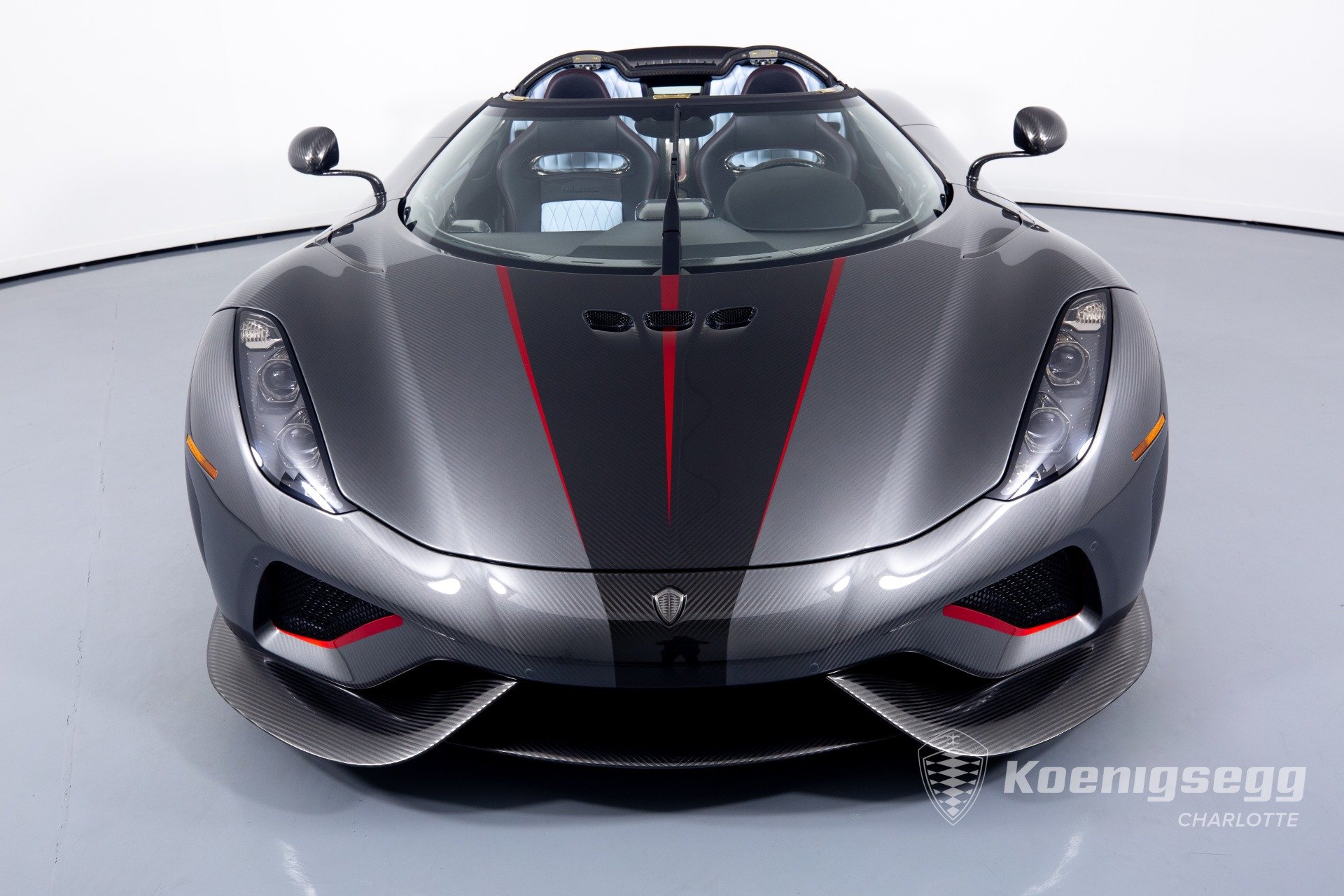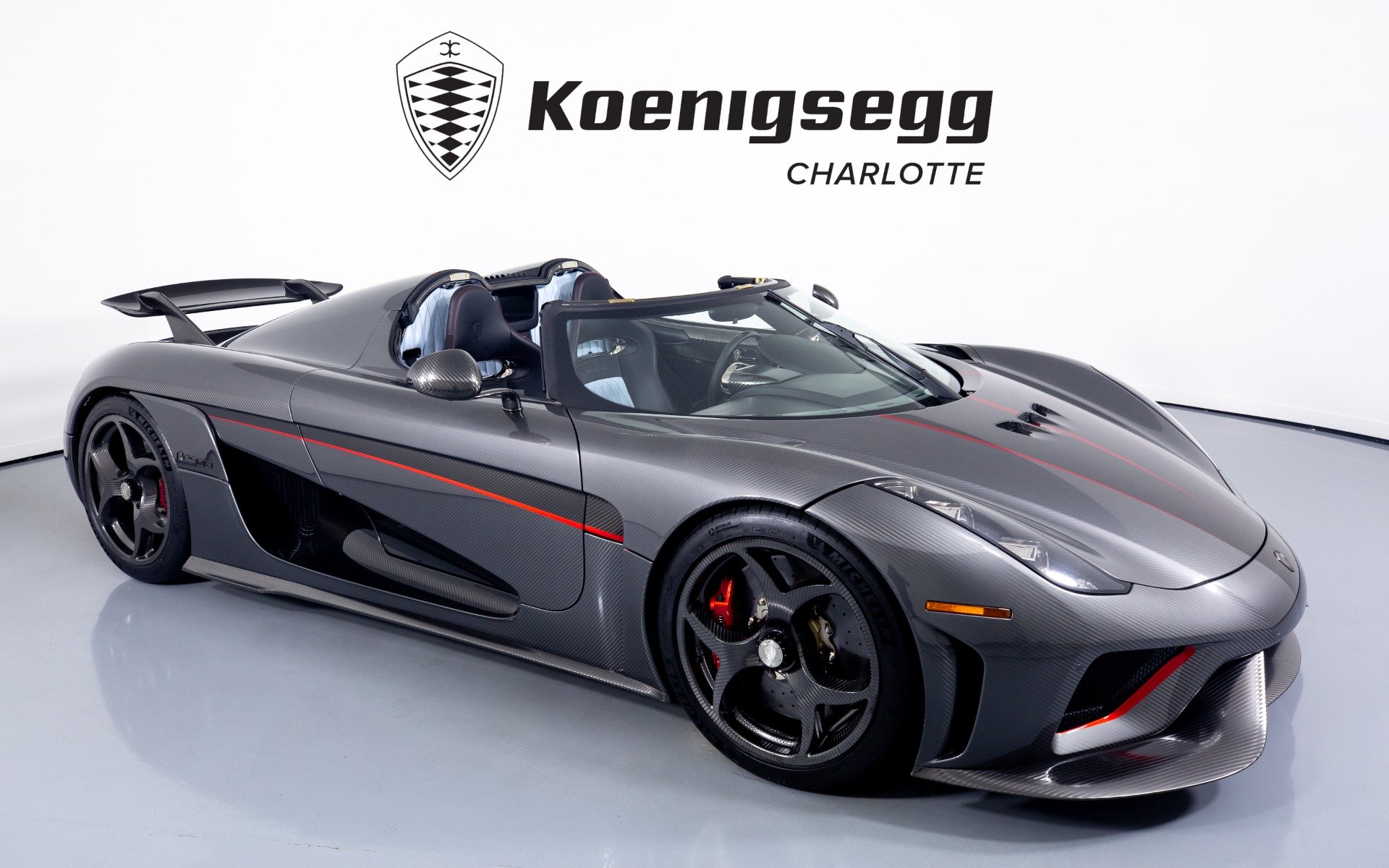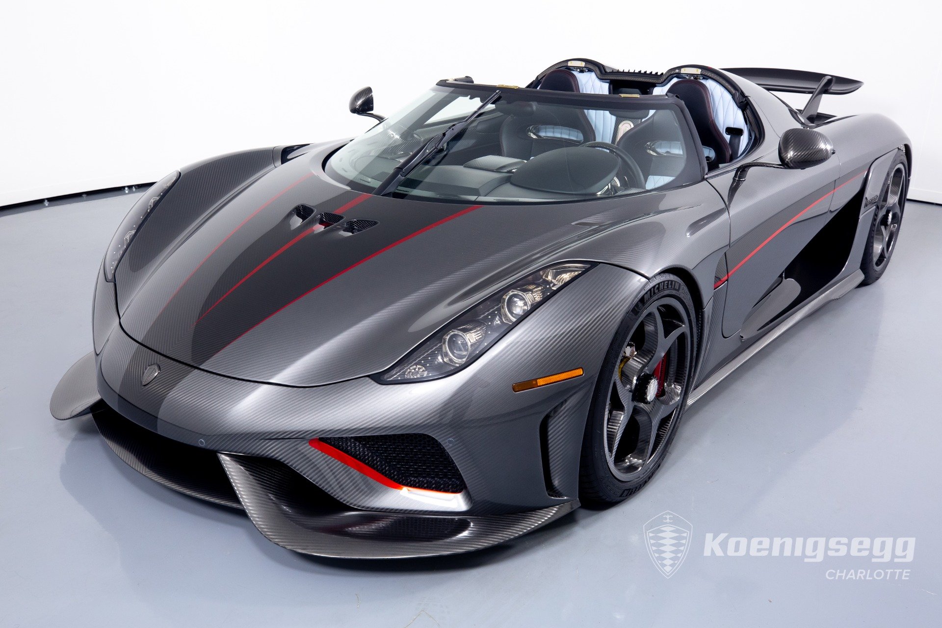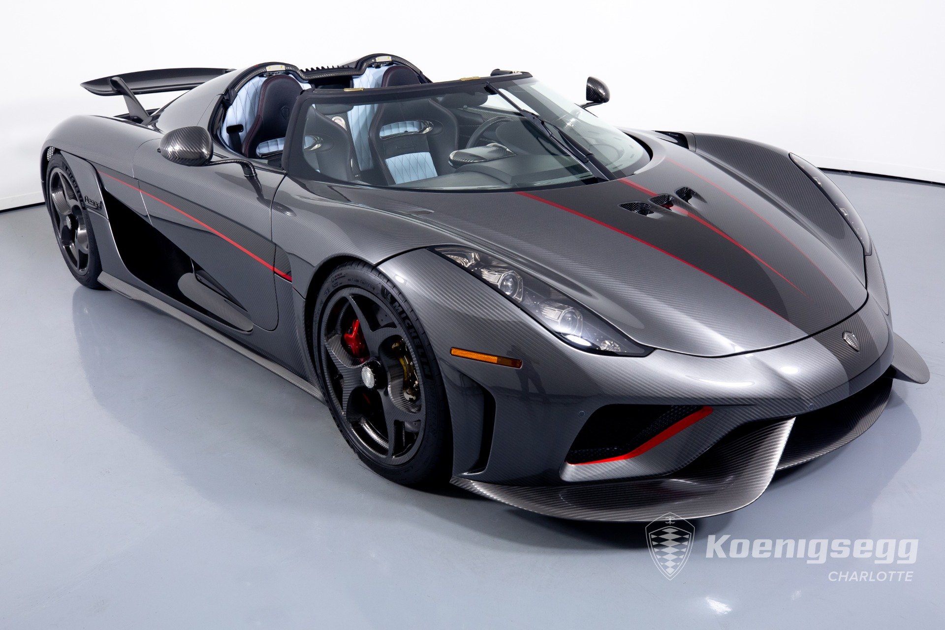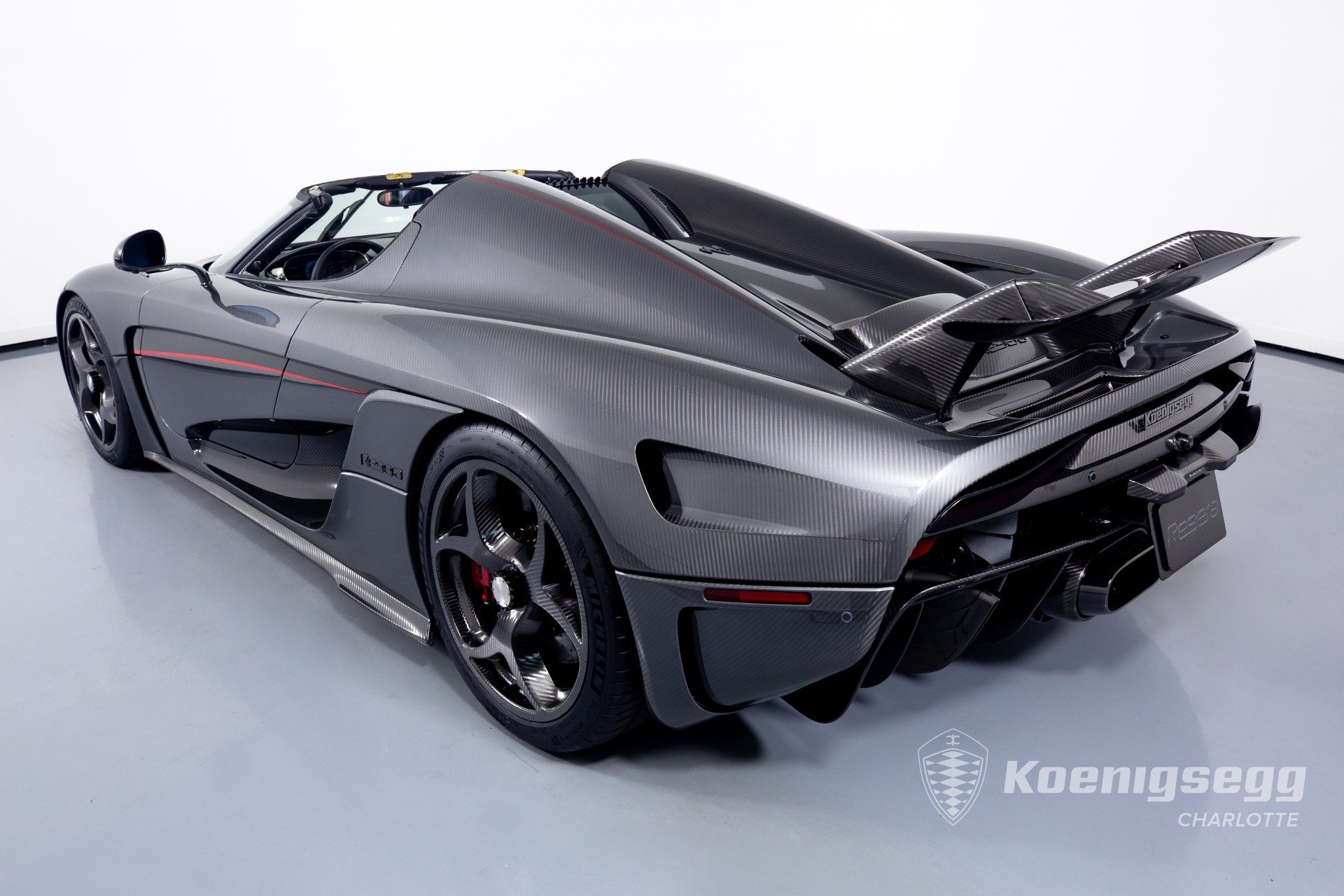Regera คันนี้สั่งทำพิเศษแบบจัดเต็ม มากับตัวถังงาน Exposed carbon รอบคันสีเงิน Silver Carbon กับตัดเส้นสีแดง Apple Red คาดยาวกลางรถกับด้านข้าง ล้อก็เป็นคาร์บอนไฟเบอร์ Center Lock ขอบหน้า 19 นิ้ว กับหลัง 20 นิ้ว คู่กับจานคาร์บอน-เซรามิก หน้าขนาด 397 มม. หลัง 380 มม. คาลิปเปอร์สีแดงสด