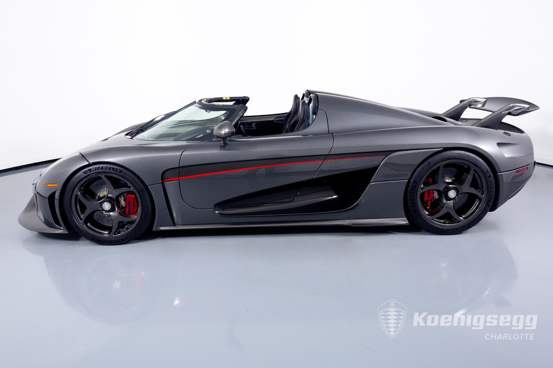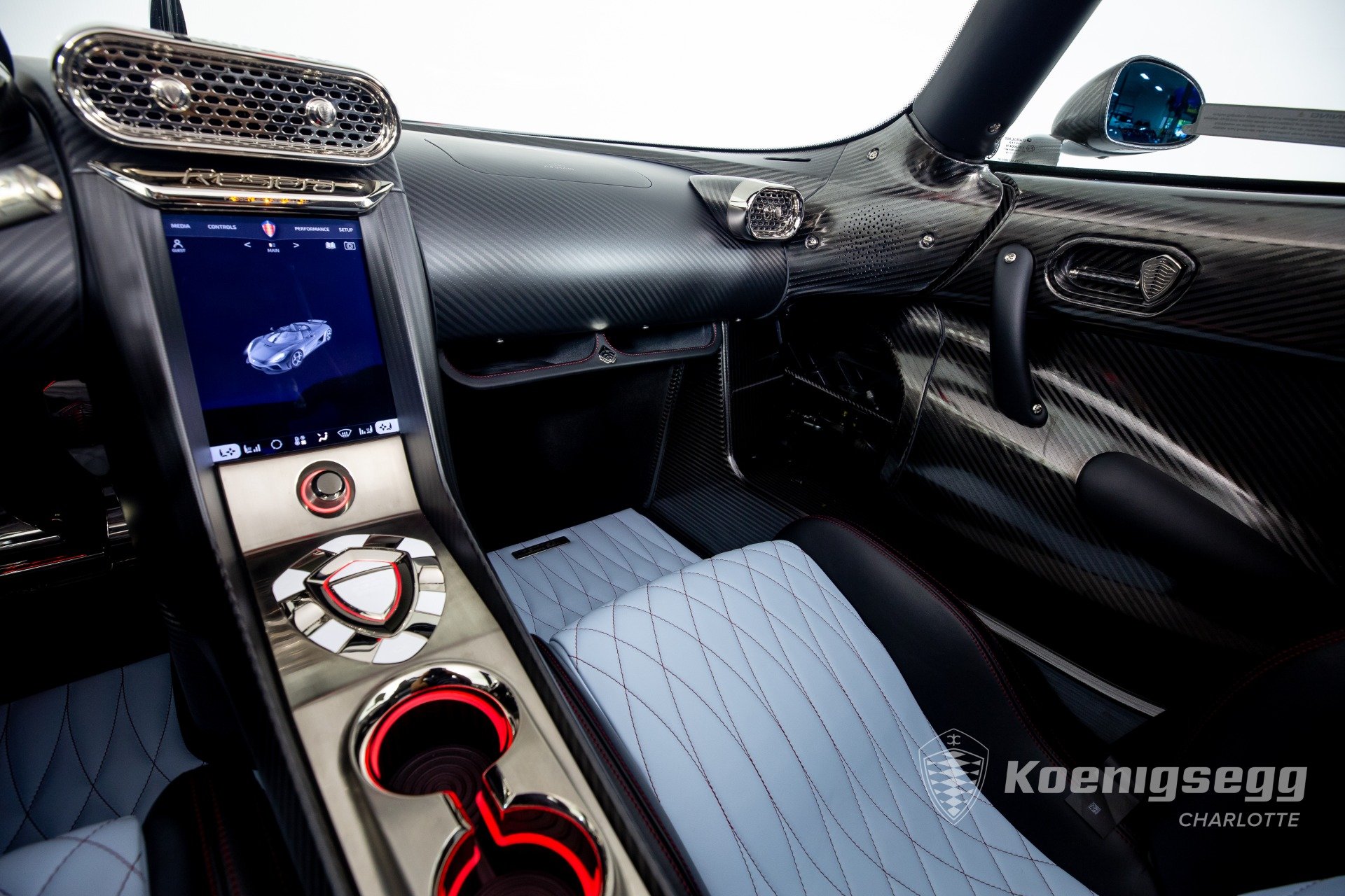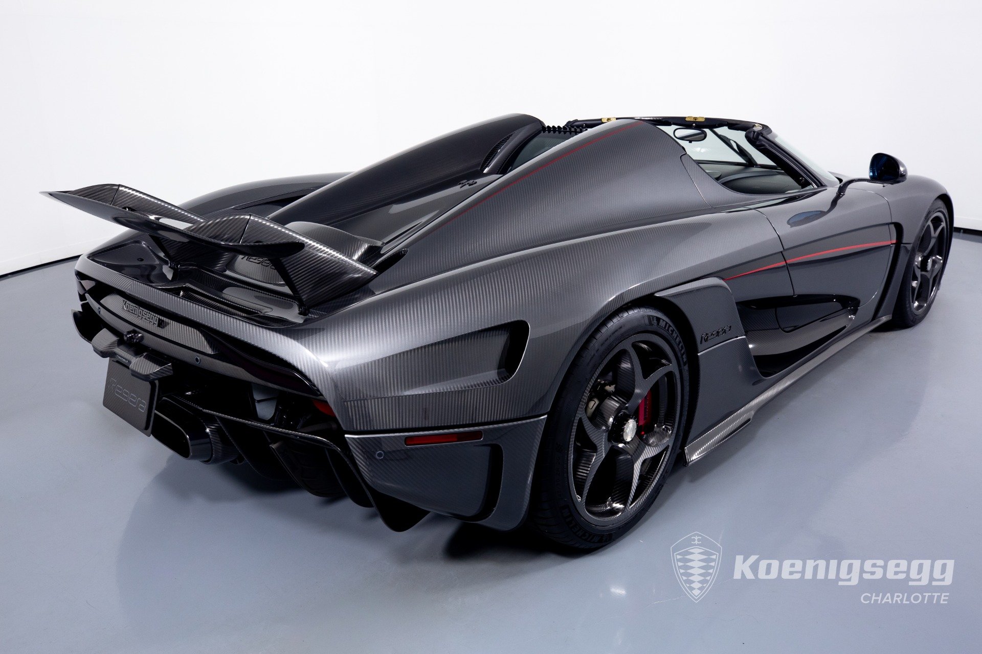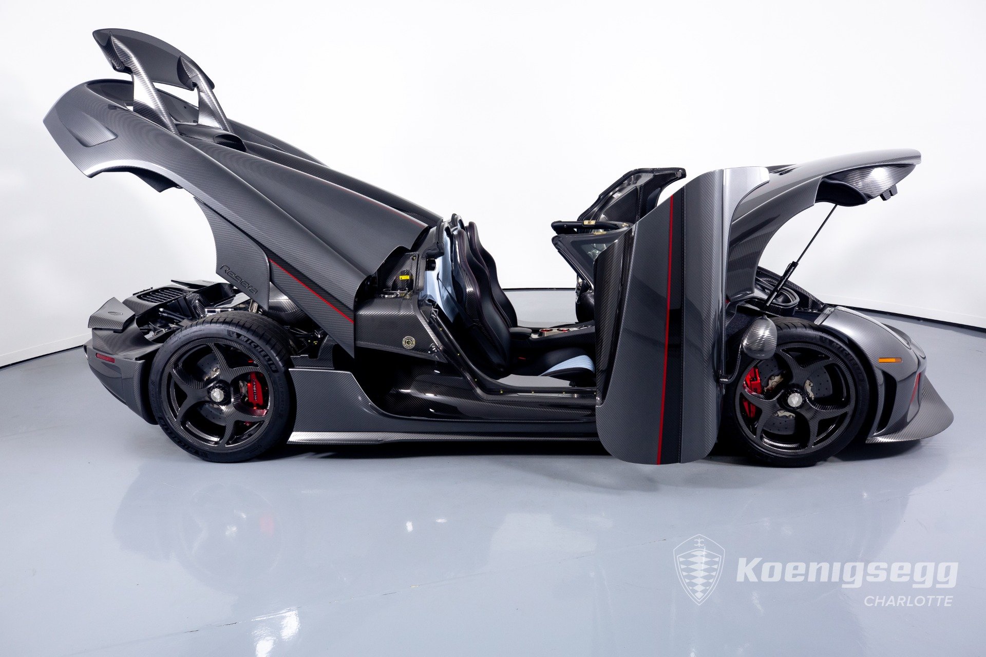 Regera คันนี้สั่งทำพิเศษแบบจัดเต็ม มากับตัวถังงาน Exposed carbon รอบคันสีเงิน Silver Carbon กับตัดเส้นสีแดง Apple Red คาดยาวกลางรถกับด้านข้าง ล้อก็เป็นคาร์บอนไฟเบอร์ Center Lock ขอบหน้า 19 นิ้ว กับหลัง 20 นิ้ว คู่กับจานคาร์บอน-เซรามิก หน้าขนาด 397 มม. หลัง 380 มม. คาลิปเปอร์สีแดงสด