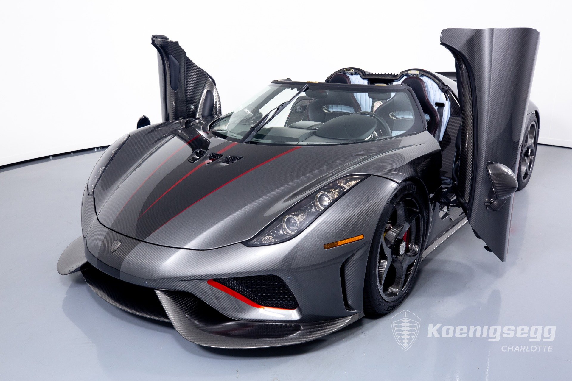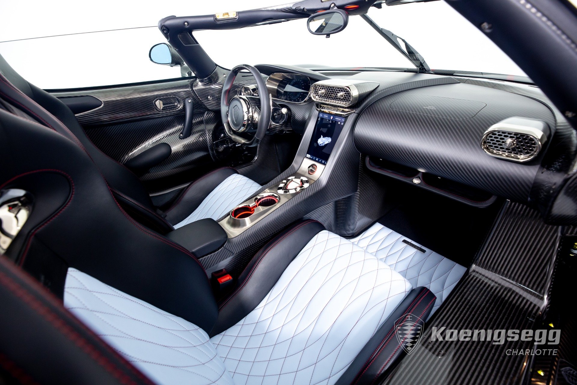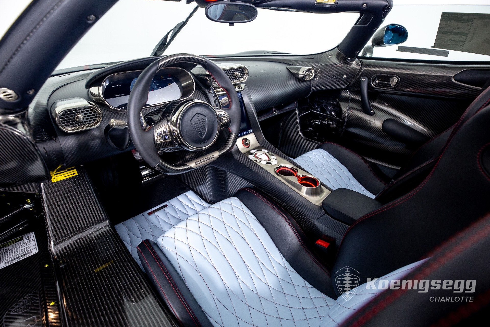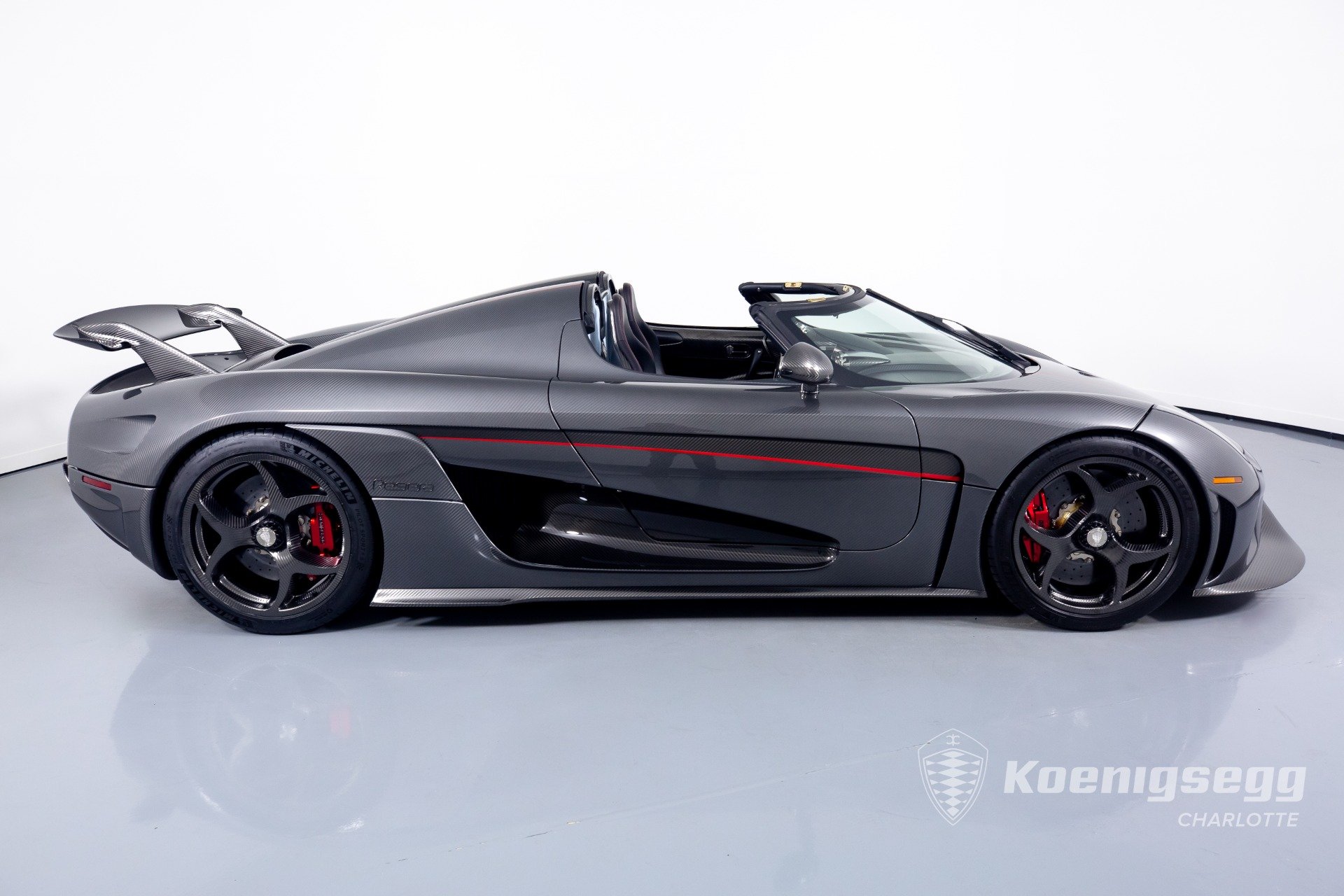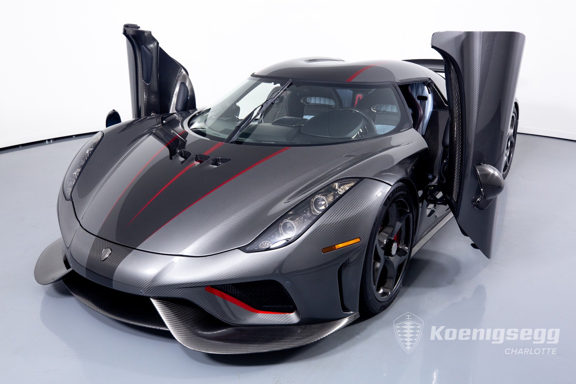 Regera คันนี้สั่งทำพิเศษแบบจัดเต็ม มากับตัวถังงาน Exposed carbon รอบคันสีเงิน Silver Carbon กับตัดเส้นสีแดง Apple Red คาดยาวกลางรถกับด้านข้าง ล้อก็เป็นคาร์บอนไฟเบอร์ Center Lock ขอบหน้า 19 นิ้ว กับหลัง 20 นิ้ว คู่กับจานคาร์บอน-เซรามิก หน้าขนาด 397 มม. หลัง 380 มม. คาลิปเปอร์สีแดงสด