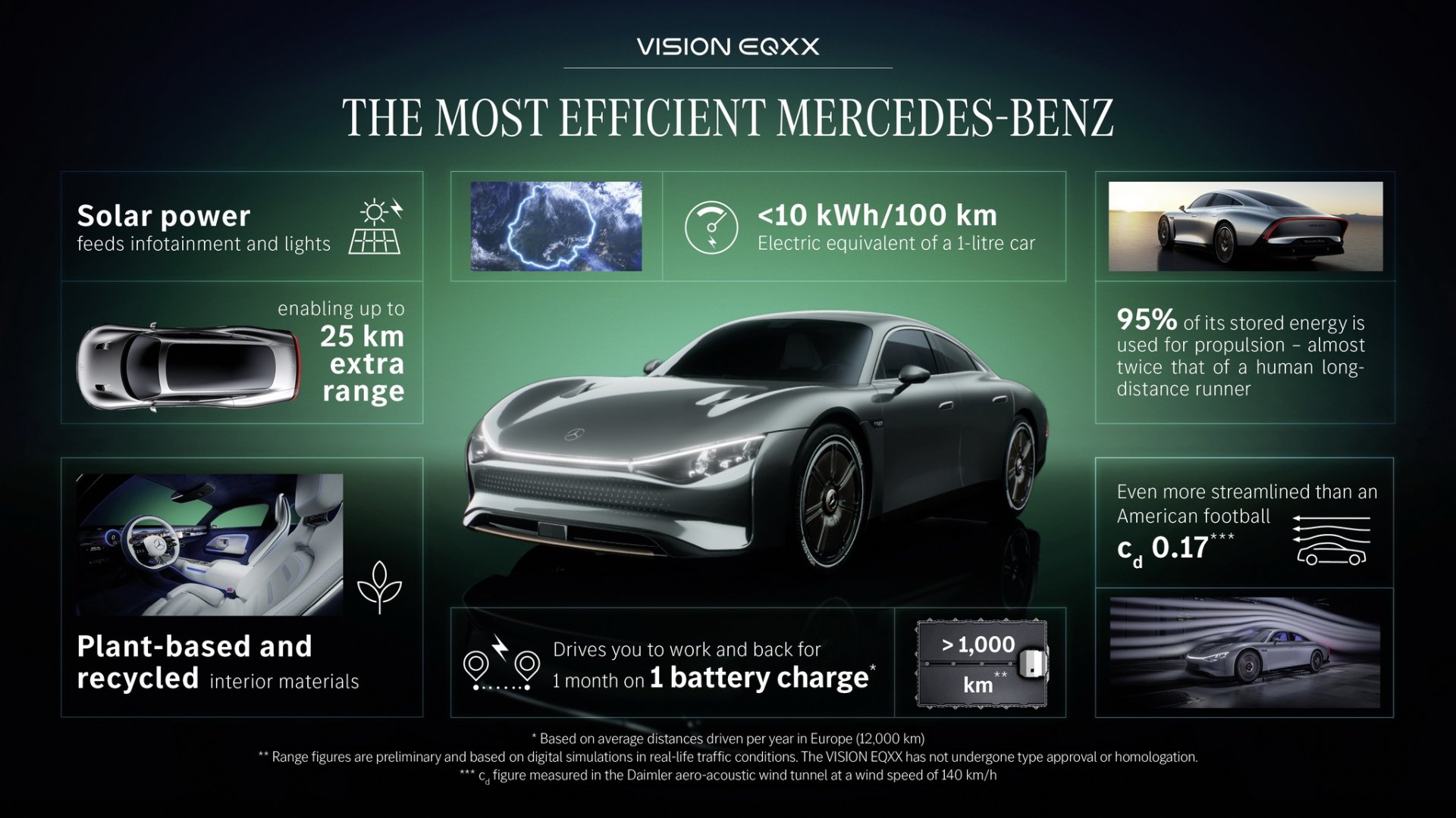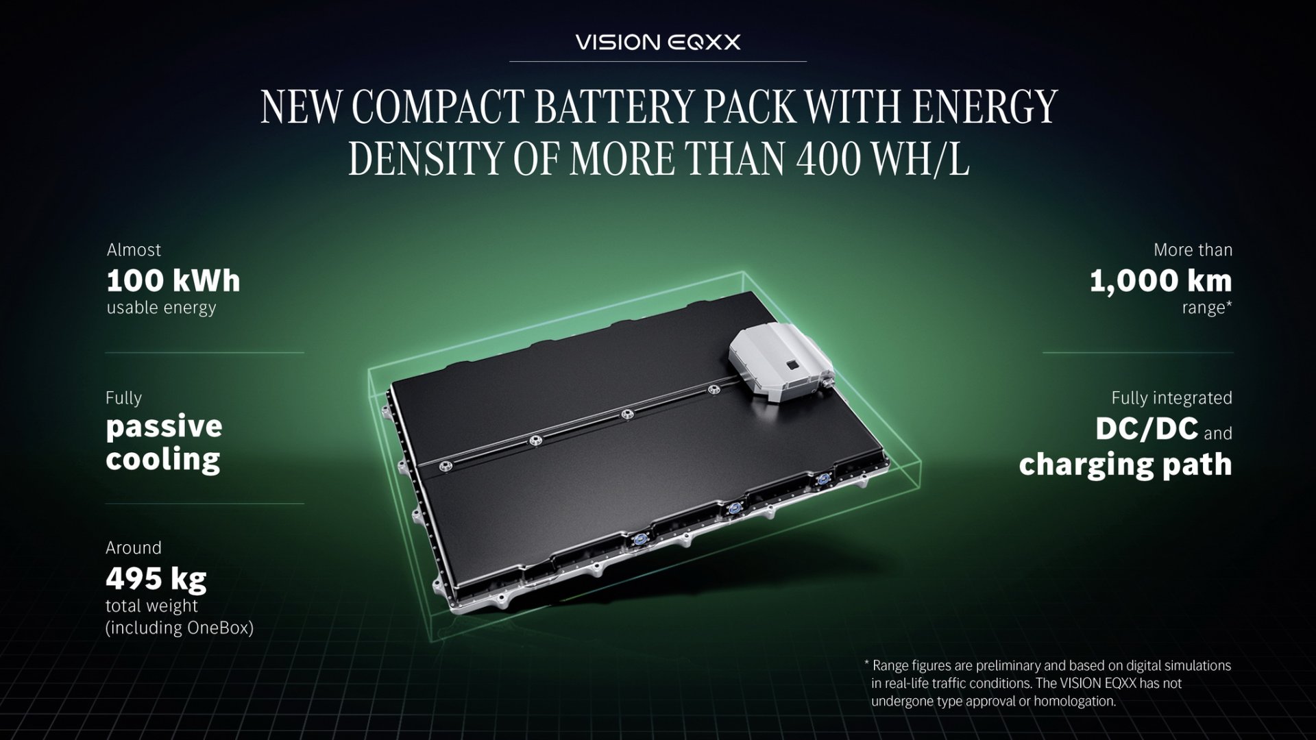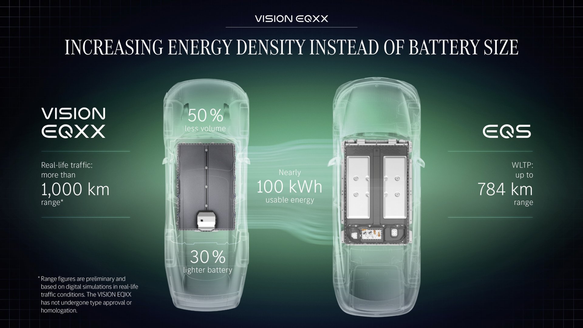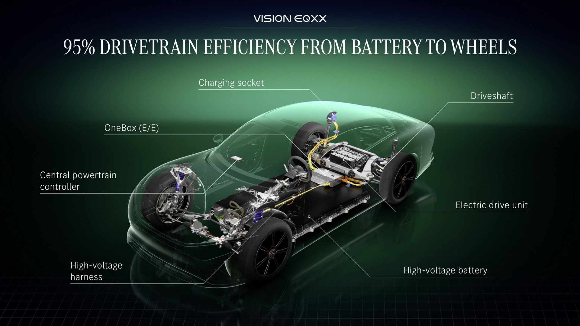 จุดเด่นหลักของ VISION EQXX ไม่ใช่รถไฟฟ้าที่เน้นทำความเร็วสูง แต่จะเน้นไปที่ระยะการเดินทางที่สูงกว่า 1,000 กม. ต่อการชาร์จเพียงครั้งเดียว ตัวแบตเตอรี่จะเป็นเทคโนโลยีใหม่ล่าสุดขนาด 900 โวลท์ กินไฟน้อยกว่า 10 kWh ต่อ 100 กิโลเมตร มีความจุพอๆ กับรุ่น EQS แต่มีขนาดเล็กกว่าเดิม 50% และน้ำหนักเบากว่าเดิม 30% สำหรับการขับเคลื่อนจะใช้มอเตอร์ไฟฟ้าเพียง 1 ตัว ติดตั้งอยู่ระหว่างล้อคู่หลัง ให้พละกำลัง 150 กิโลวัตต์ หรือราวๆ 203 แรงม้า