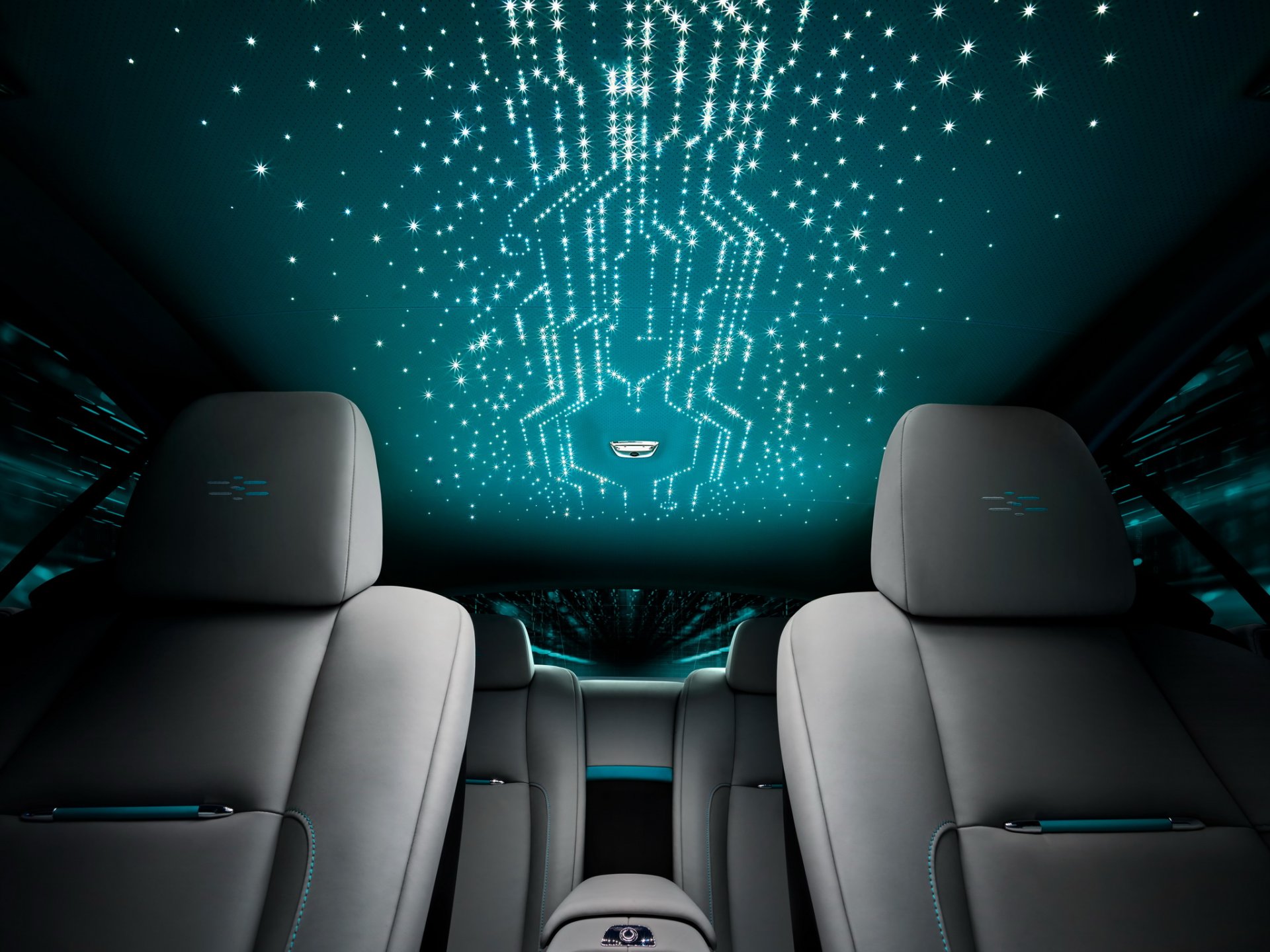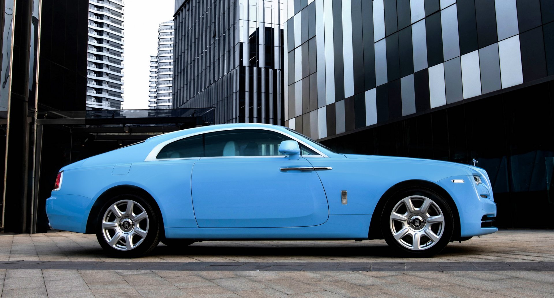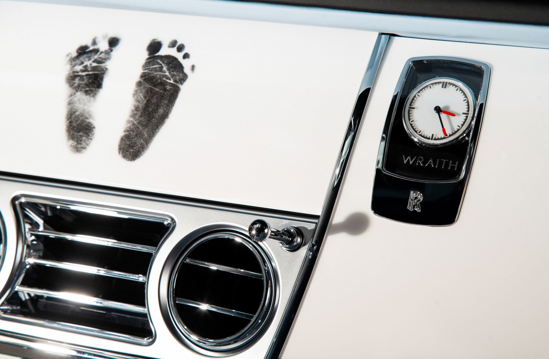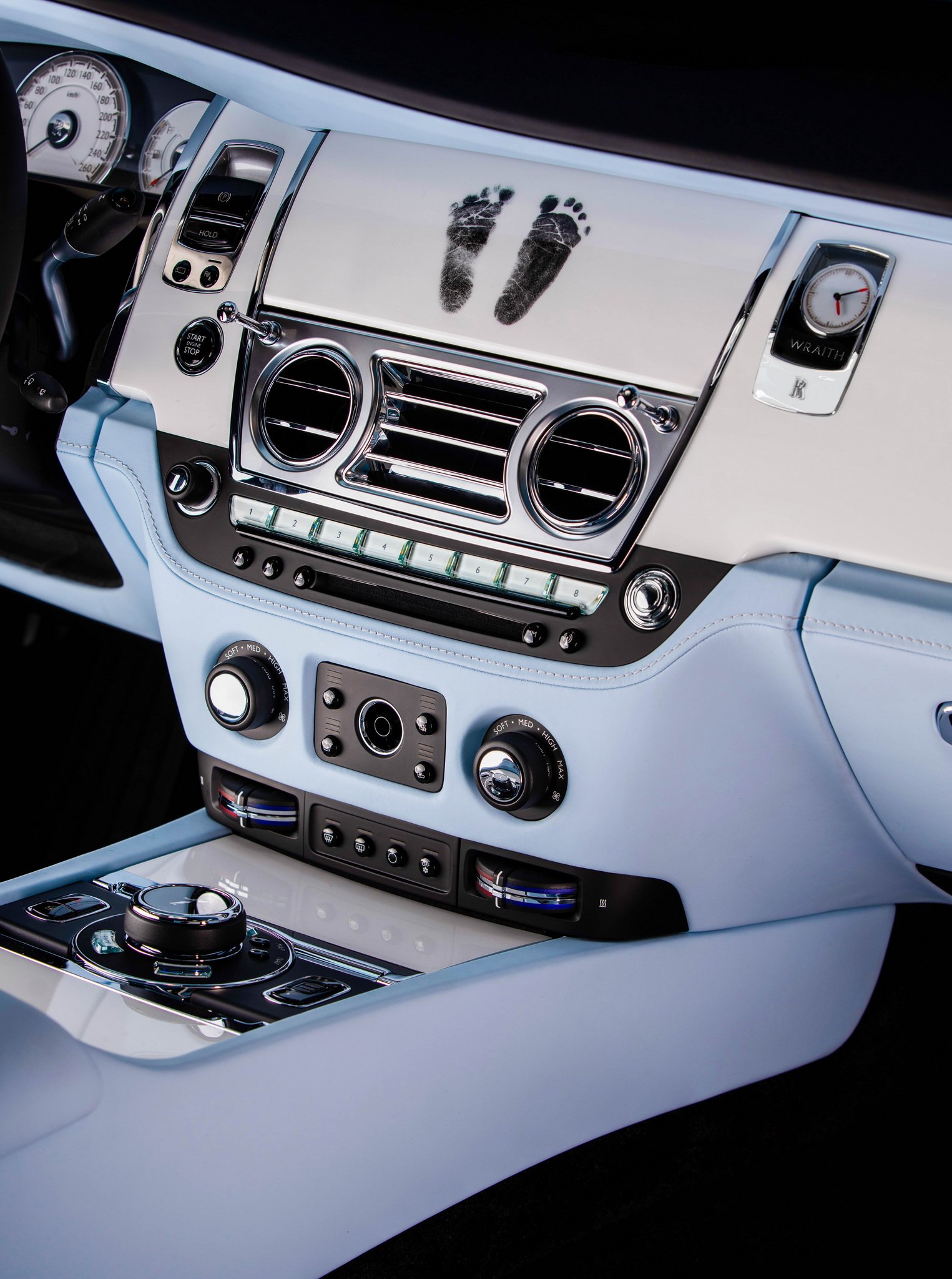 Wraith สั่งทำพิเศษจากลูกค้าผู้หญิงรายหนึ่งในเซี่ยงไฮ้ ตัวถังสีฟ้าสดใส Pebble Paradiso ได้แรงบันดาลใจจากชายทะเลเซี่ยงไฮ้ ส่วนเส้น Coachline สั่งทำพิเศษมีลวดลายกล้วยไม้ เรียบๆ ด้วยสีขาวครีม Seashell ภายในดูละมุนด้วยแผงคอนโซลหน้าสีขาว Piano White ที่ถูกประทับรอยเท้าเด็กผู้หญิงไว้ (ลูกเขา) ส่วนโซนวัสดุหนังเป็นแบบทูโทนสีน้ำเงิน Charles Blue และขาวครีม Seashell หลังคา Starlight ก็ทำพิเศษเป็นกลุ่มดาวเฉพาะบุคคล