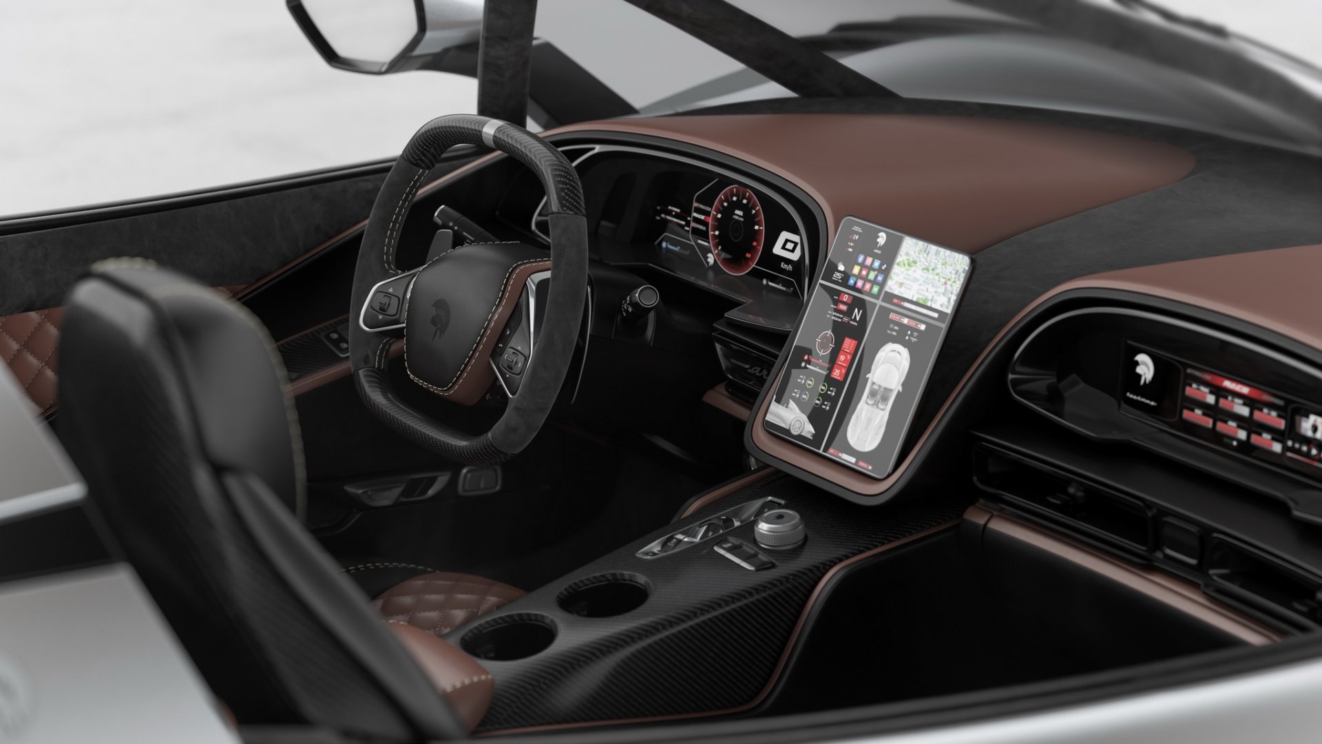 ห้องโดยสารทำมาเป็นเอกลักษณ์แผงคอนโซลหน้าทำเป็นโดมโค้งดูแยกสัดส่วนระหว่างคนขับกับผู้โดยสาร จอแบ่งเป็น 3 ส่วน จอหน้าปัดคนขับ กึ่งกลางติดจอ Infotainment ขนาดใหญ่ และจอสำหรับผู้โดยสาร วัสดุตกแต่งก็เน้นความพรีเมียมด้วยหนังแท้ Pienofiore leather และเสริมดุด้วย Alcantara บวกกับคาร์บอนไฟเบอร์ ทั้งนี้ทั้งนั้นถ้าคุณอยากได้วัสดุอื่นหรือสีสันต่างๆ สามารถสั่งได้ตามความชอบ