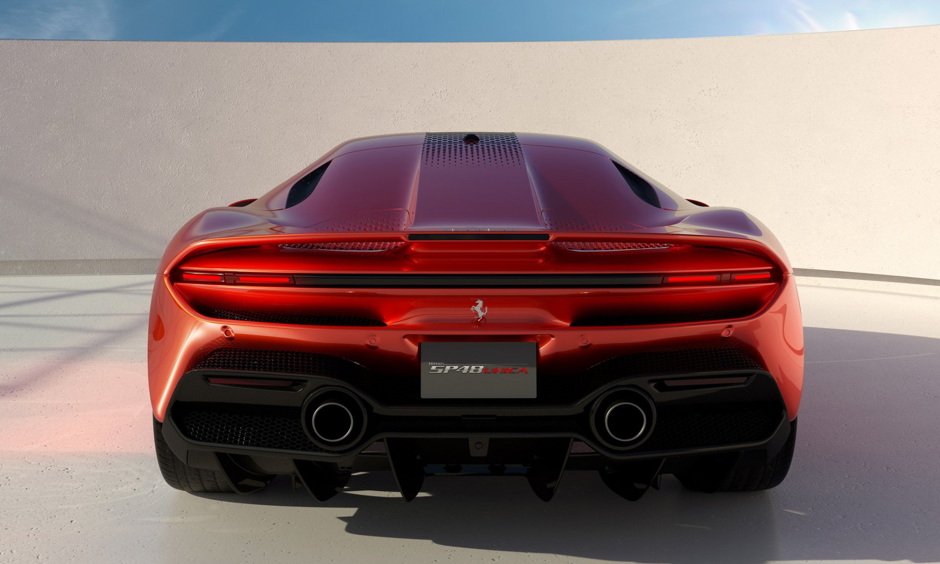 Ferrari SP48 Unica นี่คือโครงการพิเศษ Special Projects ให้กับลูกค้ารายหนึ่งที่ต้องการรถที่ไม่เหมือนใครในโลก เป็นการรื้อเปลือกตัวถัง F8 เดิมออกหมดจนได้เฟอร์รารี่หน้าตาล้ำแปลกตาเช่นนี้ ด้านหน้าเปลี่ยนใหม่หมดทั้งโคมไฟหน้า กันชนมาในดีไซน์ 3 มิติ มีเว้าเข้าไปเจาะรูช่องถี่ๆ ฝากระโปรงช่องลมแบบคู่ เพิ่มช่องอากาศเข้าอินเตอร์คูลเลอร์บริเวณหน้าต่าง บั้นท้ายแบบปิดทึบไม่เห็นเครื่องยนต์ ดิฟฟิวเซอร์ก็ชุดใหม่ ส่วนท้ายของรถถูกขยายให้ยาวขึ้นช่วยเพิ่มแรงกด ดีไซน์รถใหม่นี้ยังส่งผลให้แรงต้านอากาศนั้นลดไป 12% อีกด้วย