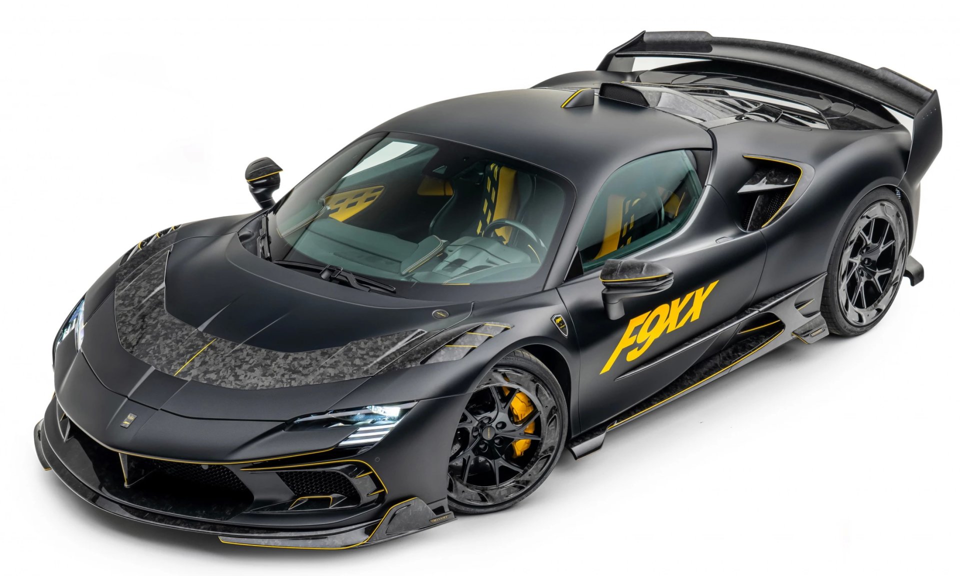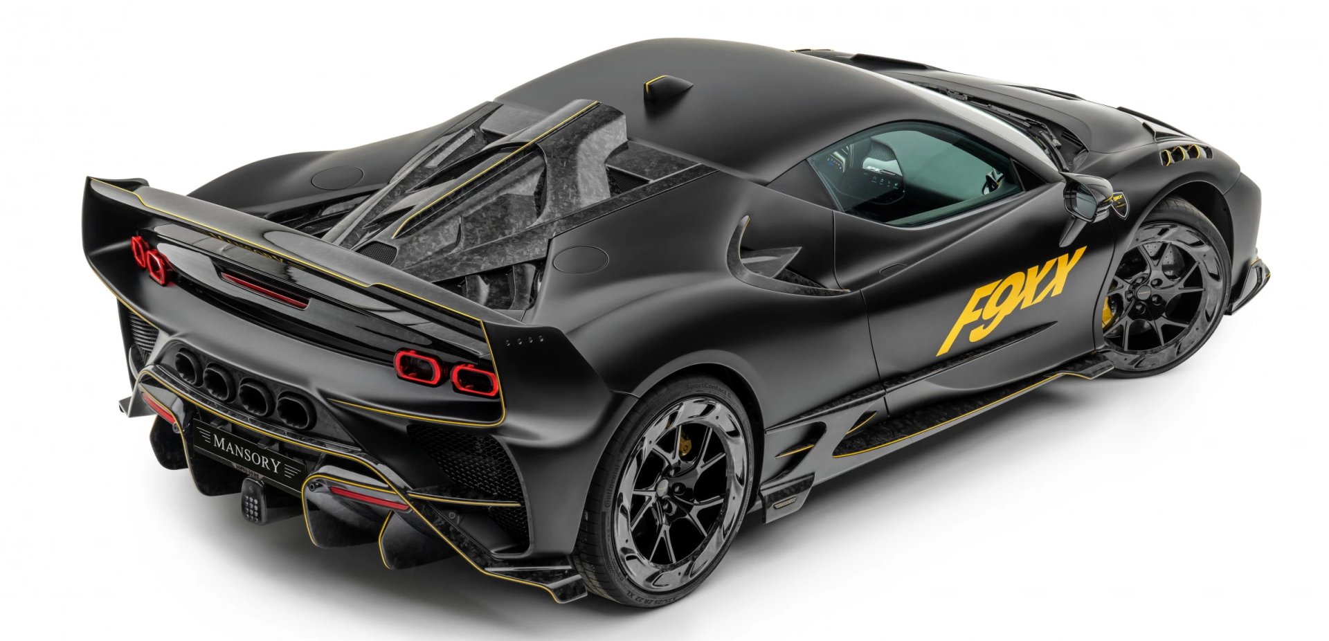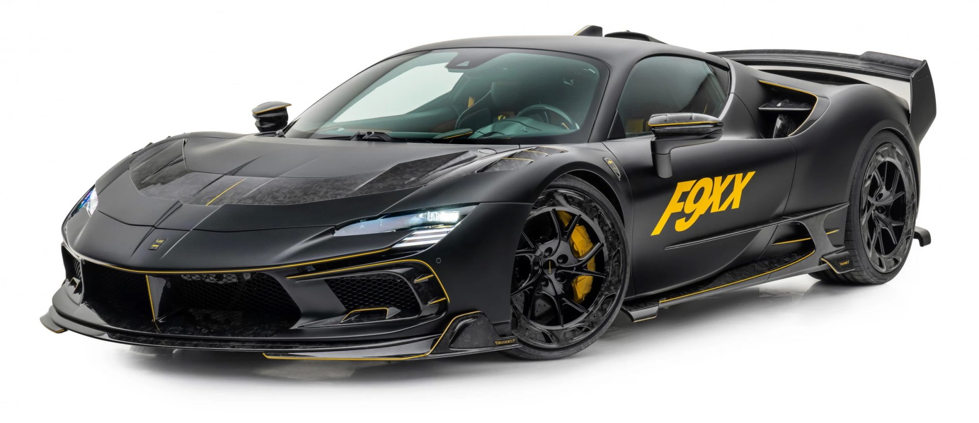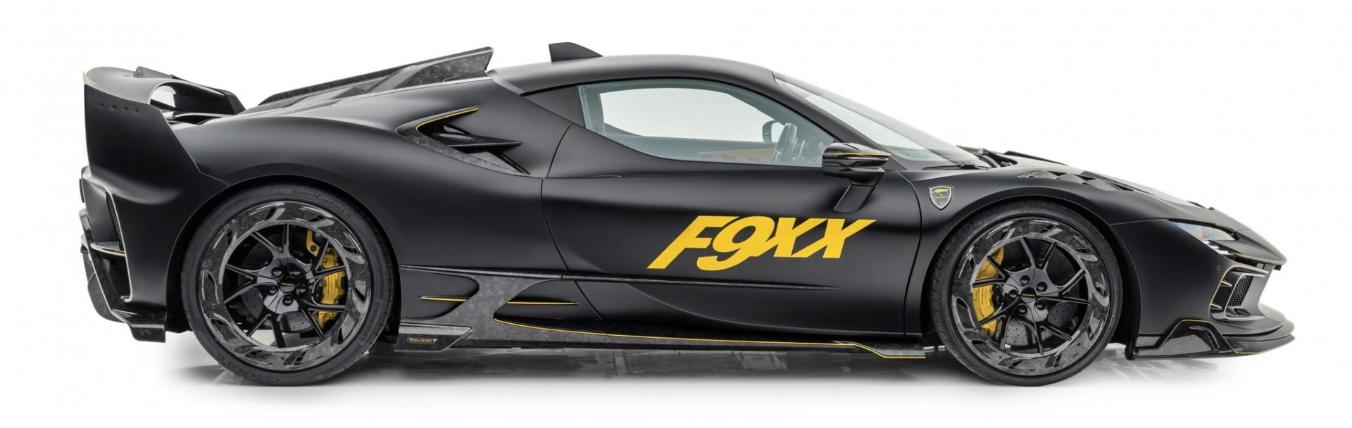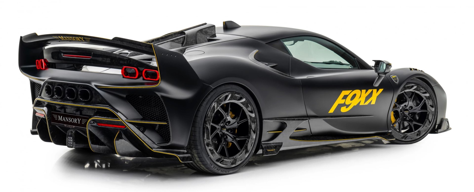 นี่คือ Ferrari SF90 แต่งเต็มนามว่า Mansory F9XX รูปทรงทำเอานึกถึงรถแข่ง FXX-K EVO กันเลย ตัวถังรอบคันมีส่วนประกอบจากฟอร์จคาร์บอนฯ เพื่อความเบา กันชนหน้าใหม่หมด ลิ้นหน้าขนาดใหญ่ช่วยสร้างแรงกด ขยายช่องลมเพื่อรับอากาศเข้าสู่หม้อน้ำมากขึ้น เพิ่มครีบช่องลมเหนือซุ้มล้อหน้า ฝากระโปรงคาร์บอนล้วน ด้านข้างอลังกาลด้วยล้อลาย "YT.5 Air" ขึ้นเป็นฟอร์จชิ้นเดียว ขนาดด้านหน้า 21 นิ้ว หลัง 22 นิ้ว ส่วนบน Scoop ดักลมเข้าเครื่อง (รุ่น Spider ไม่มี) ปีกท้ายขนาดใหม่เป็นชิ้นเดียวกับกันชน รับกับดิฟฟิวเซอร์คู่ที่ทำมารองรับการไหลกระแสลมใต้รถกับแรงกดได้ยอดเยี่ยม ปลายท่อไอเสียจัดแบบโหดๆ 4 ท่อ เสียงลั่นแน่นอน นอกจากนี้ช่วงล่างก็ปรับเปลี่ยนใหม่ด้วย
