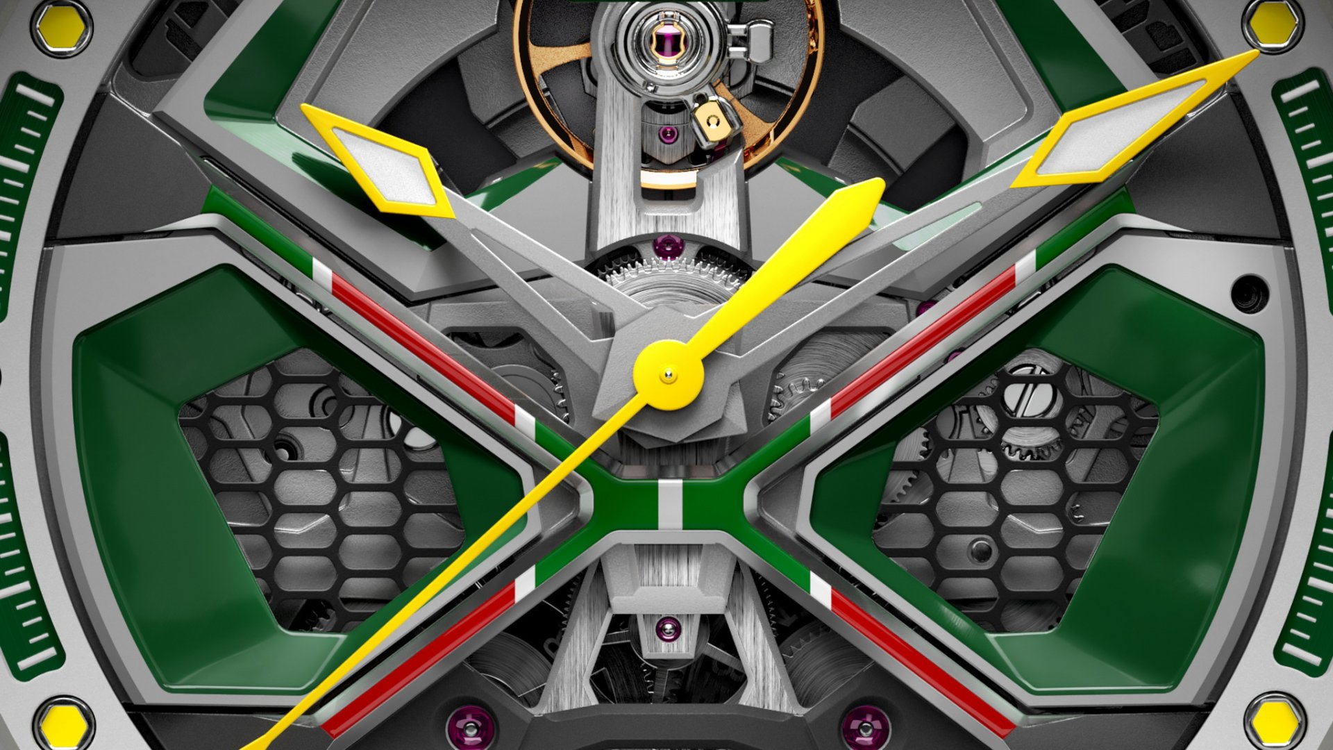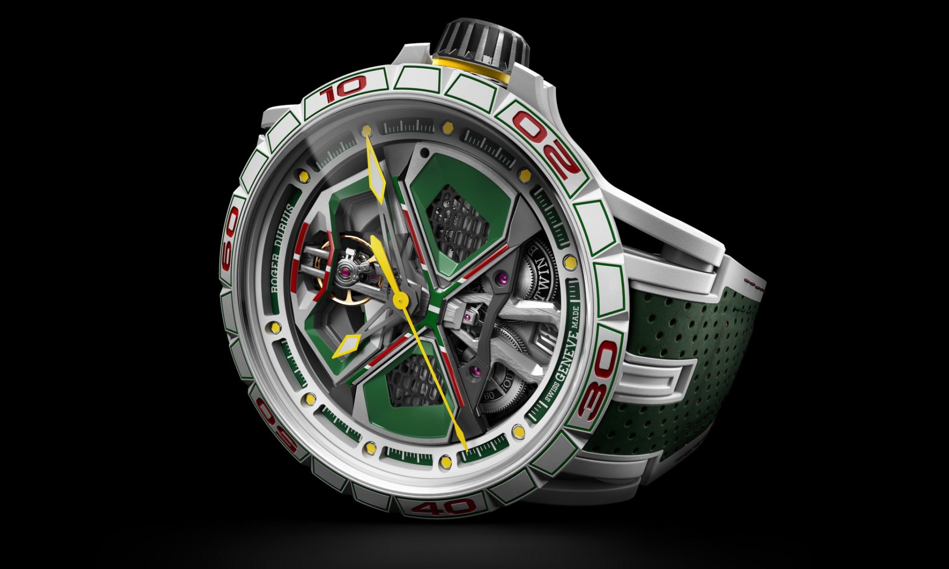 Excaliber Spider Huracán White MCF นาฬิกาสุดลิมิเต็ด ร่วมกันออกแบบระหว่าง Roger Dubuis (โรเช่ย์ ดูบุยส์) และทีมแข่ง Lamborghini Squadra Corse ตัวเรือนขนาด 45 มม. ทำงานด้วยกลไลออโตเมติก RD630 กันน้ำลึก 5 bar (50 เมตร) ใช้วัสดุแบบ Mineral Composite Fiber (MCF) เบากว่าเซรามิก 2.5 เท่า และเบากว่าคาร์บอน SMC 13% หน้าปัดใช้วัสดุหลักเป็นไทเทเนียมตกแต่งด้วยสีขาว เขียว แดง และเหลืองบนเข็มนาฬิกา ดุดันด้วยตะแกรงรังผึ้งในกรอบหกเหลี่ยม ตามสไตล์ตัวถัง Huracan GT3 EVO2 ตัวกลไกขับเคลื่อนสีทองถูกวางเอียงทำมุม 12 องศา เปรียบเสมือนเครื่องยนต์ ตัวเม็ดมะยมยังทำให้เหมือนหมุดล้อ Center Lock อีกด้วย