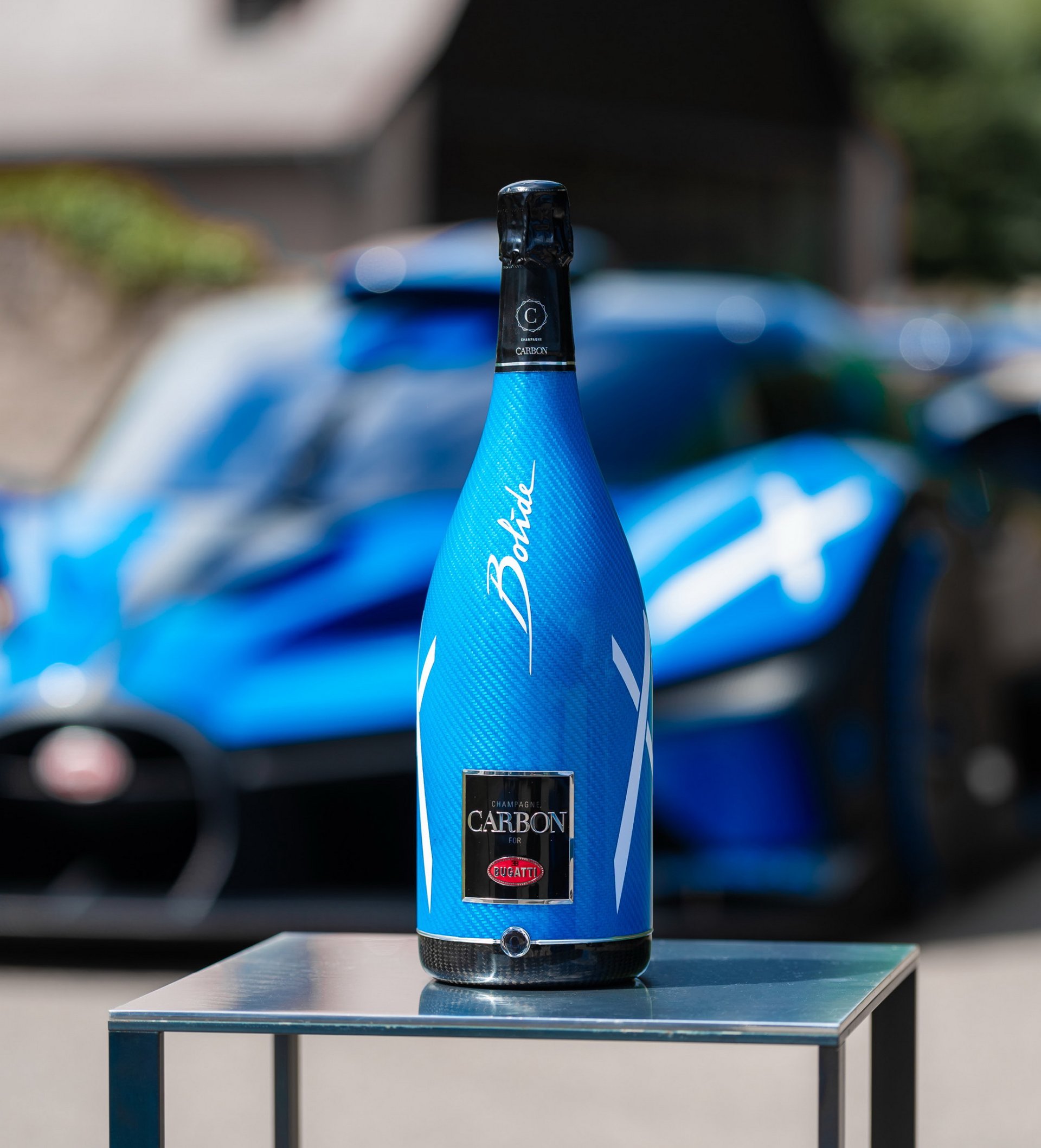 Bugatti และ Champagne Carbon ร่วมมือกันผลิตแชมเปญสุดพิเศษมาตั้งแต่ปี 2018 รุ่นแรกเลย คือ ƎB.01 เป็นรุ่นฉลองครบรอบ 110 ปี Bugatti ขวดคาร์บอนฯ สีน้ำเงินล้วน ถัดมาเป็นรุ่น ƎB.02 ขวดคาร์บอนฯ สีดำตัดส้ม ทำเพื่อเฉลิมฉลองสถิติความเร็ว 490.484 กม. / ชม. ของ Chiron Super Sport 300+ และใหม่ล่าสุดกับ ƎB.03 ซึ่งได้แรงบันดาลจากไฮเปอร์คาร์ Bolide นั่นเอง