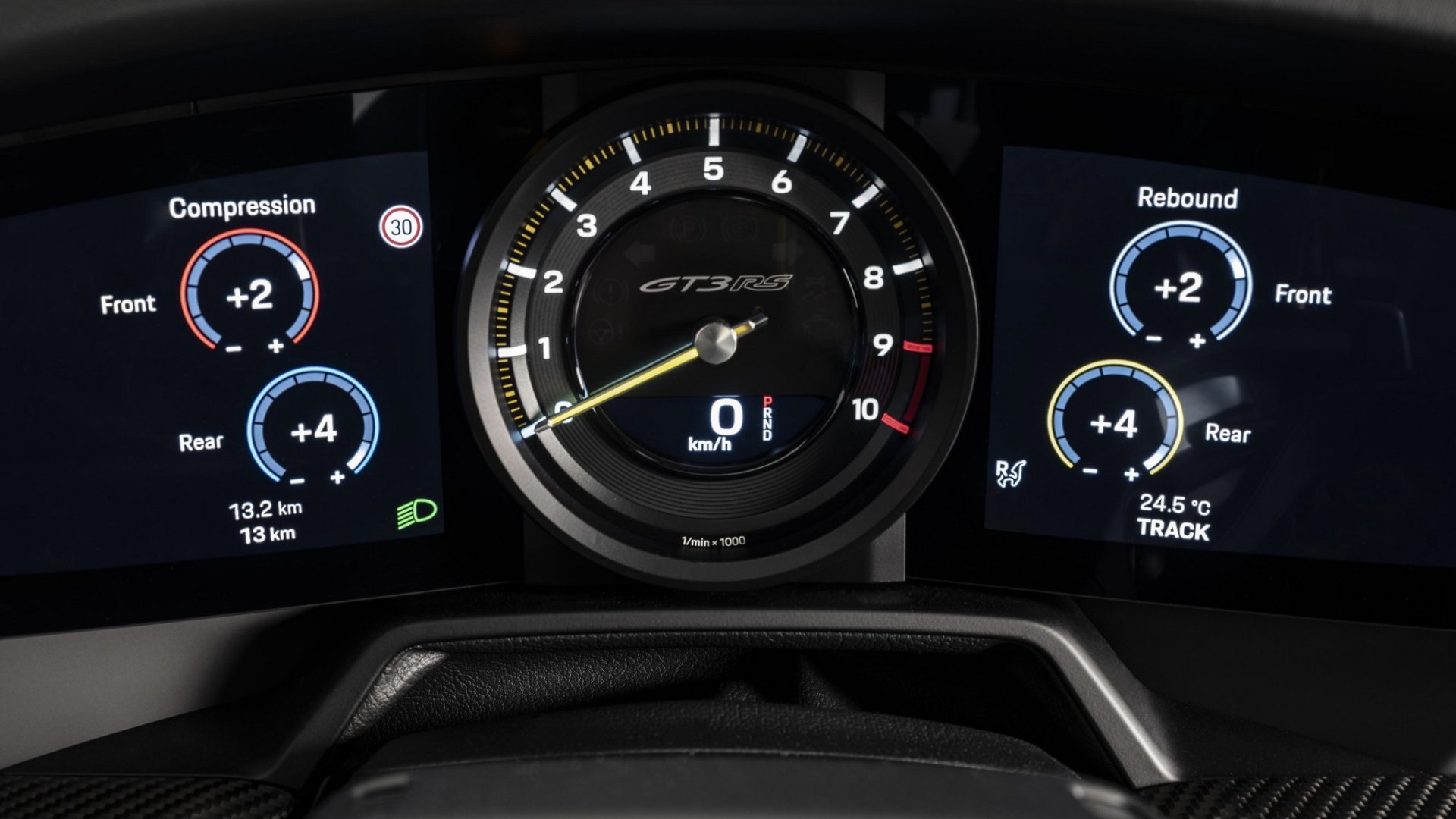 ห้องโดยสารเพียงแค่คุณจิ้มออฟชั่น Club Sport Pakage คุณจะได้ roll cage ถังดับเพลิง เข็มขัดเนิรภัย 6 จุด เบาะใส่ตัวคาร์บอนฯ full bucket seats เหล่านี้ไม่มีค่าใช้จ่ายเพิ่ม ตัวพวงมาลัยดีไซน์ไม่ต่างจาก 911 รุ่นอื่น แต่ปุ่มนั้นเยอะกว่า นอกจากลูกบิดปรับโหมดการขับขี่สามโหมด Normal, Sport และ Track ยังเพิ่มลูกบิดมาอีก 3 ตัว คือ Pasm ไว้ปรับแต่งช่วงล่าง, PTV+ ไว้ปรับแต่ง e-diff จัดการแรงบิด และปุ่ม ESC/TC ปรับ Traction Control ได้ 7 ระดับ หรือปิดระบบทั้งหมดก็ได้ และก็มีปุ่ม DRS ด้วย