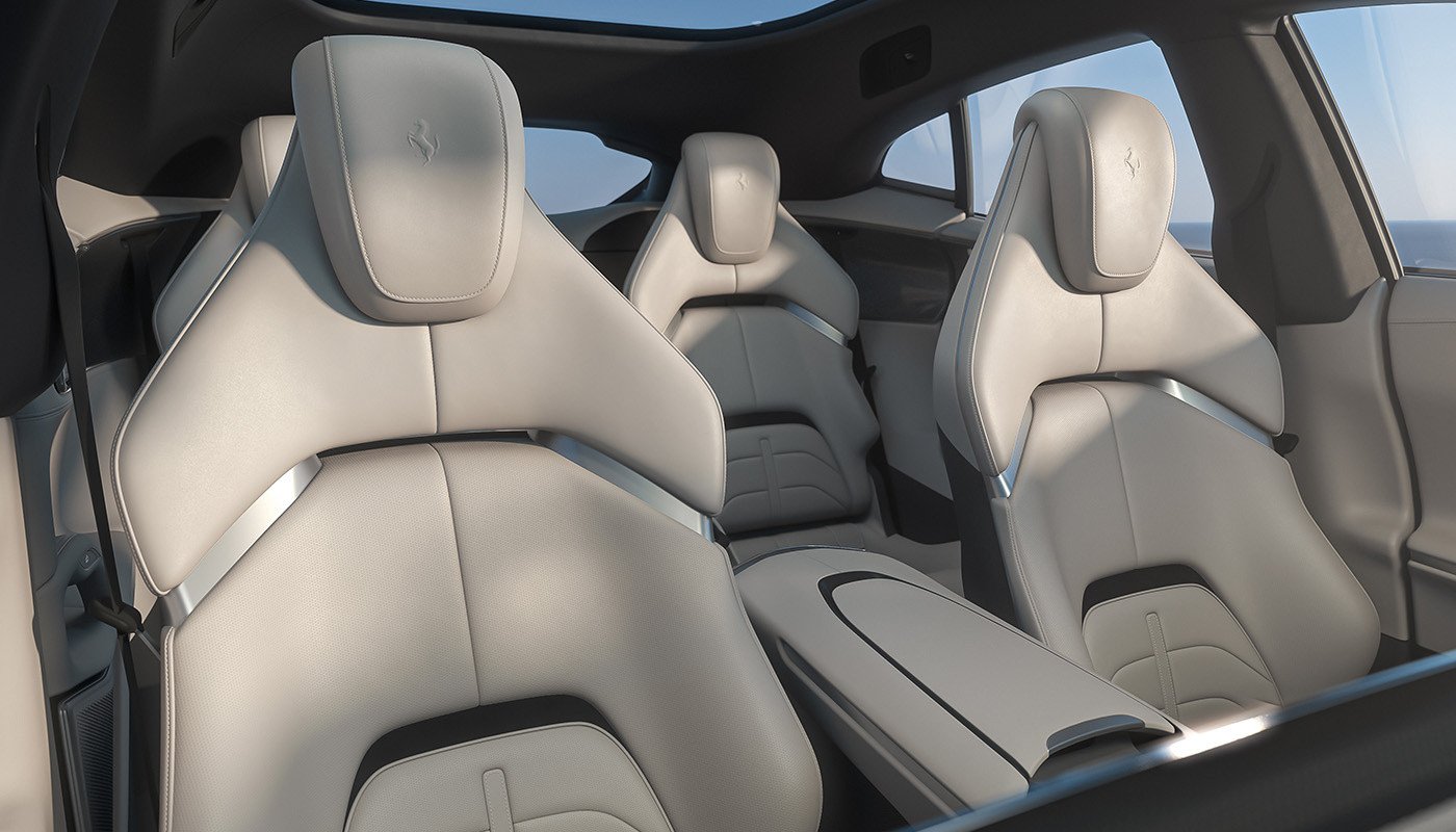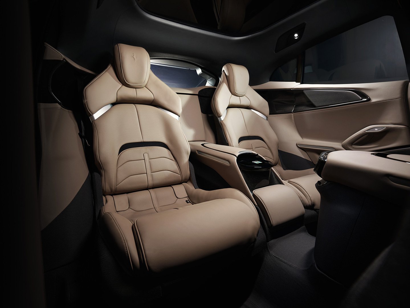 ห้องโดยสารให้บรรยากาศแนวหรูกันเลย โดยรอบใช้หนังแท้สัมผัสนุ่มนวลกับเสริมแต่งด้วยคาร์บอนไฟเบอร์ มีส่วนที่ใช้วัสดุรีไซเคิล เช่น พรมวางเท้าเป็นโพลีเอไมด์ (polyamide) รีไซเคิลจากอวนจับปลา, ผ้าบุหลังคาโพลีเอสเตอร์ (Polyester) และ Alcantara สูตรใหม่จากโพลีเอสเตอร์รีไซเคิล หน้าปัดดิจิตอลและพวงมาลัยดึงมาจาก SF90 คอนโซลกลางมีปุ่มสัมผัสกลมไว้ควบคุมเครื่องปรับอากาศ ฝั่งผู้โดยสารด้านหน้าติดจอสัมผัสขนาด 10.2 นิ้ว ใช้งานความบันเทิงหรือดูความเร็วรถละเอียดเหมือนขับเองกันเลย ด้านหลังเป็นเบาะแยก 2 ที่นั่ง ปรับเอนได้อิสระ มีปุ่มปิดประตูแบบไฟฟ้า ที่วางแขนขนาดใหญ่มีช่องเก็บของและปุ่มสัมผัสกลมไว้คุมครื่องปรับอากาศเหมือนด้านหน้ารถ ให้เครื่องเสียงไฮเอนด์ Burmester 3D เป็นอุปกรณ์มาตราฐาน