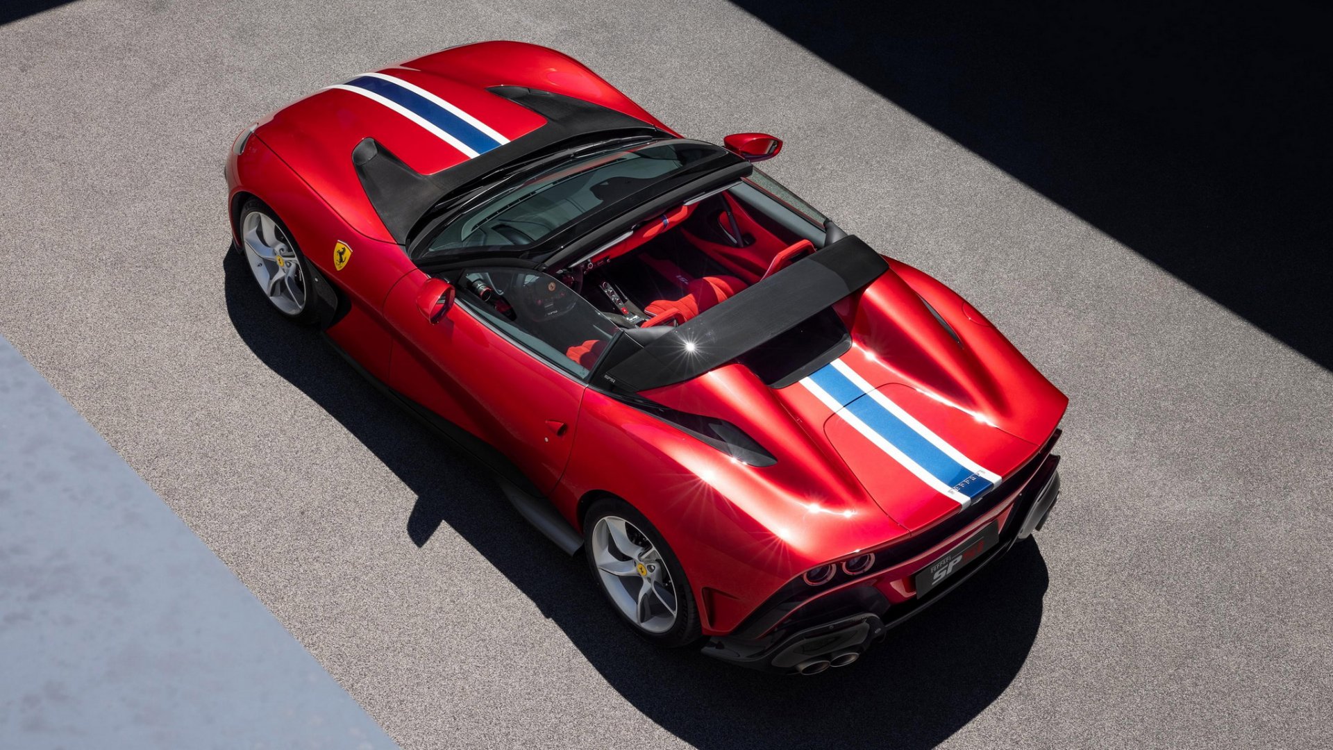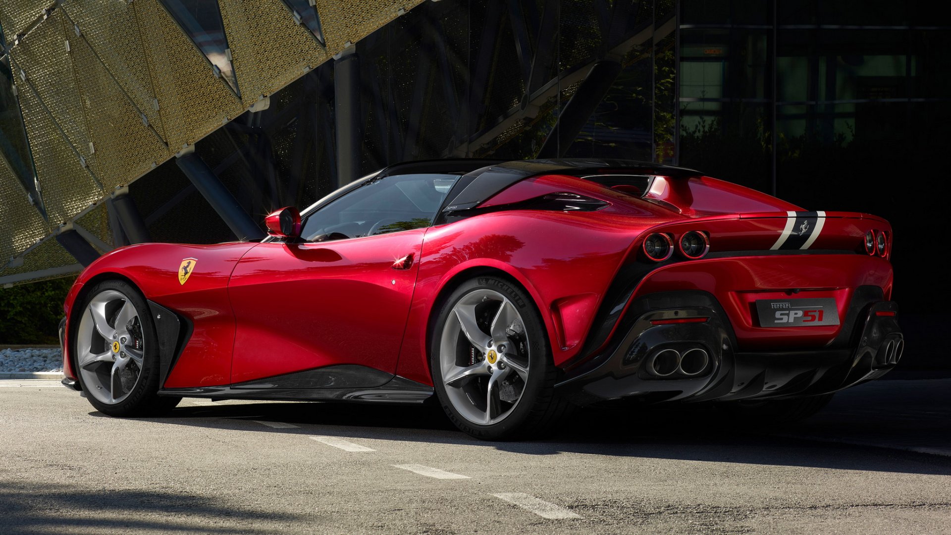 ถ้าเห็น Ferrari รุ่นไหนมีคำย่อว่า SP นั่นหมายถึงเป็นโปรเจ๊คพิเศษ Special Projects ซึ่งทำให้กับลูกค้ารายนั้นโดยเฉพาะ SP51 สร้างขึ้นสำหรับลูกค้าชาวไต้หวันรายหนึ่งไม่เผยนาม ตัวรถใช้พื้นจากรุ่น 812 GTS จัดการดีไซน์ใหม่หมดโดยแผนก Ferrari Styling Centre นำโดย Flavio Manzoni ตัวถังใช้สีแดง 'Rosso Passionale' พ่นหนา 3 ชั้น พร้อมคาดเส้นกึ่งกลางด้วยสีน้ำเงิน-ขาว แรงบันดาลใจจาก Ferrari 410 S ปี 1955 กันชนหน้ามีช่องรับอากาศใหญ่โต โคมไฟหน้าทรงใหม่ ฝากระโปรงหน้าเสริมช่องระบายความร้อนคู่ ล้อลาย 5 ก้าน เสริมคาร์บอนตรงก้านเพื่อลดน้ำหนัก หลังคาแบบเปลือยเน้นโชว์โครงสร้างด้านหลังดีไซน์ให้เหมือนลอยตัวอยู่ นอกจากจะช่วยปกป้องผู้ขับแล้ว มันยังช่วยเรื่องแอโรไดนามิกได้อย่างดี
