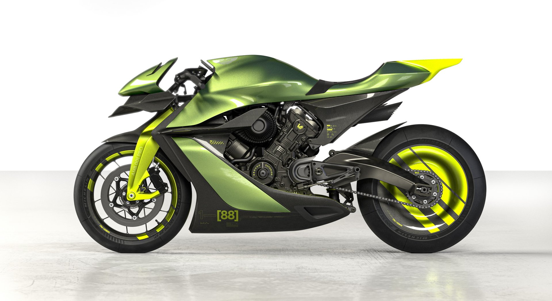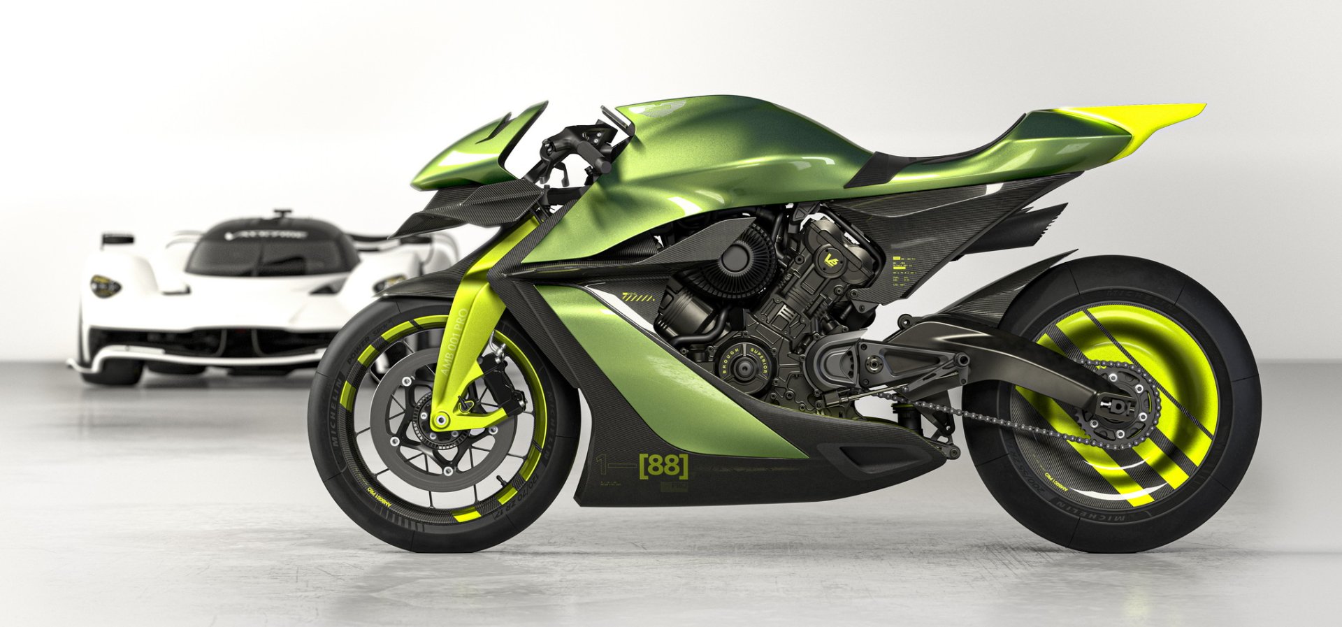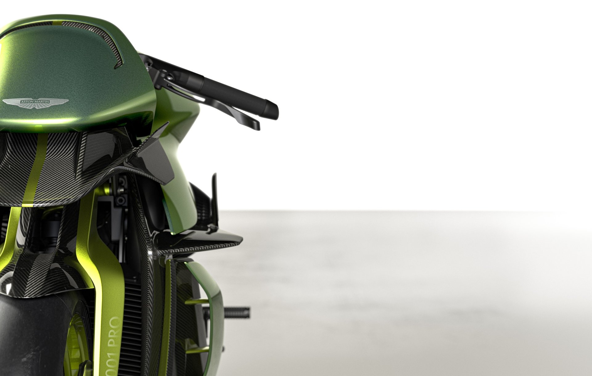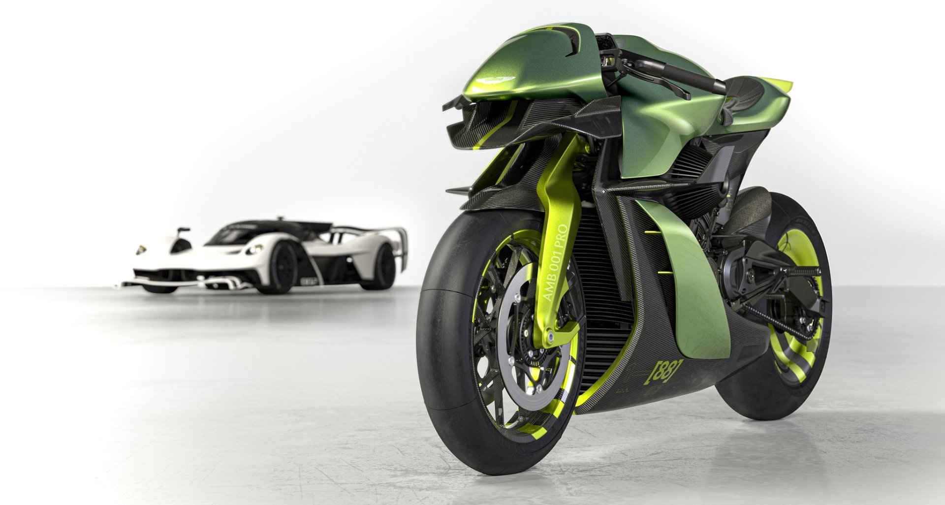 AMB 001 Pro ซุปเปอร์ไบค์แบบพร้อมลงสนามแข่ง น้ำหนักรถ 175 กก. เปลือกตัวถังเป็นงานคาร์บอนไฟเบอร์ทั้งหมด ลงด้วยสีเขียว Aston Martin Verdant Jade และตัดด้วยเส้นสีเขียว Photon Lime เป็นสไตล์เดียวกับไฮเปอร์คาร์ Valkyrie AMR Pro มองจากหน้ารถจะมีสปอยเลอร์หน้าและปีกขนาดใหญ่ด้านข้างเหมือนเครื่องบินช่วยเพิ่มแรงกดและจัดเรียงกระแสลมเข้าสู่ช่องไอดี ตัวเครื่องยนต์และช่วงล่างทำผิวสีดำเคลือบ Cerakote และโลโก้ปีก Aston Martin ที่หน้ารถก็เป็นเช่นเดียวกับ Valkyrie AMR Pro ที่ความหนาเพียง 70 ไมครอน บางกว่าเส้นผมมนุษย์ถึง 30%