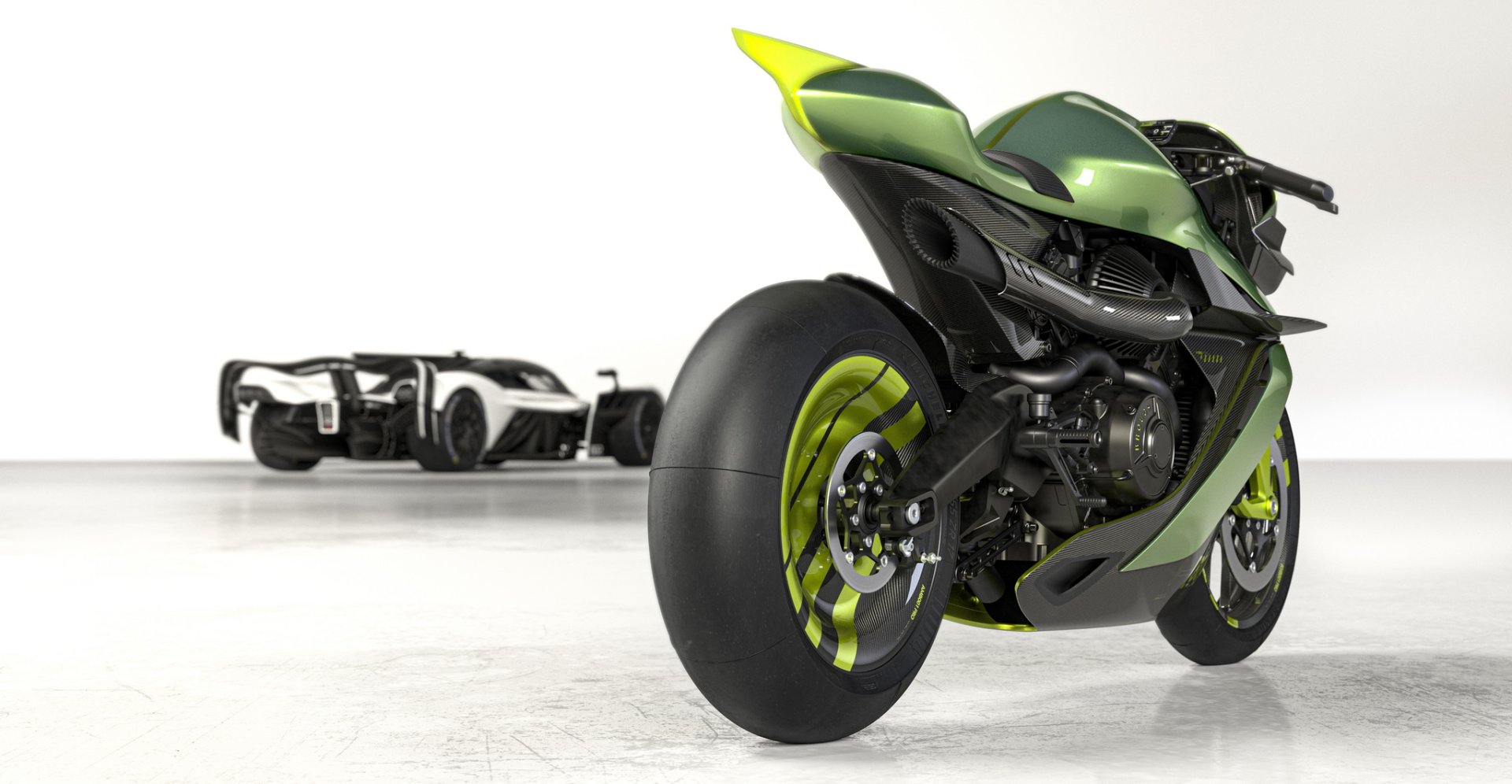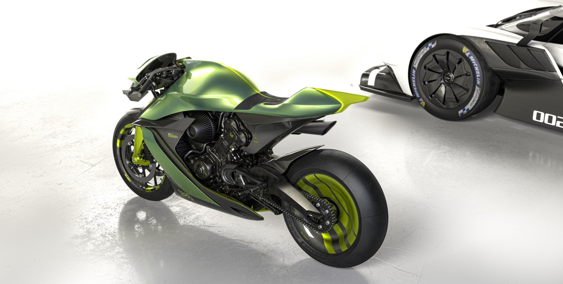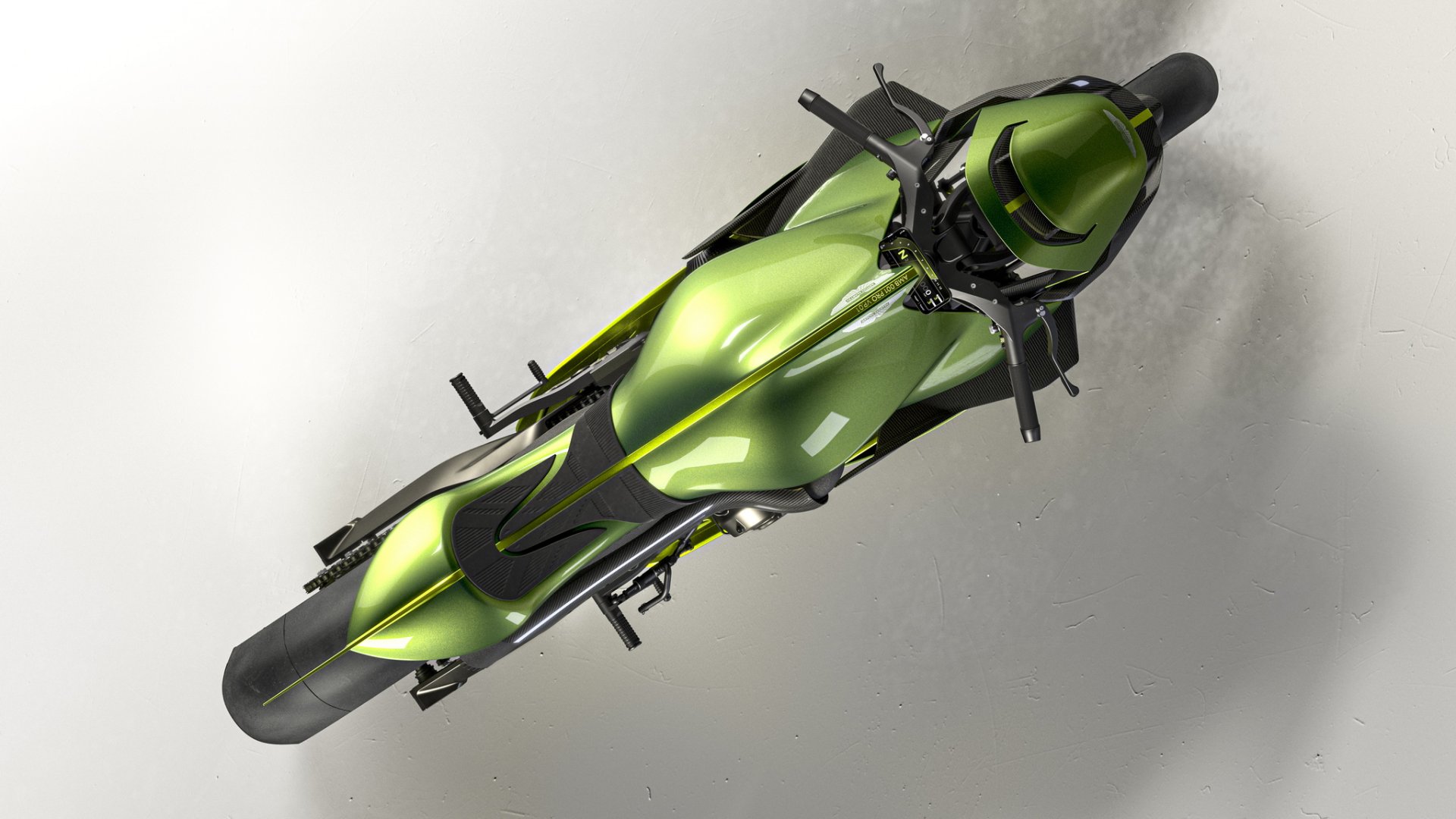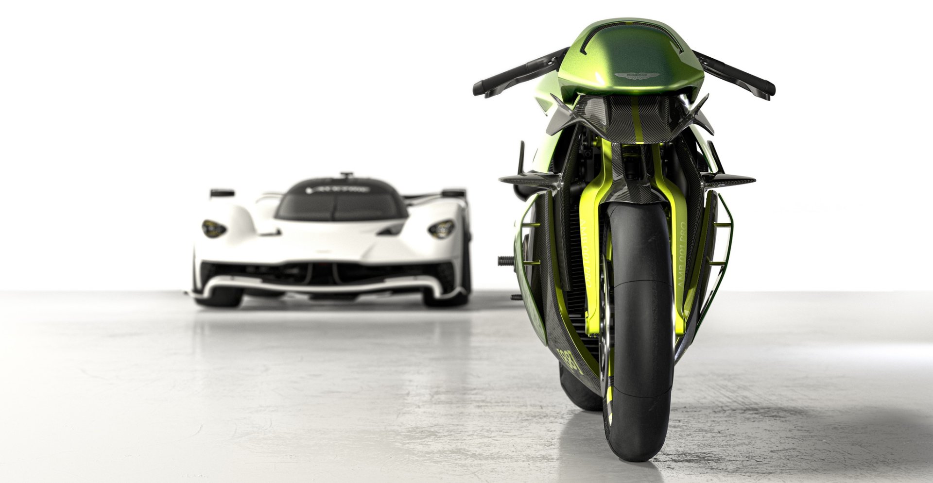 AMB 001 Pro ซุปเปอร์ไบค์แบบพร้อมลงสนามแข่ง น้ำหนักรถ 175 กก. เปลือกตัวถังเป็นงานคาร์บอนไฟเบอร์ทั้งหมด ลงด้วยสีเขียว Aston Martin Verdant Jade และตัดด้วยเส้นสีเขียว Photon Lime เป็นสไตล์เดียวกับไฮเปอร์คาร์ Valkyrie AMR Pro มองจากหน้ารถจะมีสปอยเลอร์หน้าและปีกขนาดใหญ่ด้านข้างเหมือนเครื่องบินช่วยเพิ่มแรงกดและจัดเรียงกระแสลมเข้าสู่ช่องไอดี ตัวเครื่องยนต์และช่วงล่างทำผิวสีดำเคลือบ Cerakote และโลโก้ปีก Aston Martin ที่หน้ารถก็เป็นเช่นเดียวกับ Valkyrie AMR Pro ที่ความหนาเพียง 70 ไมครอน บางกว่าเส้นผมมนุษย์ถึง 30%