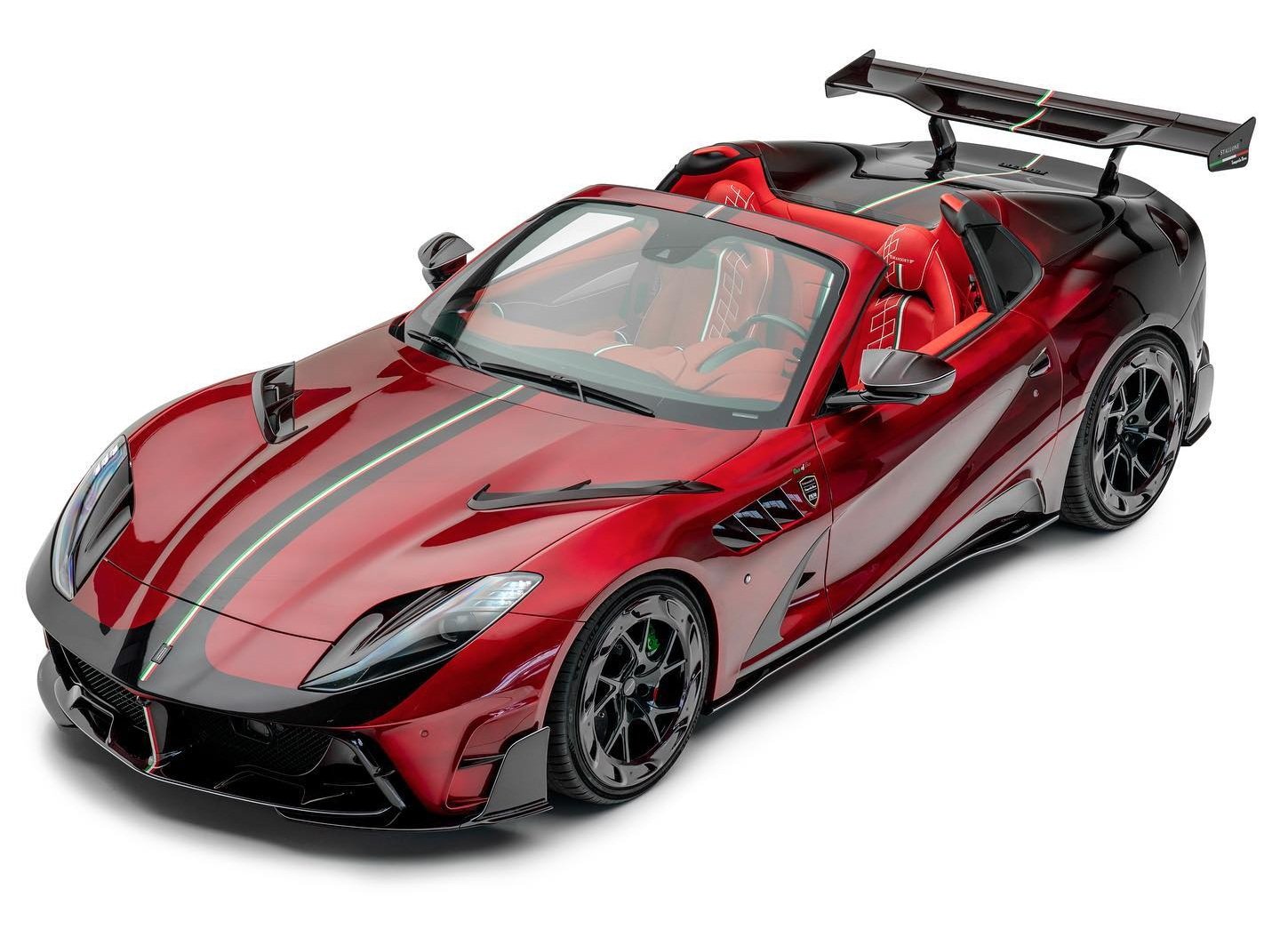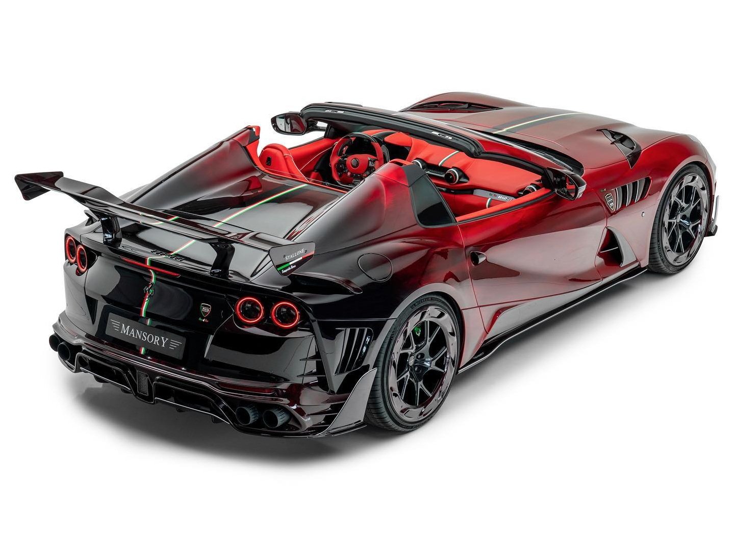 Mansory Stallone Tempesta Nera คือ Ferrari 812 GTS ที่จับมา Bespoke หนึ่งเดียวไม่เหมือนใคร ตัวถังสีแดงไล่เฉดไปถึงสีดำสนิทเป็นสไตล์ที่หาดูยาก พร้อมชุดแต่งคาร์บอนไฟเบอร์รอบคันสุดอลังกาล ใส่ล้อฟอร์จลาย YT.5 Air ขอบหน้า 21 นิ้ว หลัง 22 นิ้ว ช่วงล่างเปลี่ยนสปริงใหม่ตัวรถเตี้ยลงราว 25 มม. ระบบท่อไอเสียก็เปลี่ยนใหม่ดุดันกว่าของเดิมชัดเจน