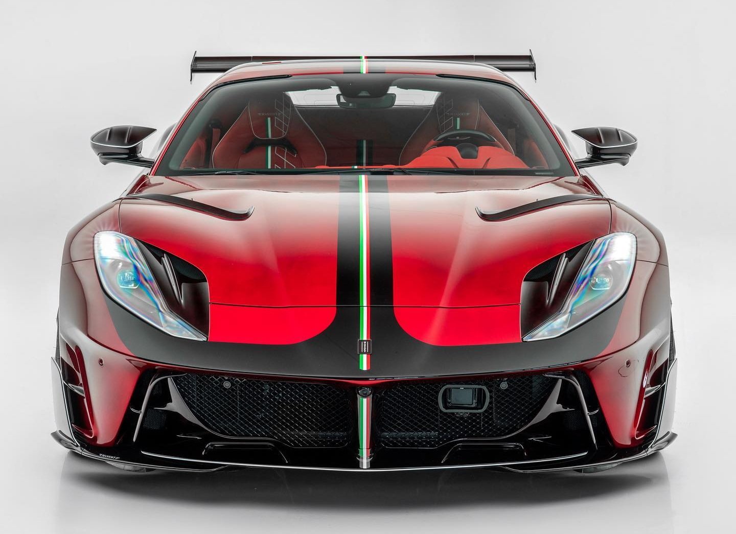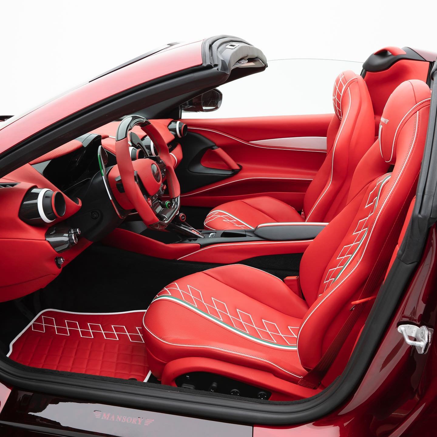 ห้องโดยสารรื้อใหม่หมด เน้นหุ้มหนังแท้สีแดงเพิ่มลายเส้นสีขาว พร้อมลายธงชาติอิตาลีตามจุดต่างๆ แป้นเหยียบอลูมิเนียม มีการปักตรา Mansory บนเบาะนั่ง พรมวางเท้า และที่ธรณีประตูสร้างความแตกต่างไม่เหมือนใคร