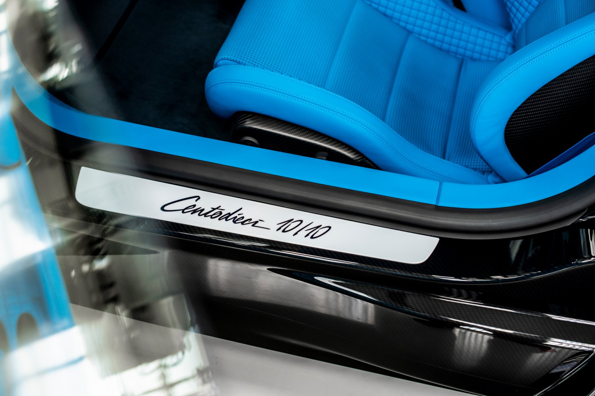 Centodieci คันสุดท้าย บอดี้ภายนอกมาด้วยสีขาว Quartz เนียนตา โชว์ผิวคาร์บอนไฟเบอร์สีดำที่ส่วนล่างตัวถังและยังสอดแทรกสีฟ้า Light Blue Sport ที่ก้ามคาลิปเปอร์เบรก รวมถึงโลโก้ Centodieci บนปีกท้าย