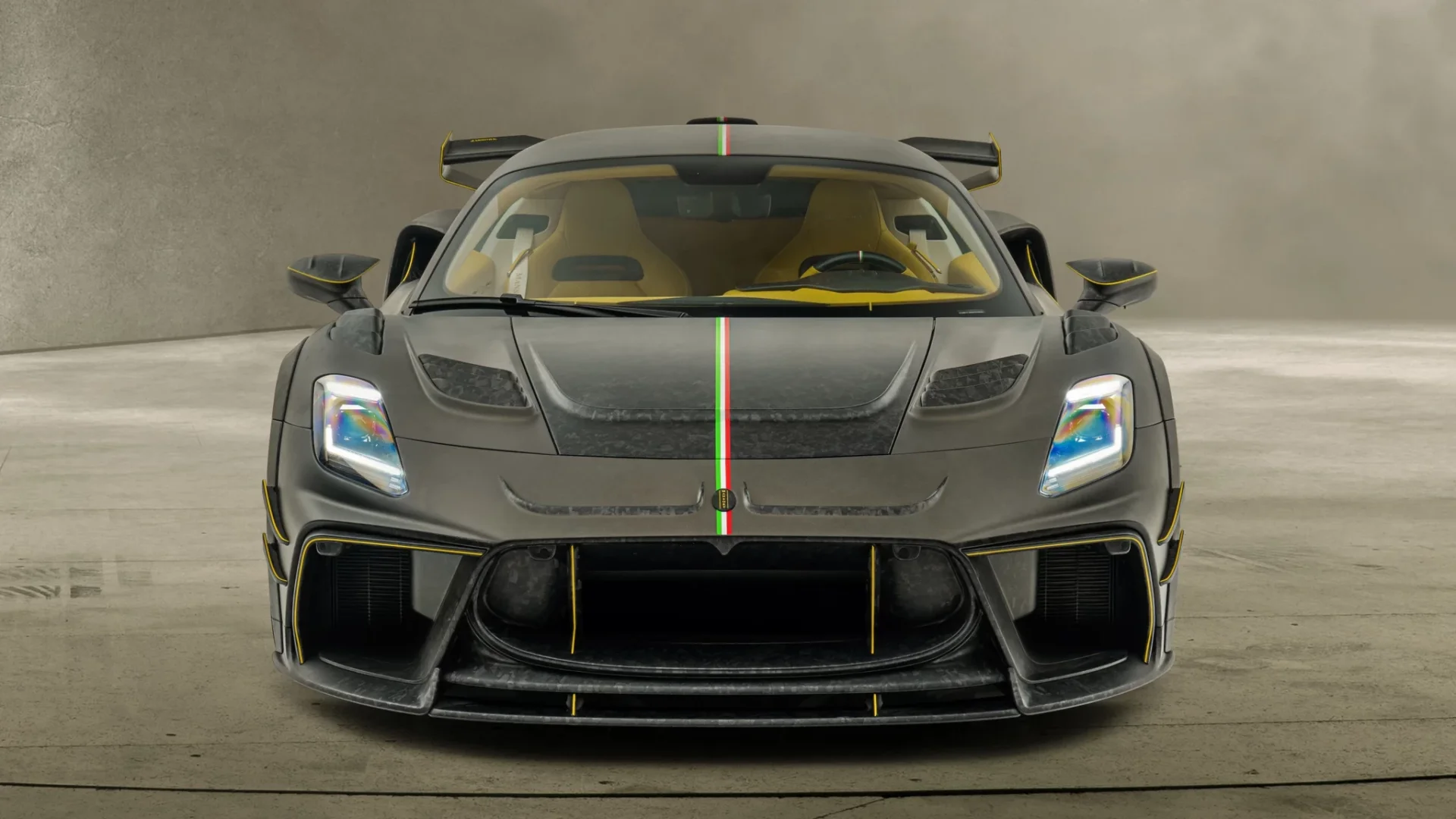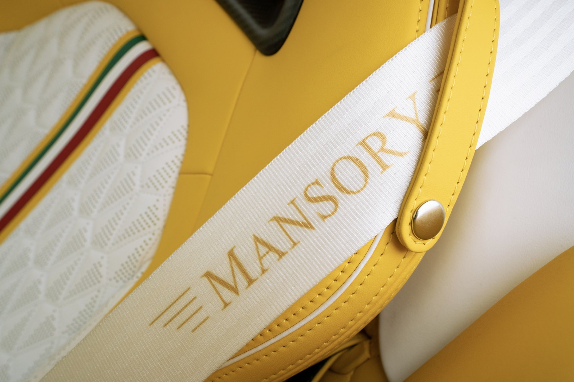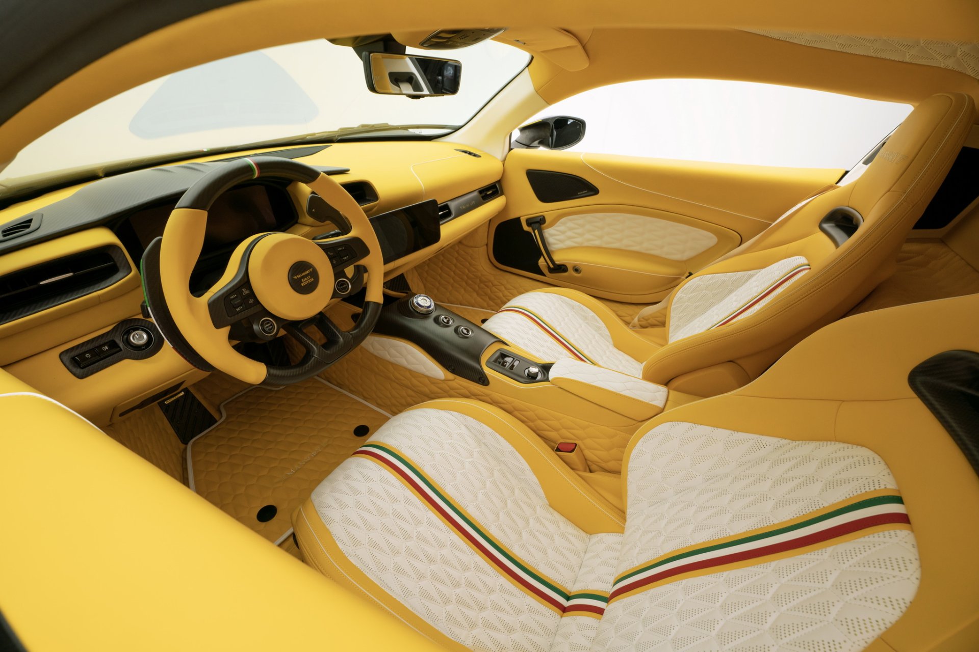 สำหรับห้องโดยสารทาง Mansory มอบอิสระให้คุณทั้งวัสดุสีสันต่างๆ คุณสามารถเลือกเองได้หมด อย่างคันในรูปเน้นวัสดุหนังแท้เป็นหลักมาในโทนสีเหลือง ขาว ดำ พร้อมคาดเส้นธงชาติอิตาลีบน Paddle Shift, พวงมาลัย และตัวเบาะนั่ง
