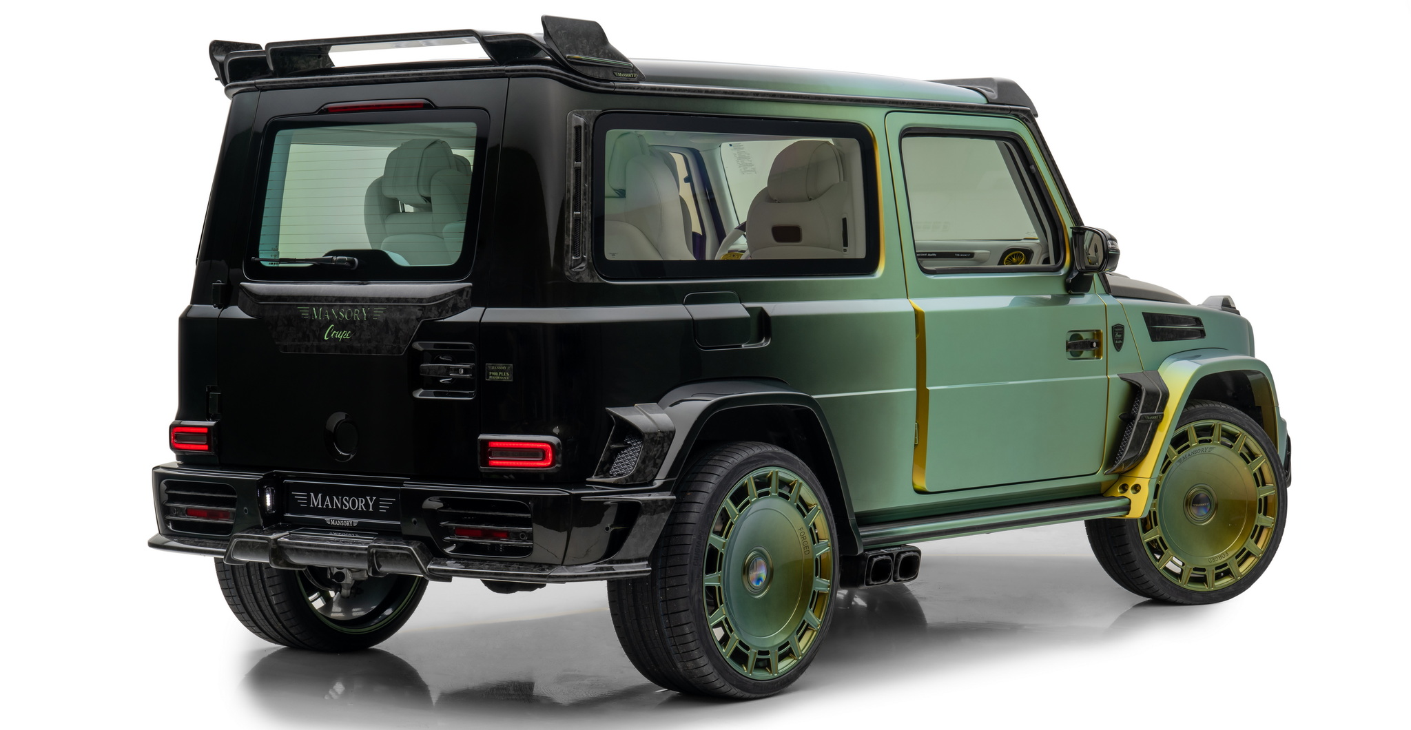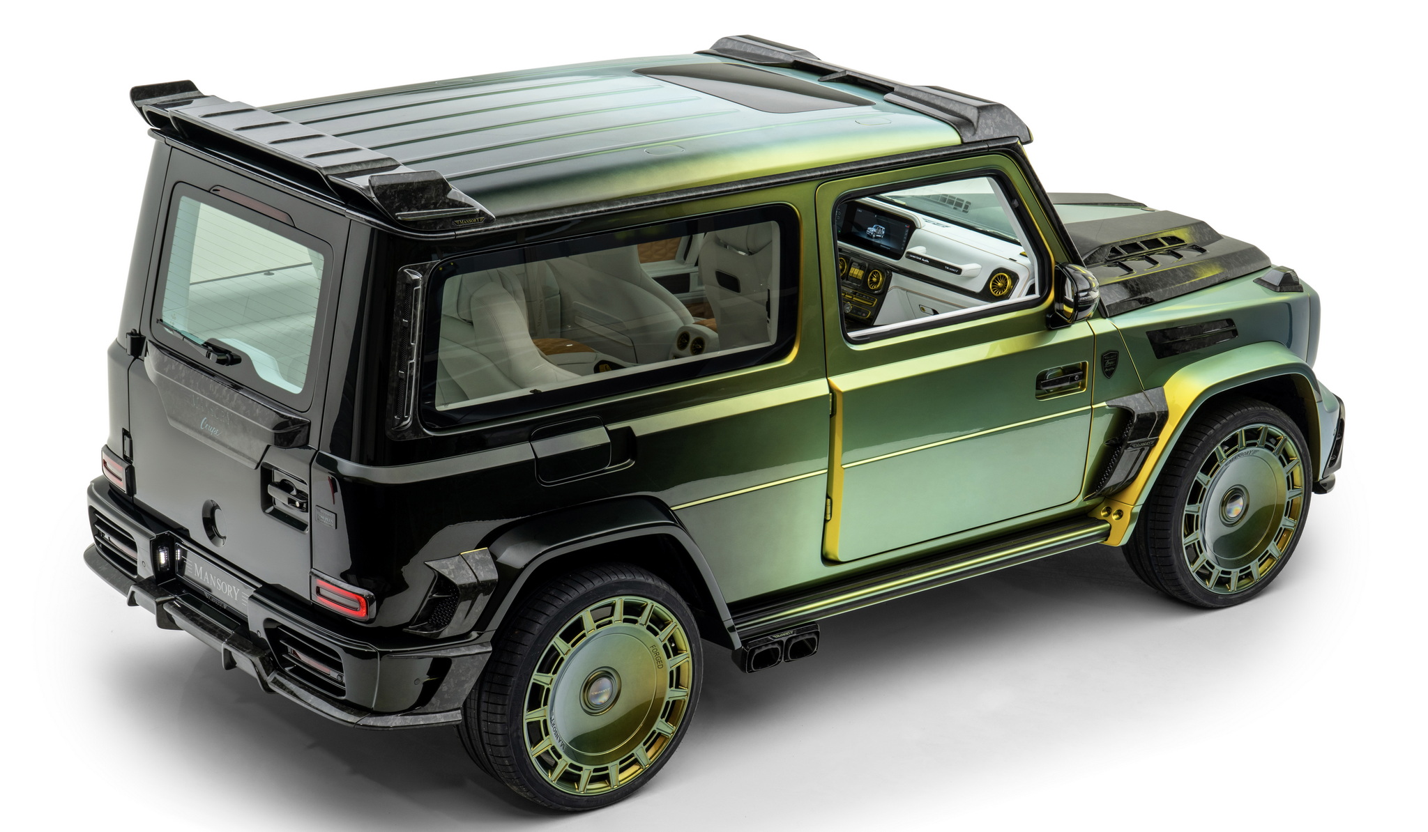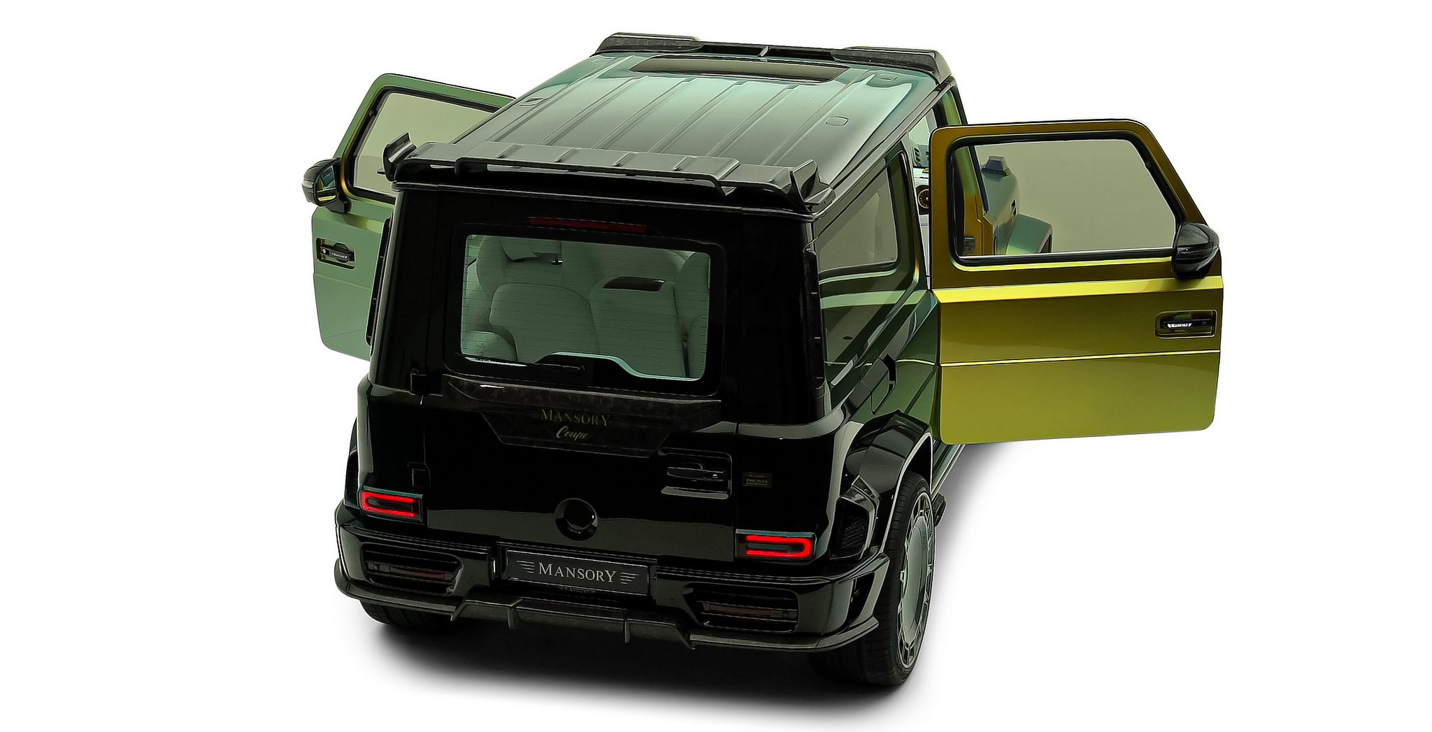 นี่คือ Mansory Gronos Coupé EVO C ที่เป็นการจับ G63 สี่ประตูมาทำเป็นรถคูเป้ รถหนึ่งคันจะใช้เวลาสร้างประมาณหนึ่งปีครึ่ง แต่ละคันสั่งพิเศษตามลูกค้าแต่ละราย ตัวรถถูกรื้อประตูทั้งสี่บานออก ย้ายจุดยึดประตูจากเสา A ไป B ประตูเปิดแบบใหม่อารมณ์รถ Rolls-Royce ด้วยประตูหลังที่หายไปช่วยให้ติดตั้งบานกระจกยาวเต็มพื้นที่ทำให้ห้องโดยสารด้านหลังดูโปร่งขึ้นไปอีก ตัวถังภายนอกมากับสีโครมพิเศษ รอบคันจัดหนักด้วยชุดแต่งสุดอลังรอบคัน ล้อเป็นรุ่นใหม่ FD.15 ขอบ 24 นิ้ว ทั้งสี่ล้อ และท่อไอเสียชุดใหม่ออกข้างรถเช่นเคย