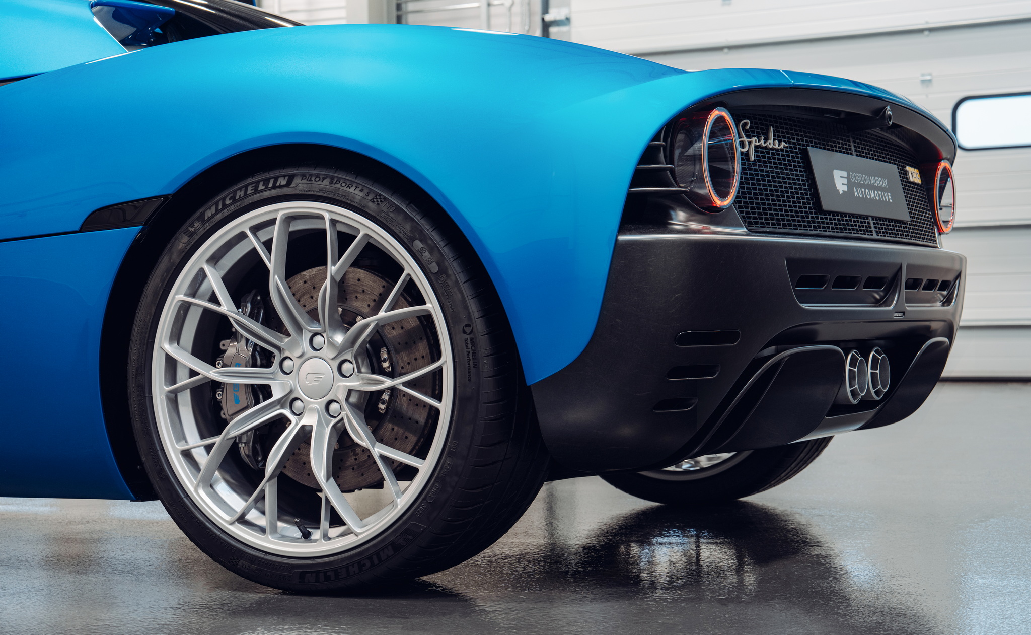 T.33 Spider เปิดประทุนหลังคาแบบถอดมือ มากับโครงสร้างโมโนค็อกคาร์บอนไฟเบอร์ iStream® Ultralight เบาและรับมือต่อแรงบิดได้ดีเยี่ยม น้ำหนักตัวรถ 1,108 กก. เพิ่มขึ้นเพียง 18 กก. จากรุ่น T.33 รูปลักษณ์ภายนอกเน้นเรียบง่ายที่สุด คุณจะไม่พบสปลิตเตอร์ ช่องอากาศใหญ่ๆ หรือปีกท้ายโตๆ ที่ดูหวือหวา เพราะรถคันนี้ใช้ระบบ Passive Boundary Layer Control (PBLC) อาศัยท่อนำอากาศใต้ท้องรถทำงานร่วมกับดิฟฟิวเซอร์ช่วยสร้างแรงกด ซึ่งเขาบอกว่าให้ประสิทธิภาพสูงกว่าซูเปอร์คาร์ทั่วไป บานประตูยกแบบปีกผีเสื้อยังคงอยู่ ฝาท้ายมีช่องรับอากาศส่งเข้าเครื่อง V12 พร้อมปรับดีไซน์เพิ่มช่องบานเกล็ดไว้ระบายความร้อนเครื่องยนต์ และเหนือซุ้มล้อหลังสองฝั่งยังคงจุดเด่นด้วยช่องเก็บสัมภาระกระเป๋าต่างๆ ได้ รวมกับช่องเก็บที่ฝากระโปรงหน้าจะได้ความจุรวม 295 ลิตร ล้อเป็นฟอร์จอลูมิเนียมที่มีน้ำหนักต่ำกว่า 7 กก. ต่อล้อ ขอบหน้า 19 นิ้ว หลัง 20 นิ้ว สวมยาง Michelin Pilot Sport 4 S หน้า 235/35 R19 หลัง r 295/30 R20 ระบบกันสะเทือน Double wishbone ทั้งสี่ล้อ เบรก Brembo คาร์บอน-เซรามิค จานหน้าขนาด 370x34 มม. คาลิปเปอร์ 6 สูบ และจานหลังขนาด 340x34 มม. คาลิปเปอร์ 4 สูบ