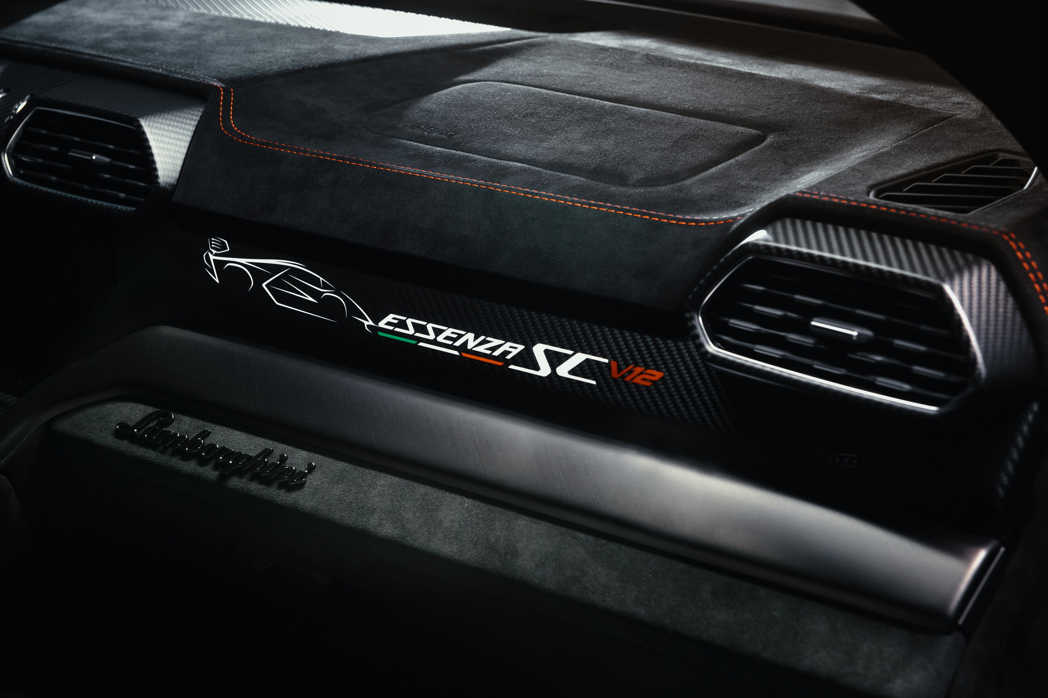 ห้องโดยสารมาในโทนสีดำ Nero Cosmus วัสดุเน้นที่ Alcantara ตกแต่งด้วยคาร์บอนไฟเบอร์เลือกแบบผิวมันหรือผิวด้านได้ มีอะลูมิเนียมอะโนไดซ์สีดำ คาร์บอนไฟเบอร์ฝั่งผู้โดยสารมาพร้อมโล้โก้และร่างเงาของ Essenza SCV12 นอกจากนี้ก็ยังมีแผ่นป้ายโลโก้ฉลองครบรอบ 60 ปี Lamborghini และอีกแผ่นป้ายจะเป็นหมายเลขรถหรือชื่อของลูกค้า