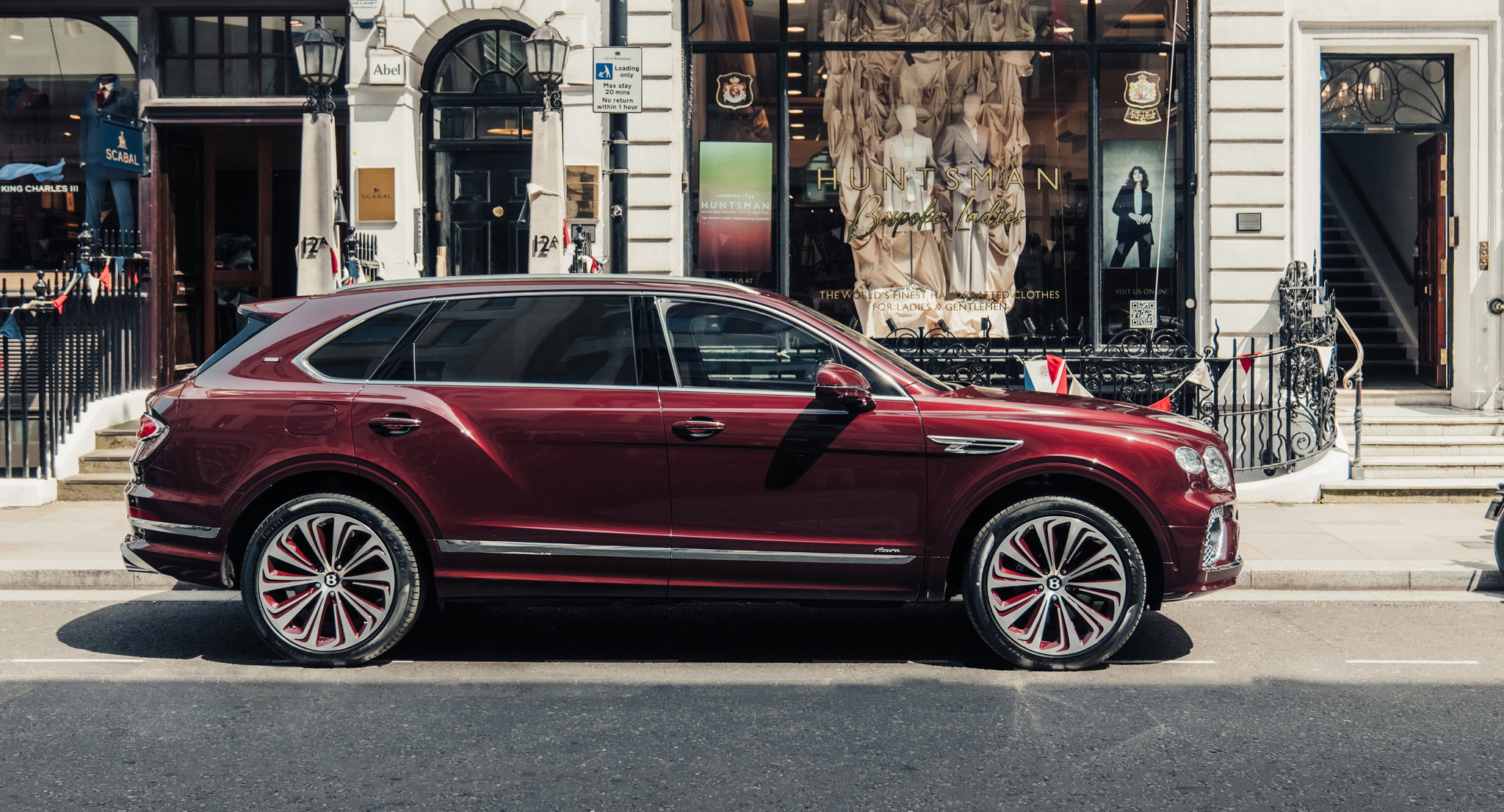 Bentayga EWB Huntsman Edition ตัวถังภายนอกเป็นสีแดงอมม่วง Burgundy กระจังหน้าโครเมียมแบบแนวตั้งเอกลักษณ์ของรุ่น EWB ล้อใส่มาขอบ 22 นิ้ว ลาย 10 ก้าน ทูโทน และติดแถบตรา Huntsman Edition ที่เสาด้านหลัง ห้องโดยสารก็พิเศษเป็นการผสมผสานด้วยผ้าทวีดจาก Huntsman กับหนังแท้สีครีม Portland และสีม่วง Damson พร้อมเบาะด้านหลังแบบ Airline Seat มีจุดนวดที่หลากหลาย ปรับได้เยอะถึง 22 ทิศทาง และเอนได้สูงสุด 40 องศา