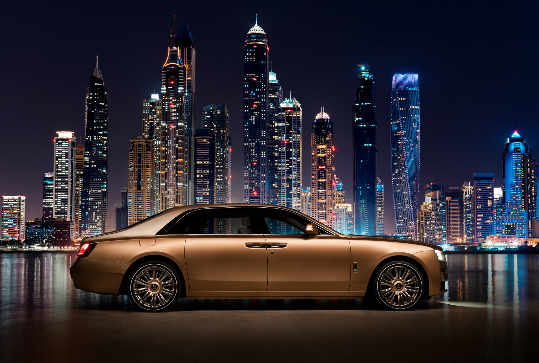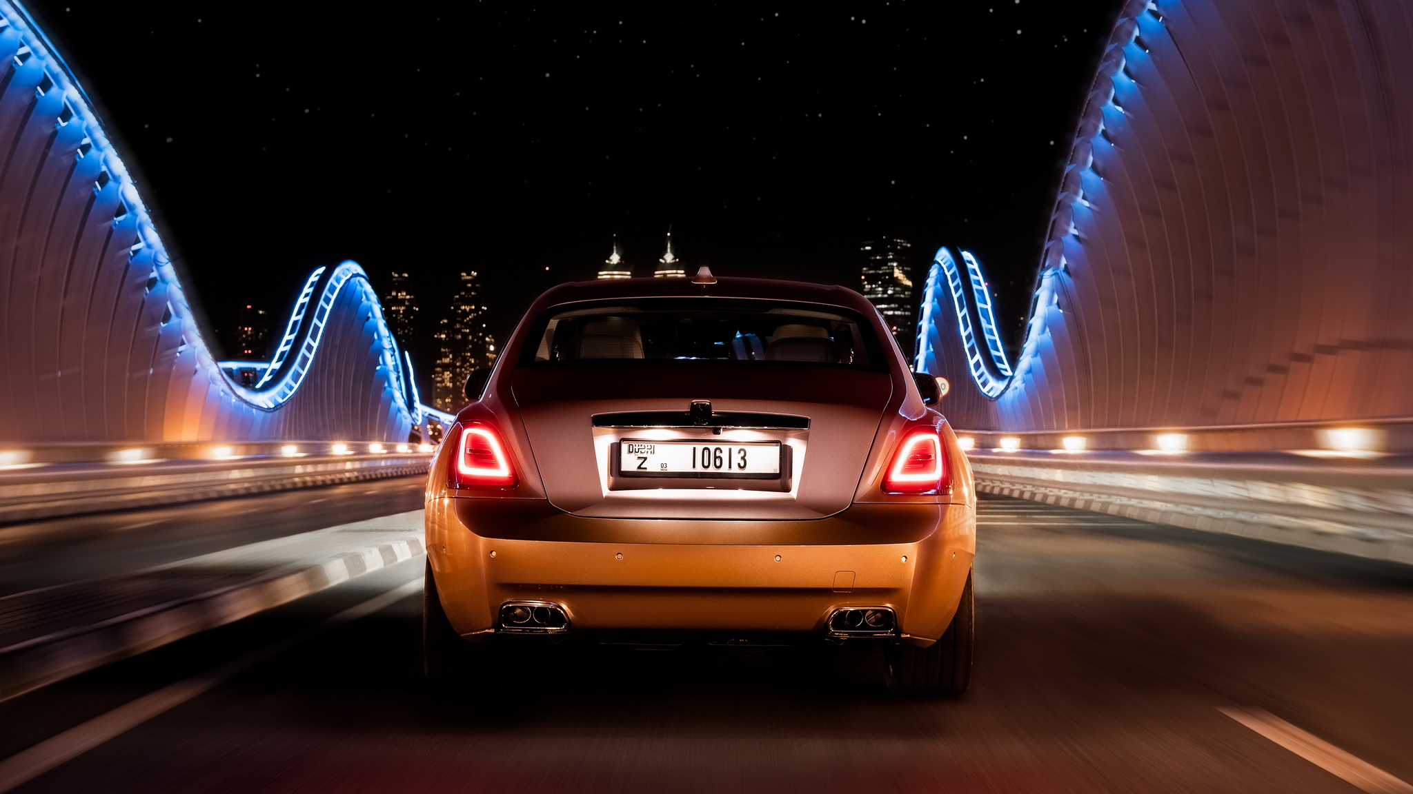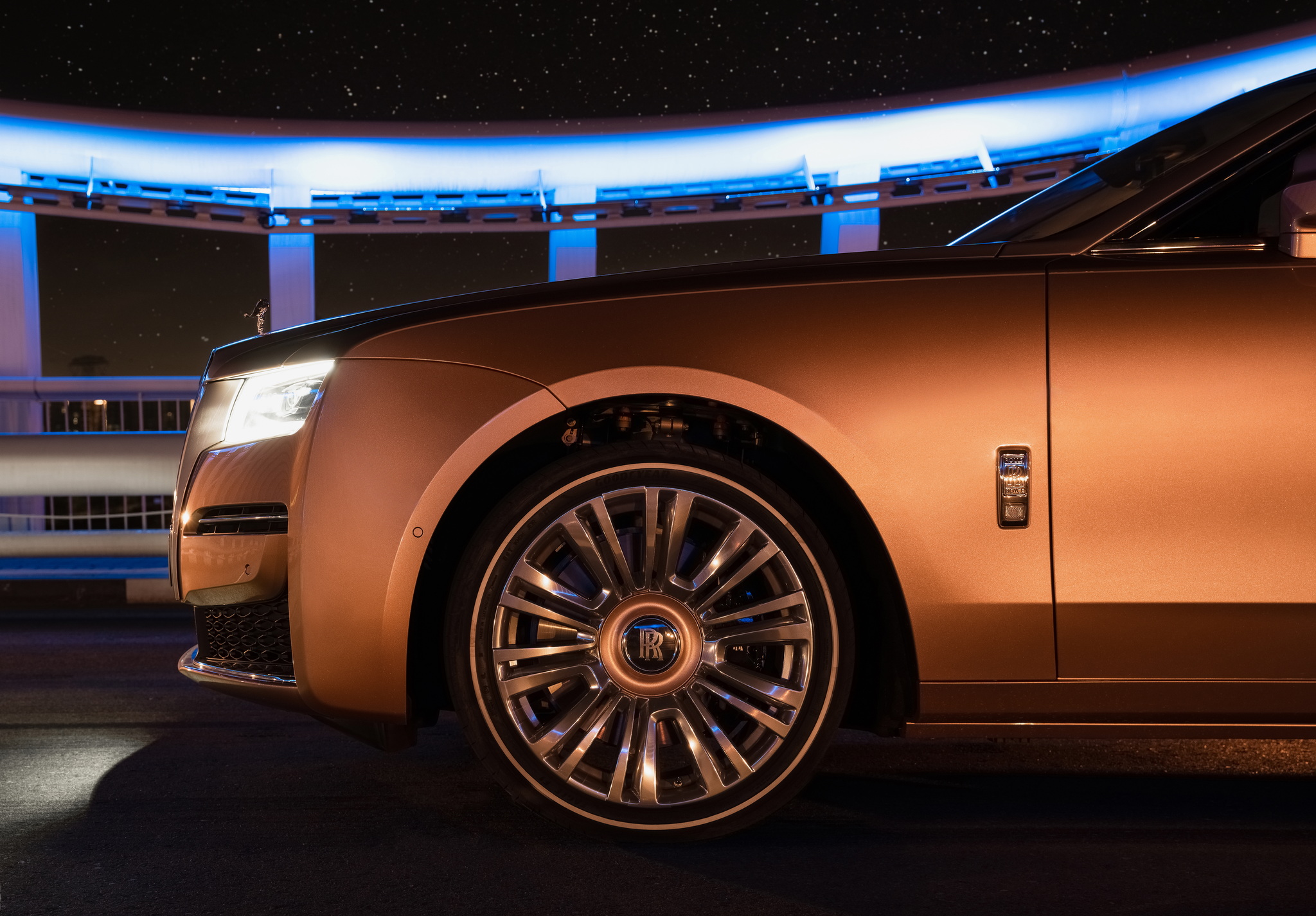 Ghost Extended คันนี้ได้แรงบันดาลใจจากความมหัศจรรย์ของพระอาทิตย์ขึ้นในตะวันออกกลางและความลึกลับของทะเลทรายอาหรับ ตัวถังภายนอกทูโทนหรูหราด้วยสีทอง Sunrise Sparkle ตัดกลางด้วยสีขาว White Sands Bespoke และเสริมเส้น Coachline วาดมือสี Moccasin ล้อใส่ขอบ 21 นิ้ว ลาย 10 ก้าน เพิ่มเส้นคาดสีทองบนแก้มยางด้วย
