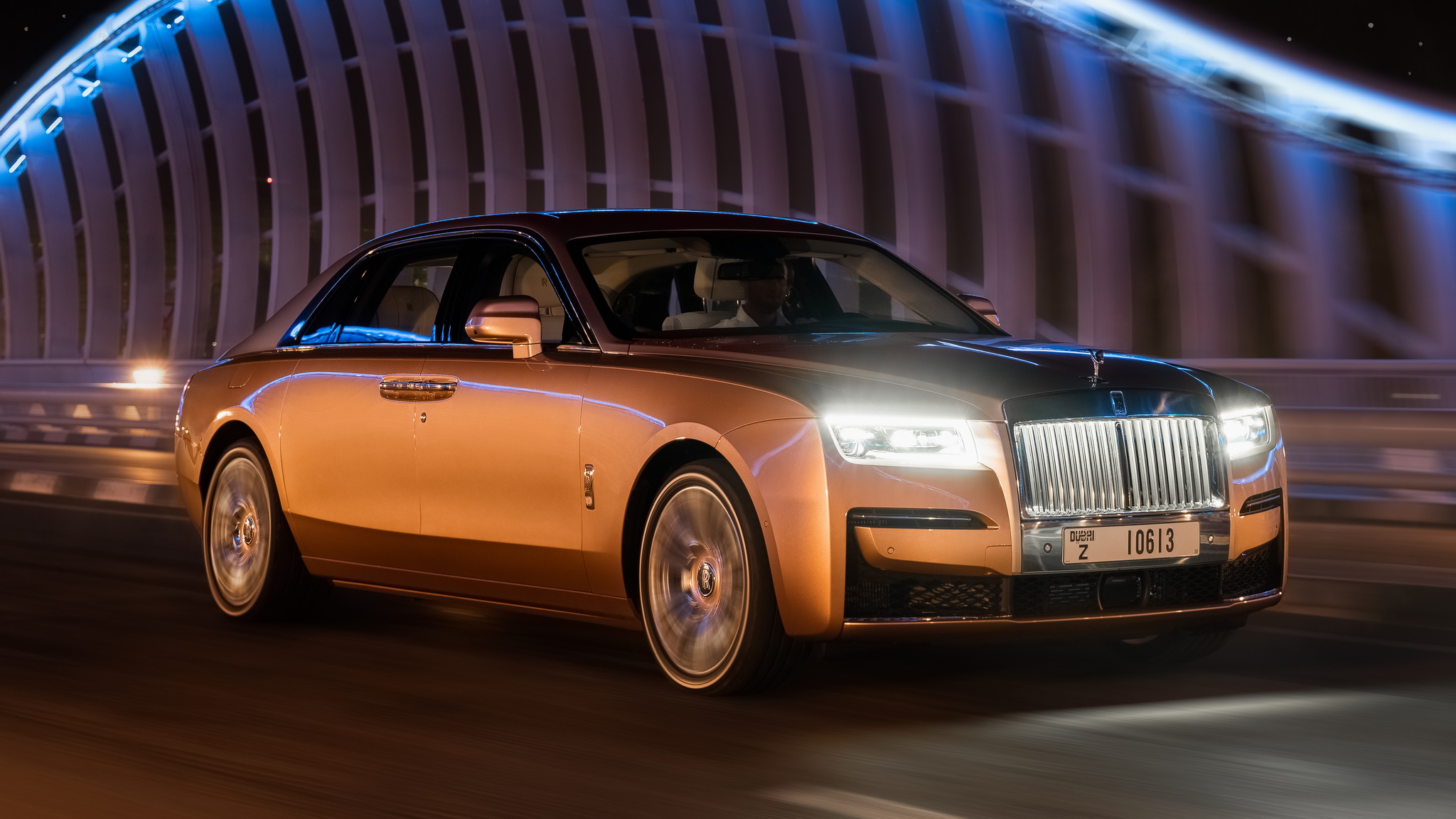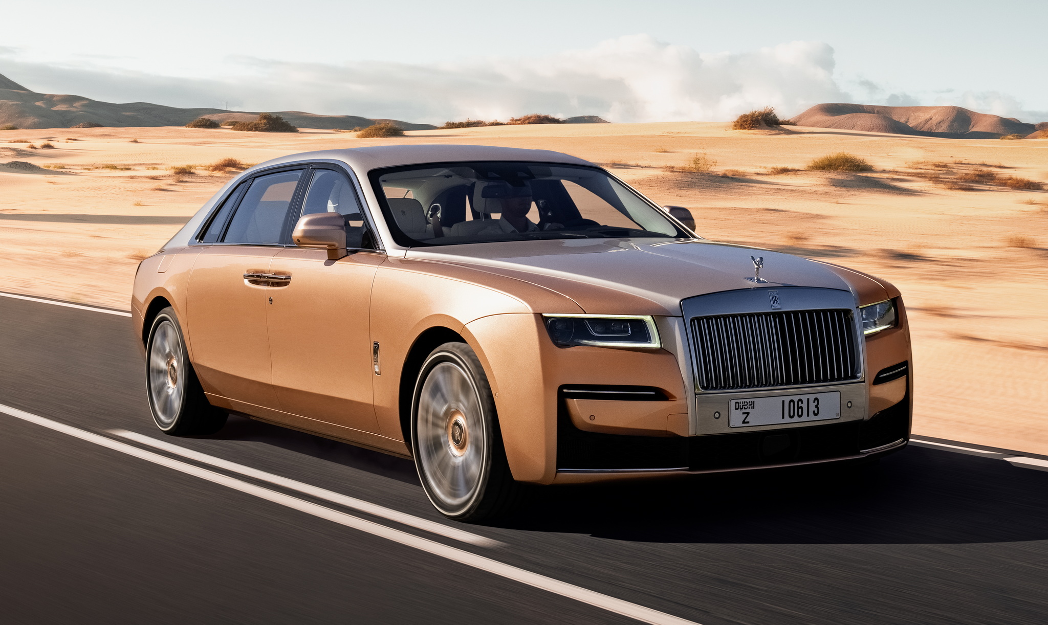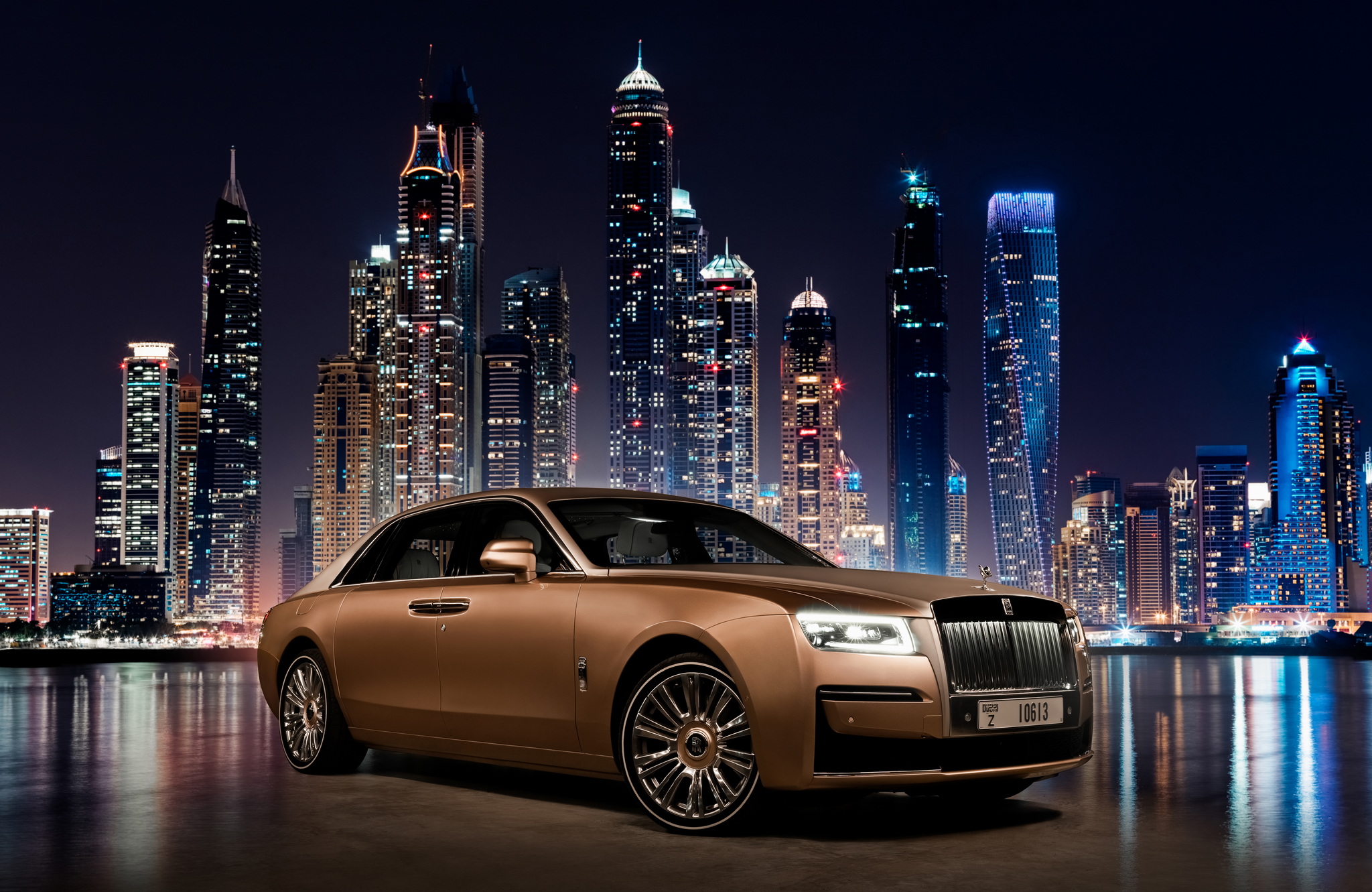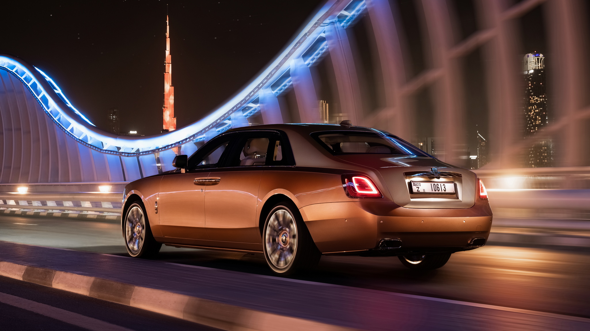Ghost Extended คันนี้ได้แรงบันดาลใจจากความมหัศจรรย์ของพระอาทิตย์ขึ้นในตะวันออกกลางและความลึกลับของทะเลทรายอาหรับ ตัวถังภายนอกทูโทนหรูหราด้วยสีทอง Sunrise Sparkle ตัดกลางด้วยสีขาว White Sands Bespoke และเสริมเส้น Coachline วาดมือสี Moccasin ล้อใส่ขอบ 21 นิ้ว ลาย 10 ก้าน เพิ่มเส้นคาดสีทองบนแก้มยางด้วย