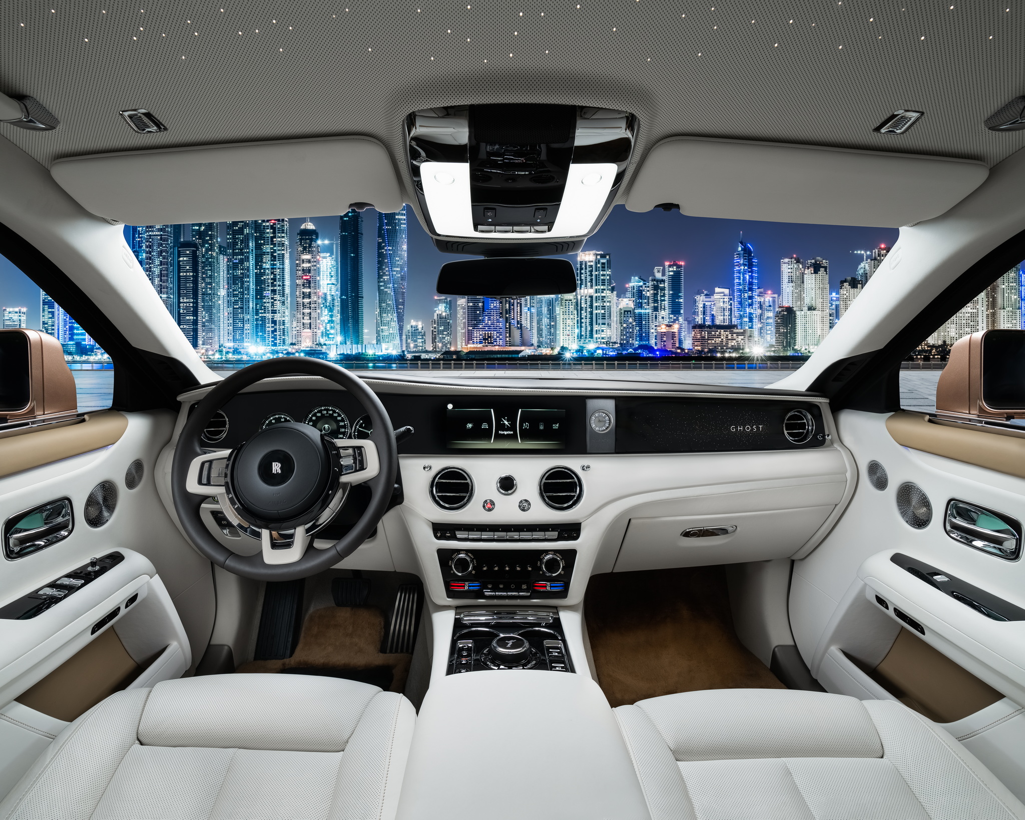 ห้องโดยสารมาแนวเรียบหรูใช้โทนหลักเป็นสีขาว Grace White แซมด้วยสี Moccasin ตามจุดต่างๆ หลังคา Starlight Headliner มาพร้อมไฟดาวตกให้เพลิดเพลิน ตรงกาบบันไดระบุความพิเศษว่าสร้างขึ้นใน Goodwood สำหรับ Private Office Dubai โดยเฉพาะ