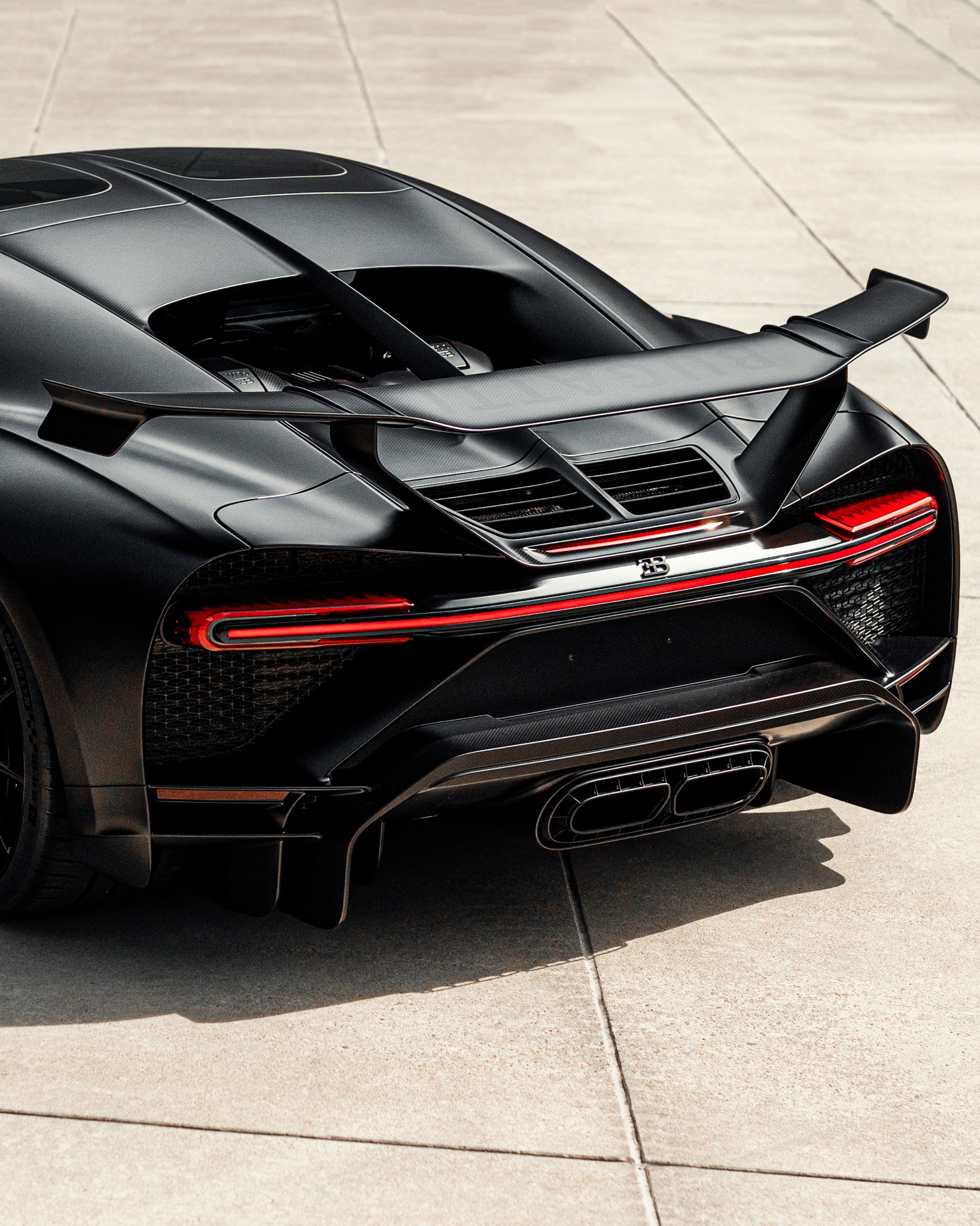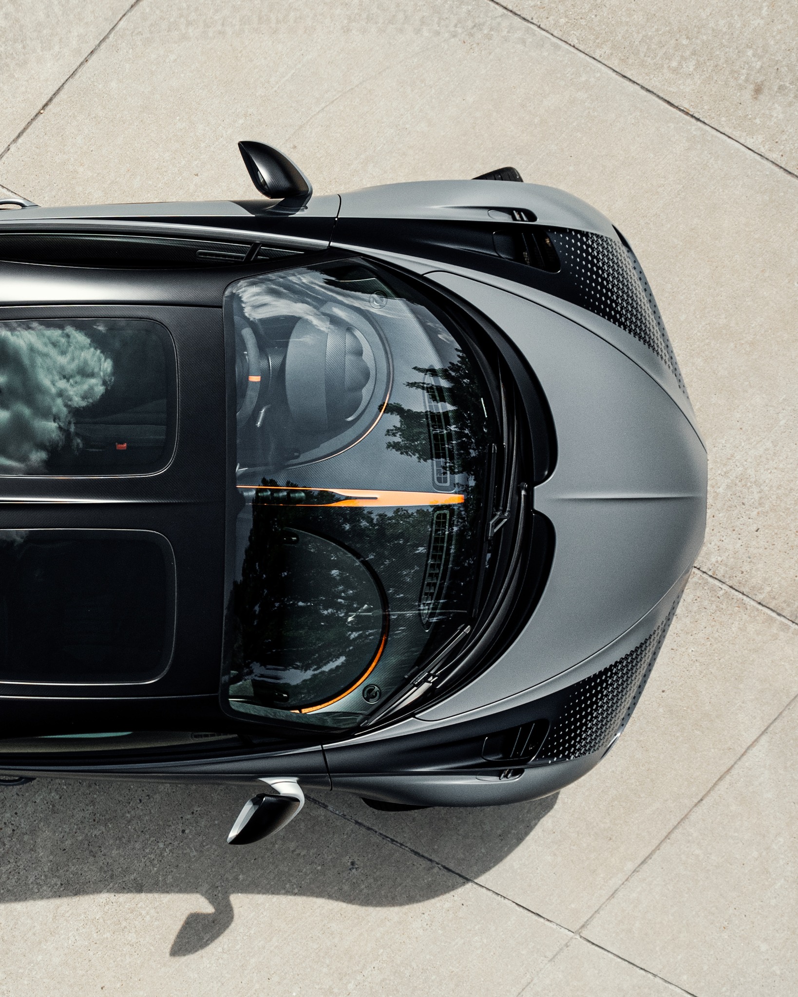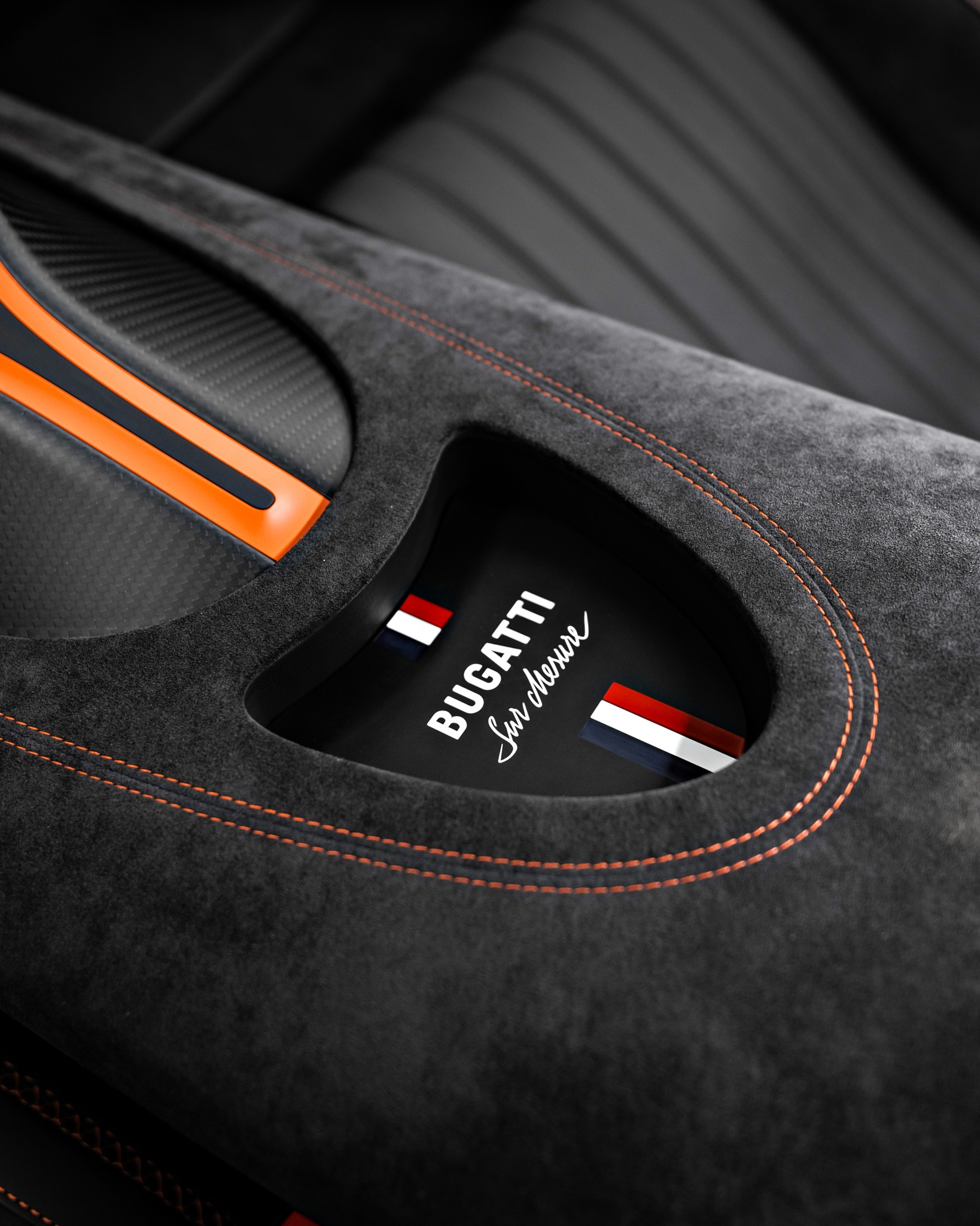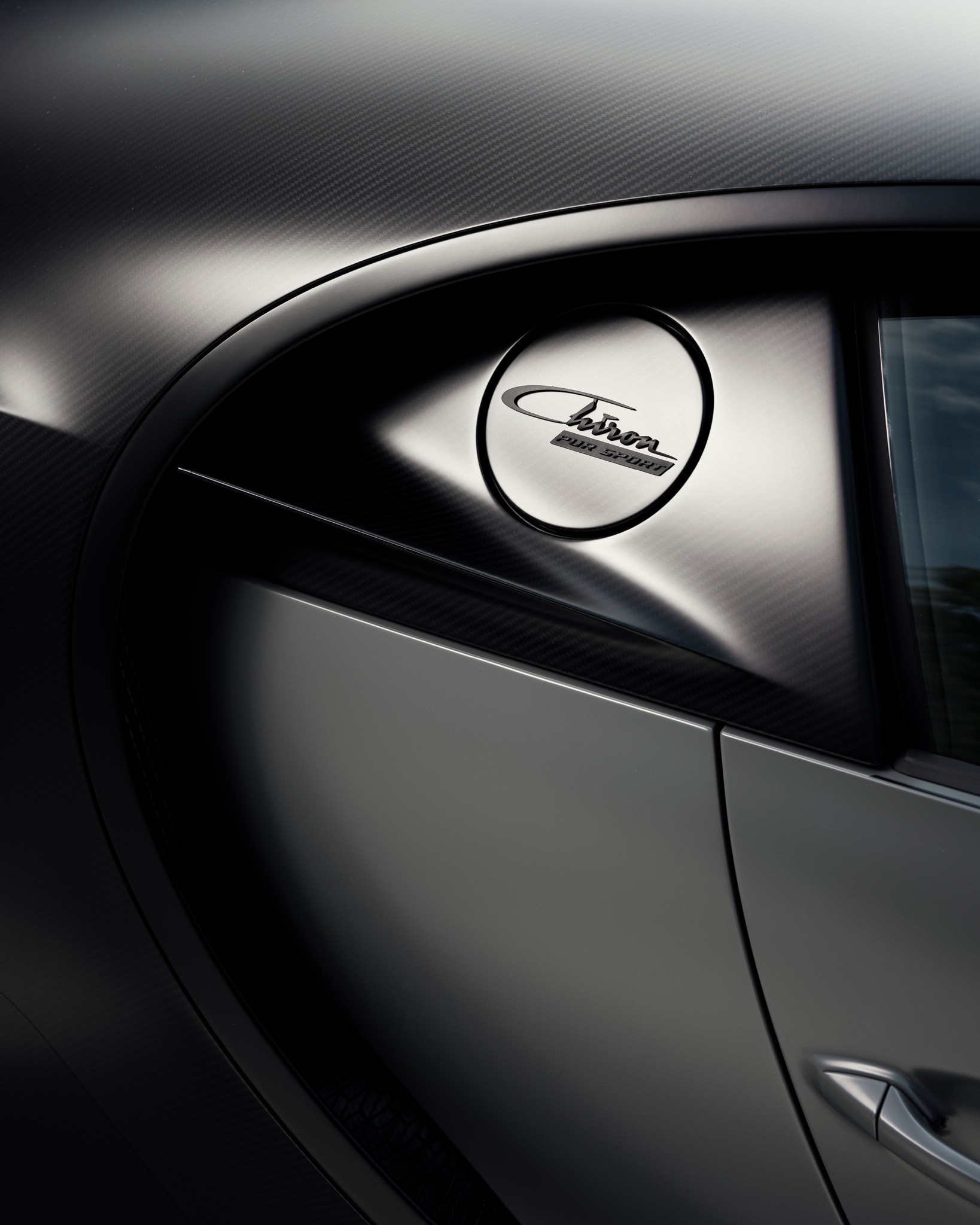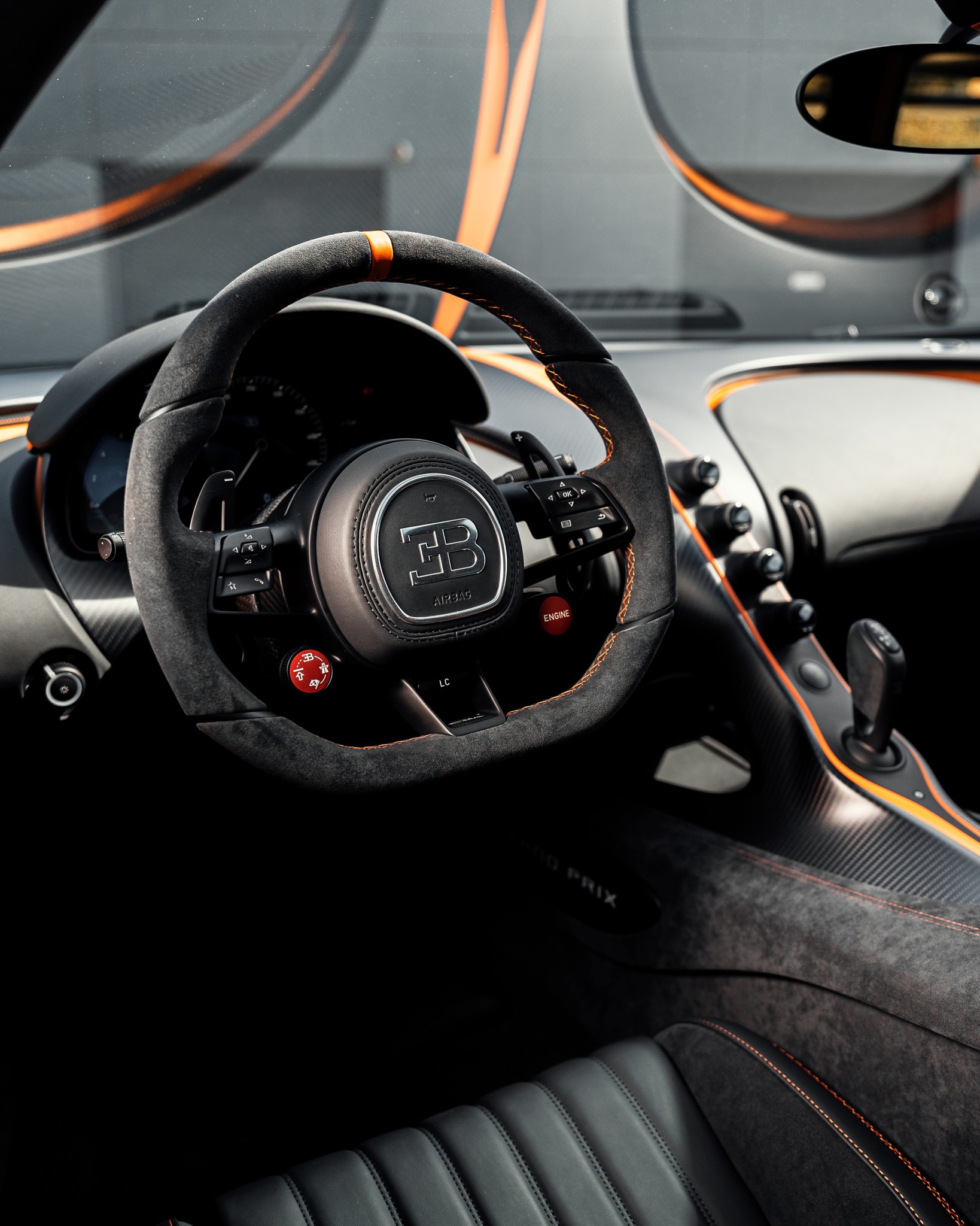 Chiron Pur Sport Grand Prix คันนี้สร้างขึ้นโดย Sur Mesure แผนกสั่งทำพิเศษของ Bugatti ส่งมอบให้ลูกค้า ณ โชว์รูม Bugatti Katowice ในโปแลนด์ ภายนอกโดดเด่นด้วยหมายเลข 32 ข้างตัวรถเป็นงานทำสี เพื่อยกย่องแก่ Bugatti Type 51 ที่ Chiron ขับจนได้ชัยชนะในปี 1931 ซึ่งติดหมายเลข 32 เช่นกัน ตัวถังแบบทูโทน Matt Black Carbon และ Matt Jet Grey เสริมลูกเล่นด้วยลายโลโก้ EB ขนาดเล็กจำนวนมากไล่เฉดสวยงามเป็นงานทำมือ