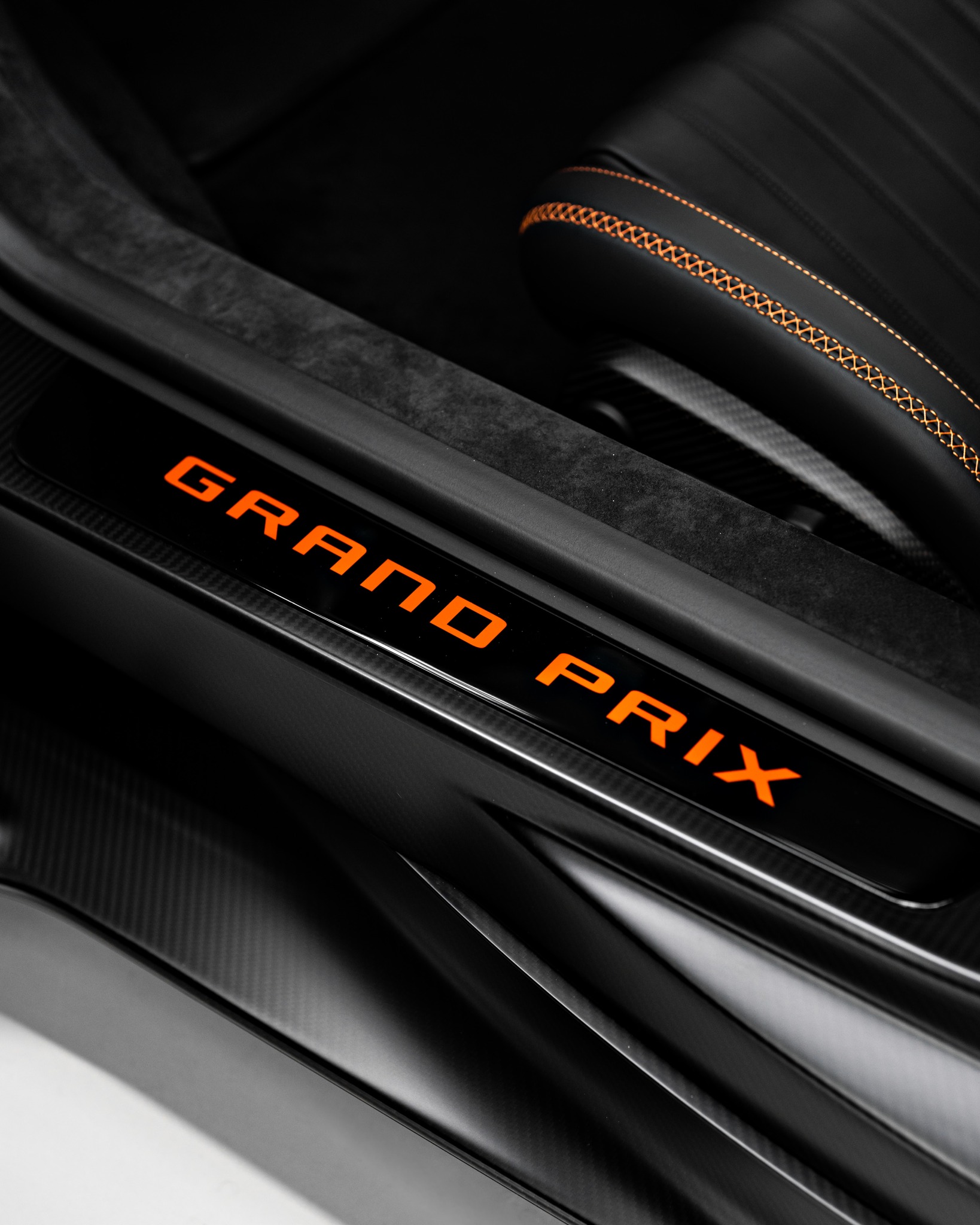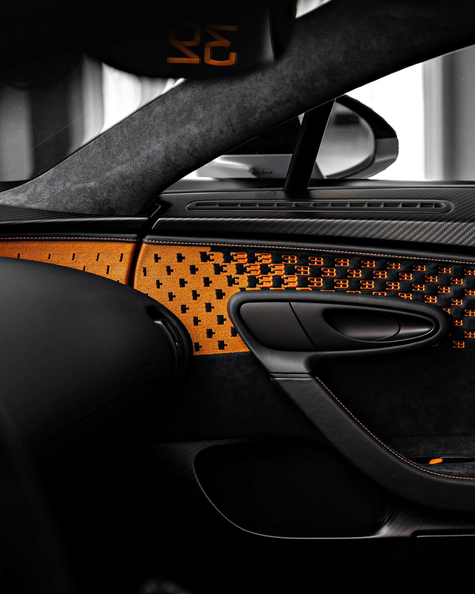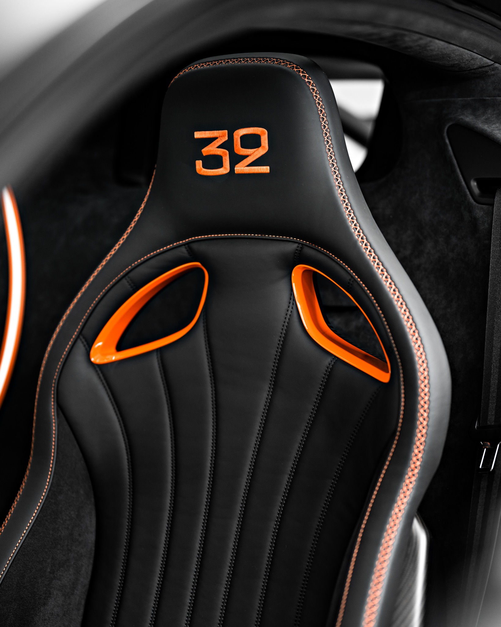 ห้องโดยสารทำพิเศษ โดยรวมมาในโทนสีดำ Beluga Black ตัดกับส้ม Tangerine วัสดุเน้นหนังแท้, Alcantara และคาร์บอนไฟเบอร์ผิวด้าน แผงข้างประตูเพิ่มลวดลายโลโก้ EB ตัดเย็บมีเลเยอร์หรูหรา หมายเลข 32 พบได้บนพนักพิงศรีษะ