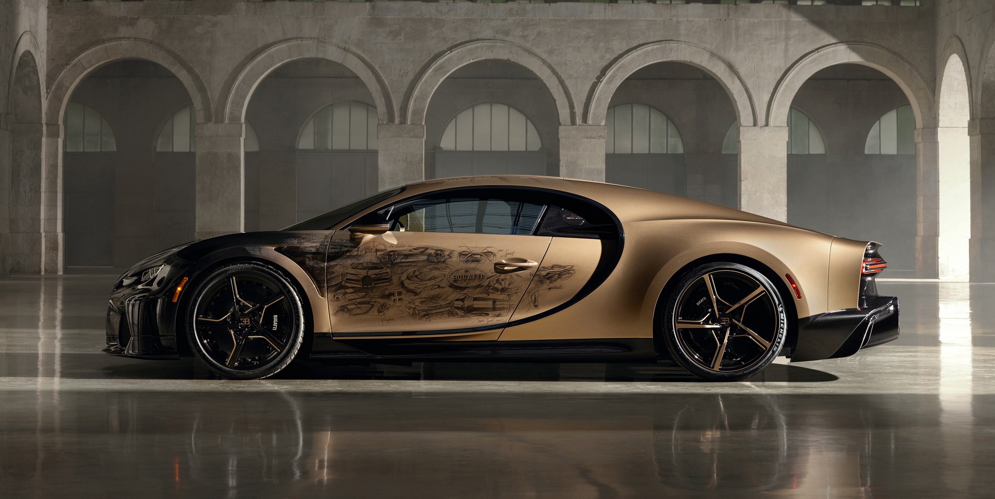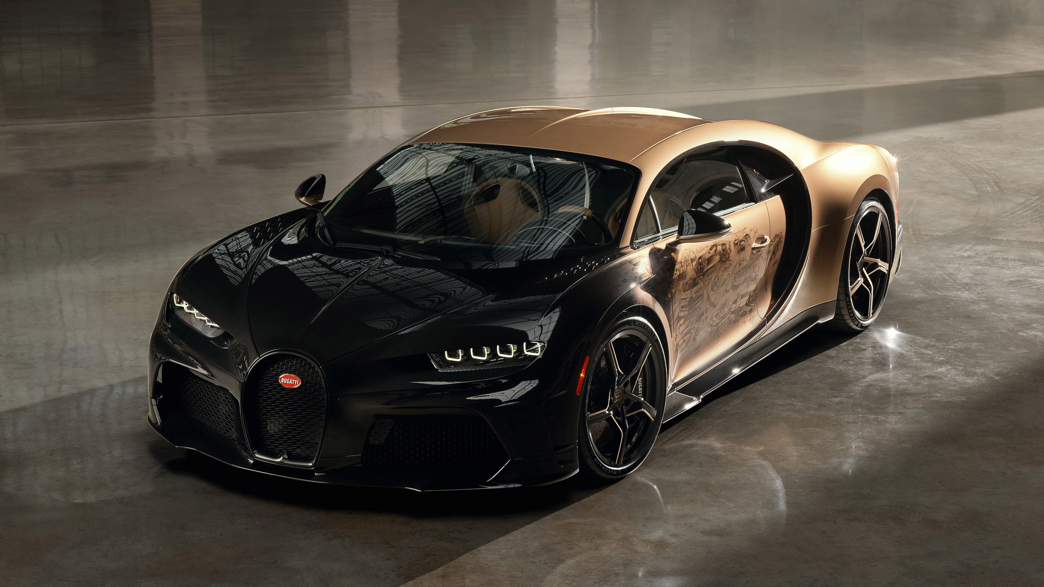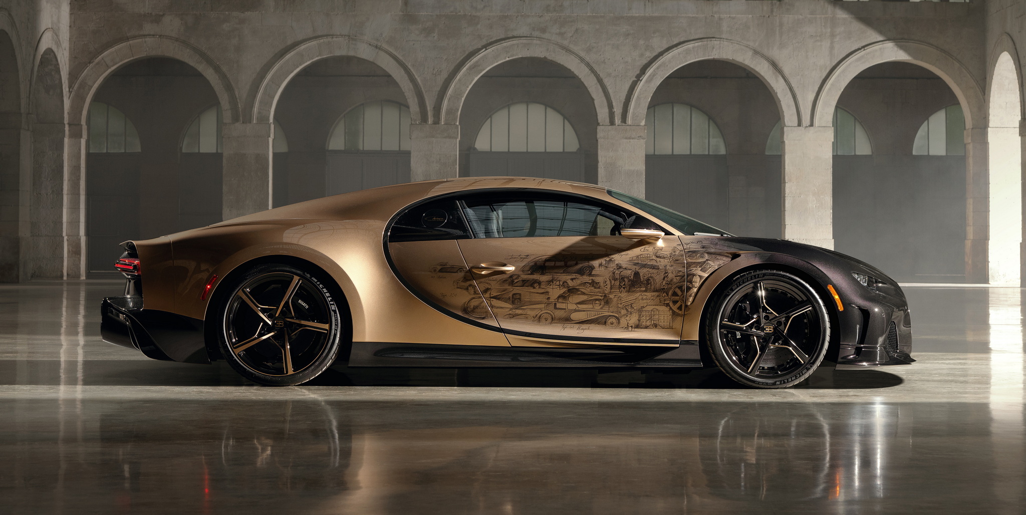 นี่คือ Chiron Super Sport "Golden Era" (ยุคทอง) ทำพิเศษหนึ่งเดียวจากทั้งหมด 80 คัน ซึ่งมีการร่วมมือออกแบบกับลูกค้าโดยตรงผ่านแผนก Sur Mesure ใช้เวลาสร้างกว่า 2 ปี แนวคิดเพื่อให้รถคันนี้เป็นเหมือนตัวบันทึกประวัติศาสตร์ช่วงเวลาสำคัญของบูกัตติ ตัวถังภายนอกเป็นงานเฉดสีไล่ระดับ หน้ารถจะเข้มสุดด้วยสีดำเมทัลลิคพิเศษ Nocturne Black จนไล่เฉดไปเป็นสีทอง Doré อันหรูหรา และแน่นอนจุดเด่นอยู่ที่บานประตูทั้งสองฝั่งที่มีงานวาดด้วยมือ เป็นการรวมรถบูกัตติไว้ 26 คัน แสดงถึงต้นกำเนิดของแบรนด์และรถยนต์อย่าง Type 57 SC Atlantic และ Type 41 Royale อีกฝั่งมี EB110, Veyron, Chiron จนไปจบที่ Bolide งานวาดเหล่านี้ต้องใช้เวลากว่า 400 ชม. ทีเดียว