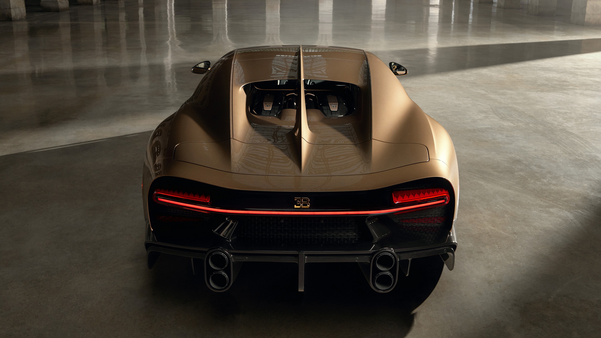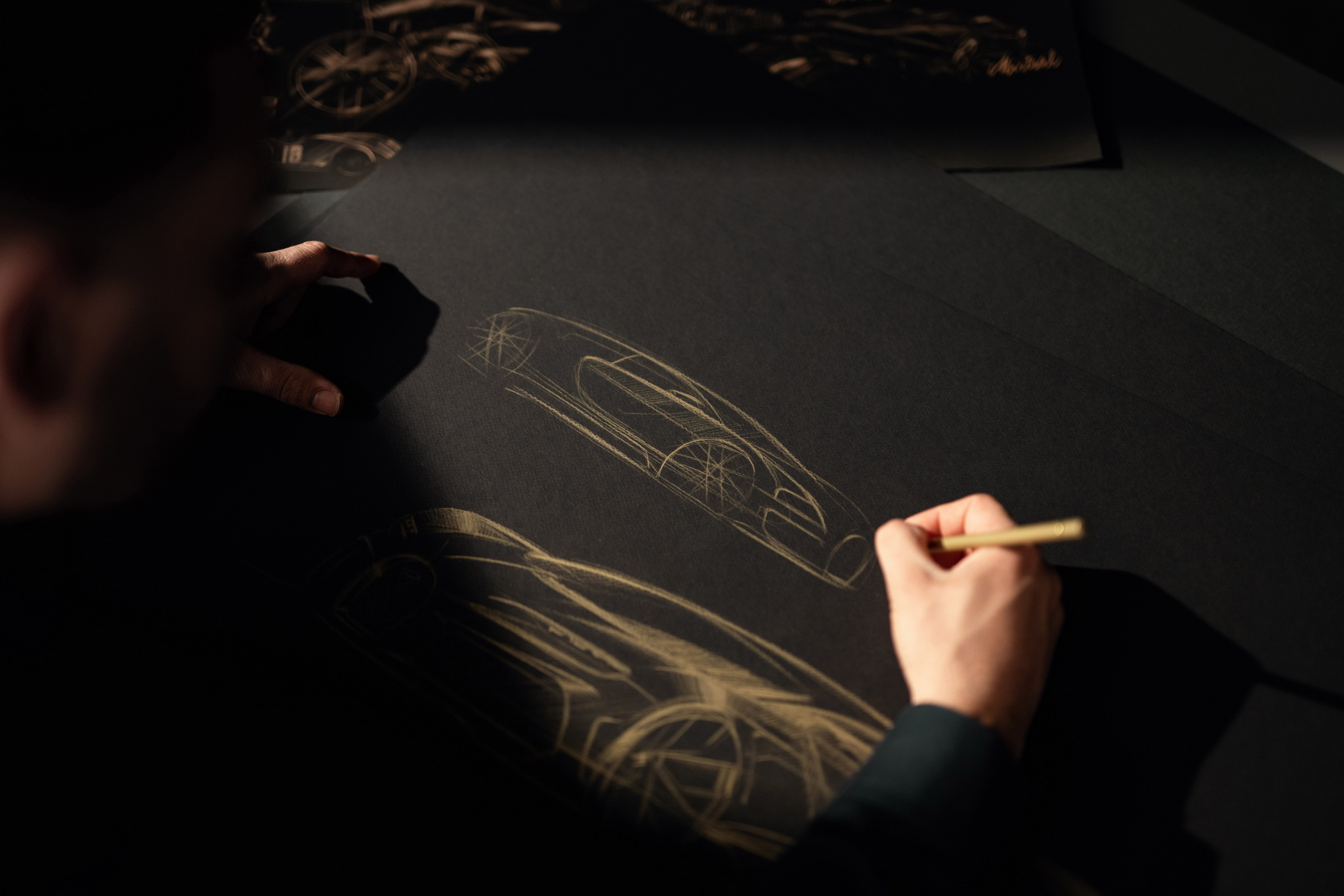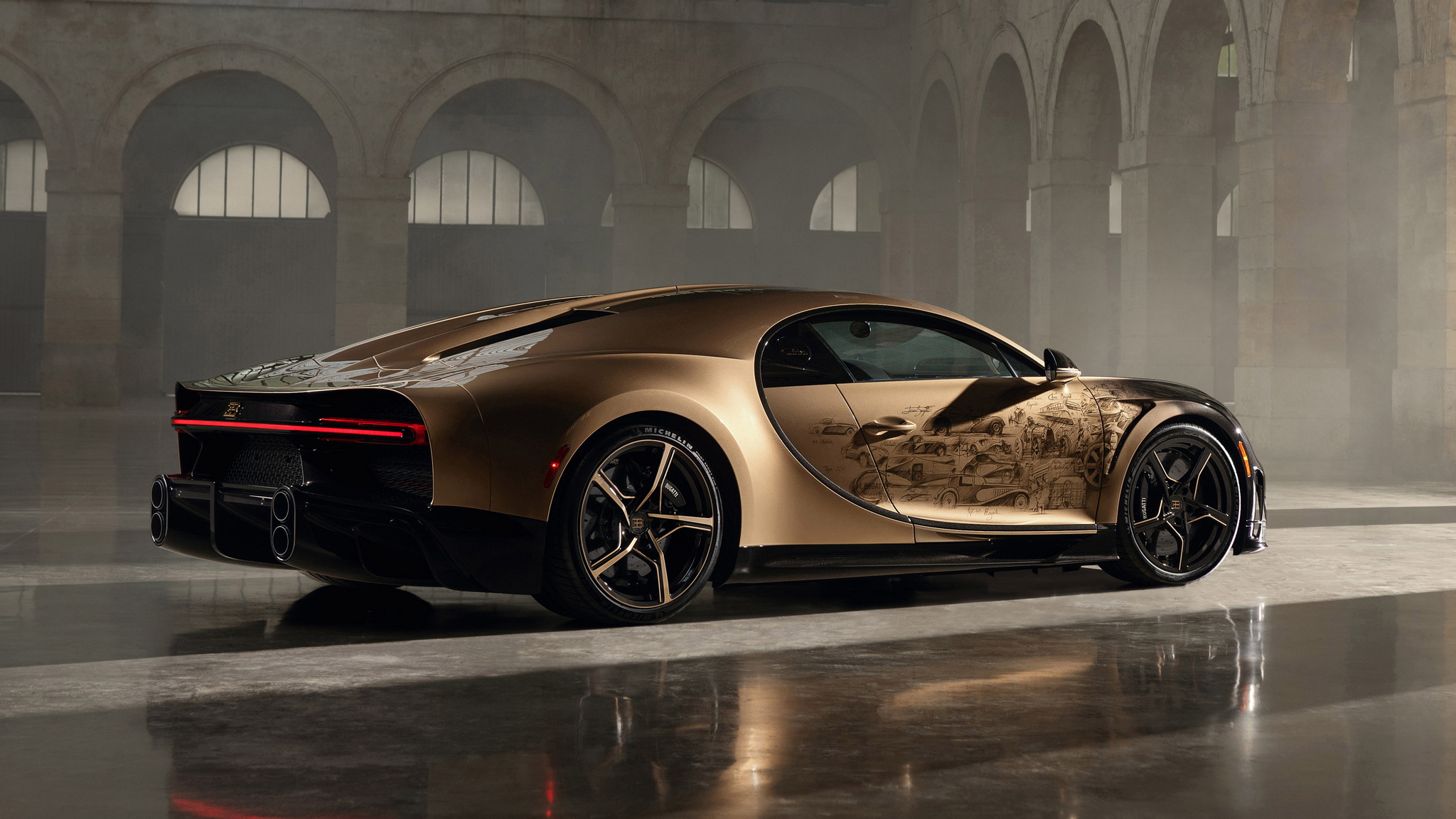 นี่คือ Chiron Super Sport "Golden Era" (ยุคทอง) ทำพิเศษหนึ่งเดียวจากทั้งหมด 80 คัน ซึ่งมีการร่วมมือออกแบบกับลูกค้าโดยตรงผ่านแผนก Sur Mesure ใช้เวลาสร้างกว่า 2 ปี แนวคิดเพื่อให้รถคันนี้เป็นเหมือนตัวบันทึกประวัติศาสตร์ช่วงเวลาสำคัญของบูกัตติ ตัวถังภายนอกเป็นงานเฉดสีไล่ระดับ หน้ารถจะเข้มสุดด้วยสีดำเมทัลลิคพิเศษ Nocturne Black จนไล่เฉดไปเป็นสีทอง Doré อันหรูหรา และแน่นอนจุดเด่นอยู่ที่บานประตูทั้งสองฝั่งที่มีงานวาดด้วยมือ เป็นการรวมรถบูกัตติไว้ 26 คัน แสดงถึงต้นกำเนิดของแบรนด์และรถยนต์อย่าง Type 57 SC Atlantic และ Type 41 Royale อีกฝั่งมี EB110, Veyron, Chiron จนไปจบที่ Bolide งานวาดเหล่านี้ต้องใช้เวลากว่า 400 ชม. ทีเดียว