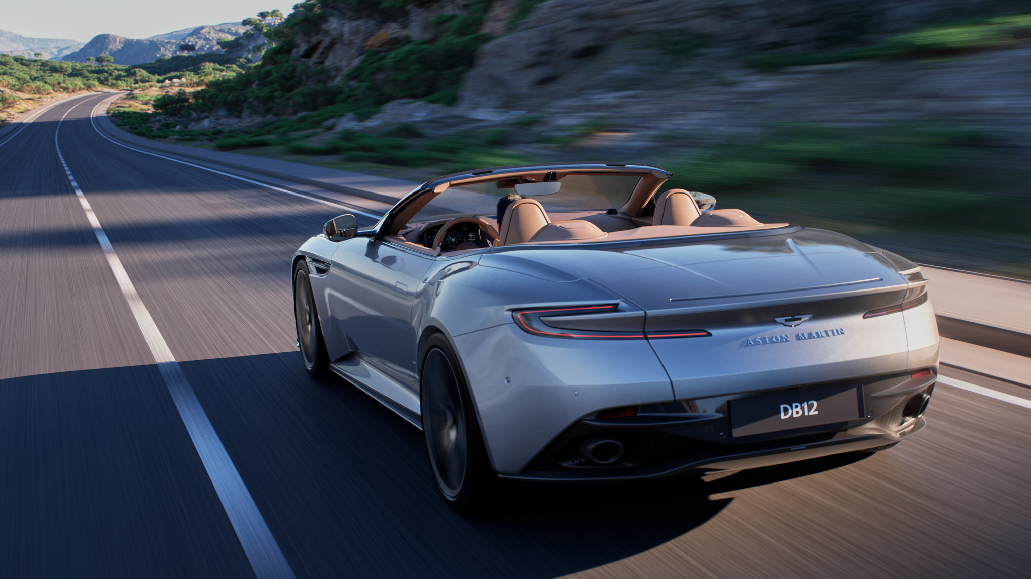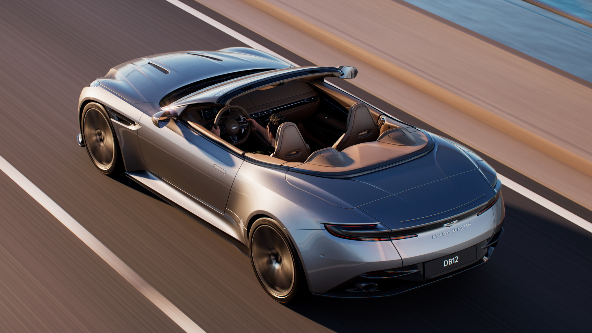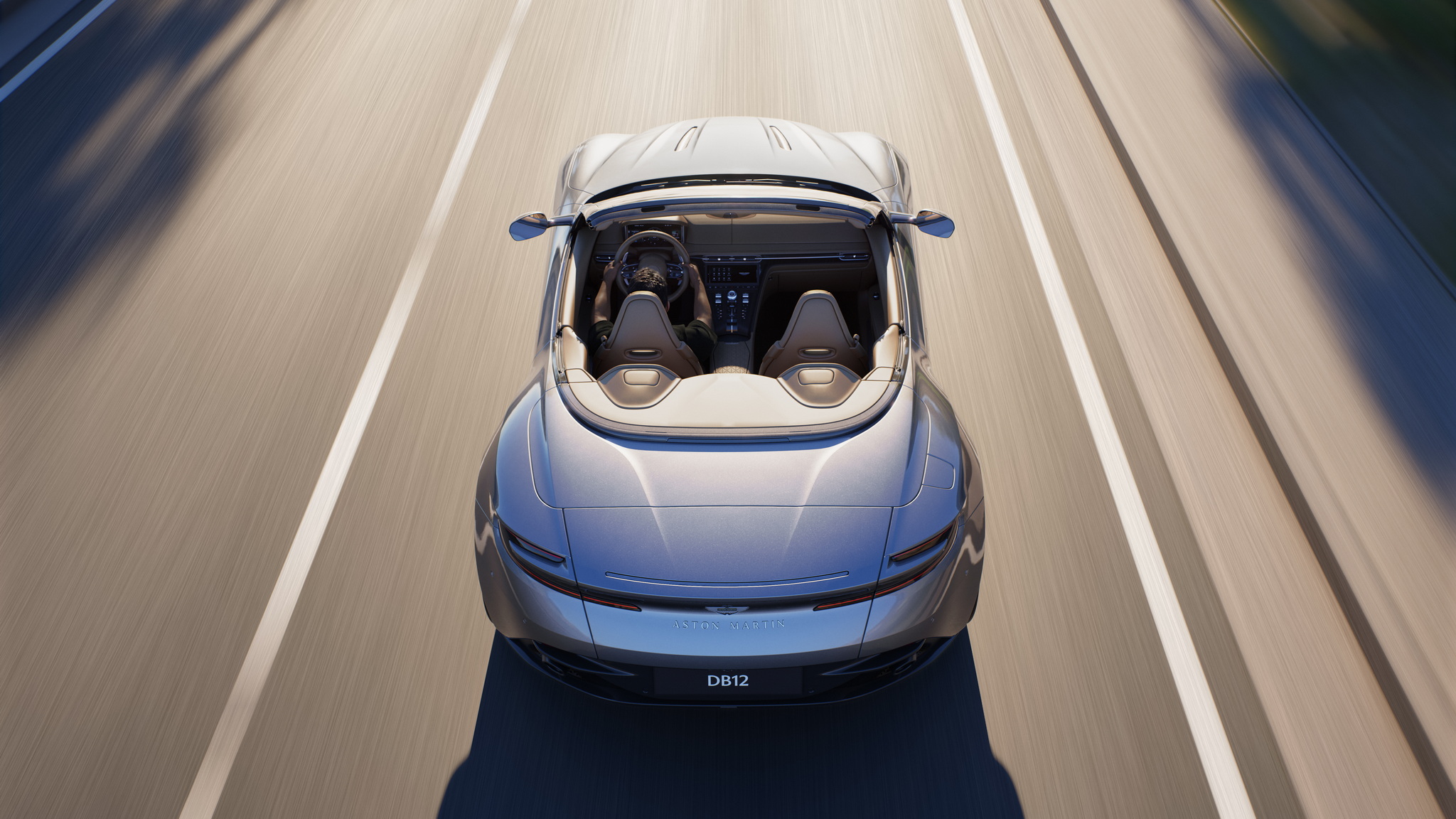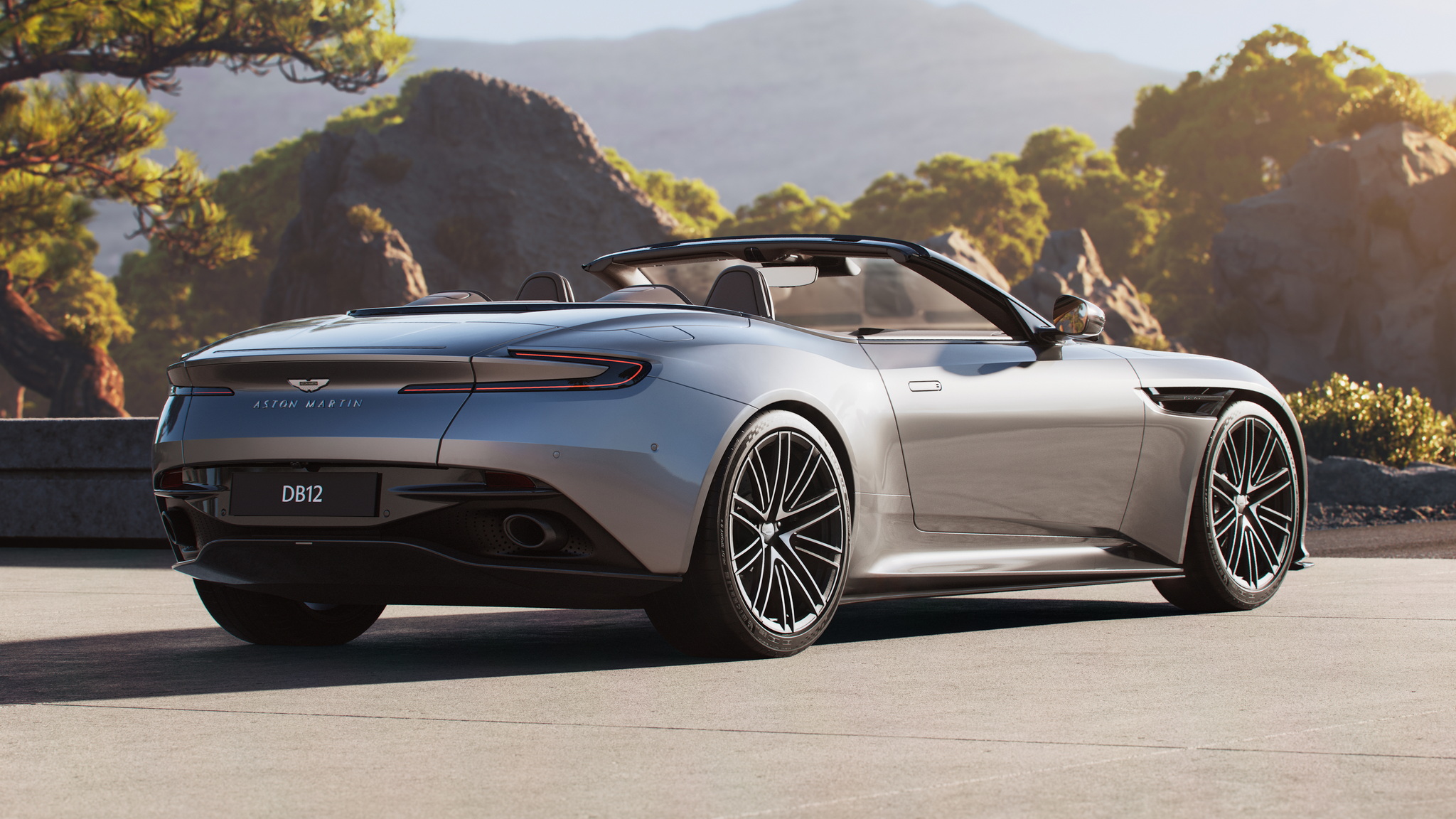 DB12 Volante เปิดประทุนใหม่ล่าสุด มากับหลังคาผ้าใบไฟฟ้า ใช้เวลาเปิด 14 วินาที ปิด 16 วินาที ใช้งานได้ที่ความเร็วไม่เกิน 31 ไมล์/ชม. กลไกแบบ K-fold ถูกออกแบบเพรียวบาง ช่วยเพิ่มความความจุสัมภาระท้ายได้ดีขึ้น ใต้หลังคาบุฉนวนกันความร้อน 8 ชั้น ปรับปรุงด้านเสียงเพื่อความเงียบสงบภายในห้องโดยสาร ตัวรถดีไซน์ดุดันไม่ต่างจาก Coupe เช่น กระจังหน้าที่ใหญ่ขึ้น 56% จาก DB11 แทร็กล้อขยายกว้างขึ้นด้านหน้า 0.24 นิ้ว (6 มม.) และด้านหลัง 0.87 นิ้ว (22 มม.) ช่วงล่างปรับปรุงใหม่ไม่เน้นนุ่ม ล้ออัลลอยฟอร์จให้มามาตราฐาน 21 นิ้ว ควบคู่ยาง Michelin Pilot Sport 5 S สั่งทำพิเศษเฉพาะ DB12 มีรหัส 'AML' กำกับไว้บนแก้มยาง เบรกมาตรฐานเป็นจานเหล็ก ด้านหน้าขนาด 400 มม. คาลิปเปอร์ 6 สูบ จานหลัง 360 มม. คาลิปเปอร์ 4 สูบ พร้อมออฟชั่นเสริมเป็นจานจานคาร์บอน-เซรามิค เบรกดีทนความร้อนสูงกว่า และลดน้ำหนักใต้สปริงถึง 27 กก. เมื่อเทียบกับของเดิม