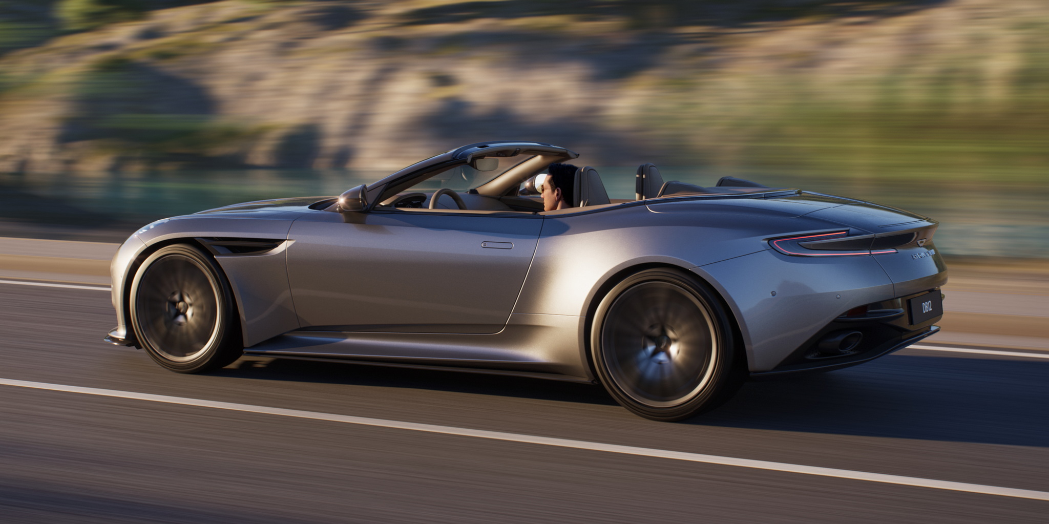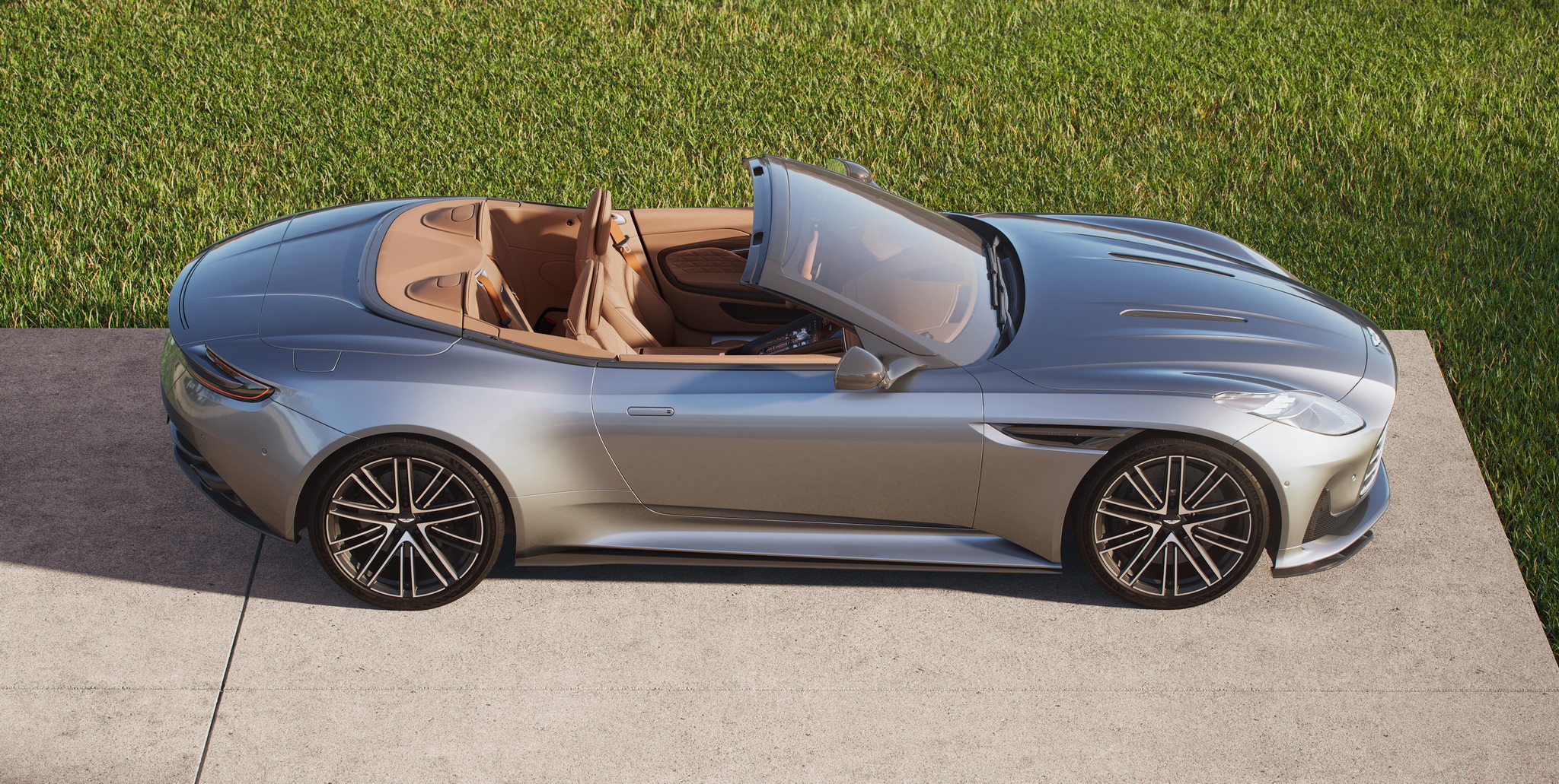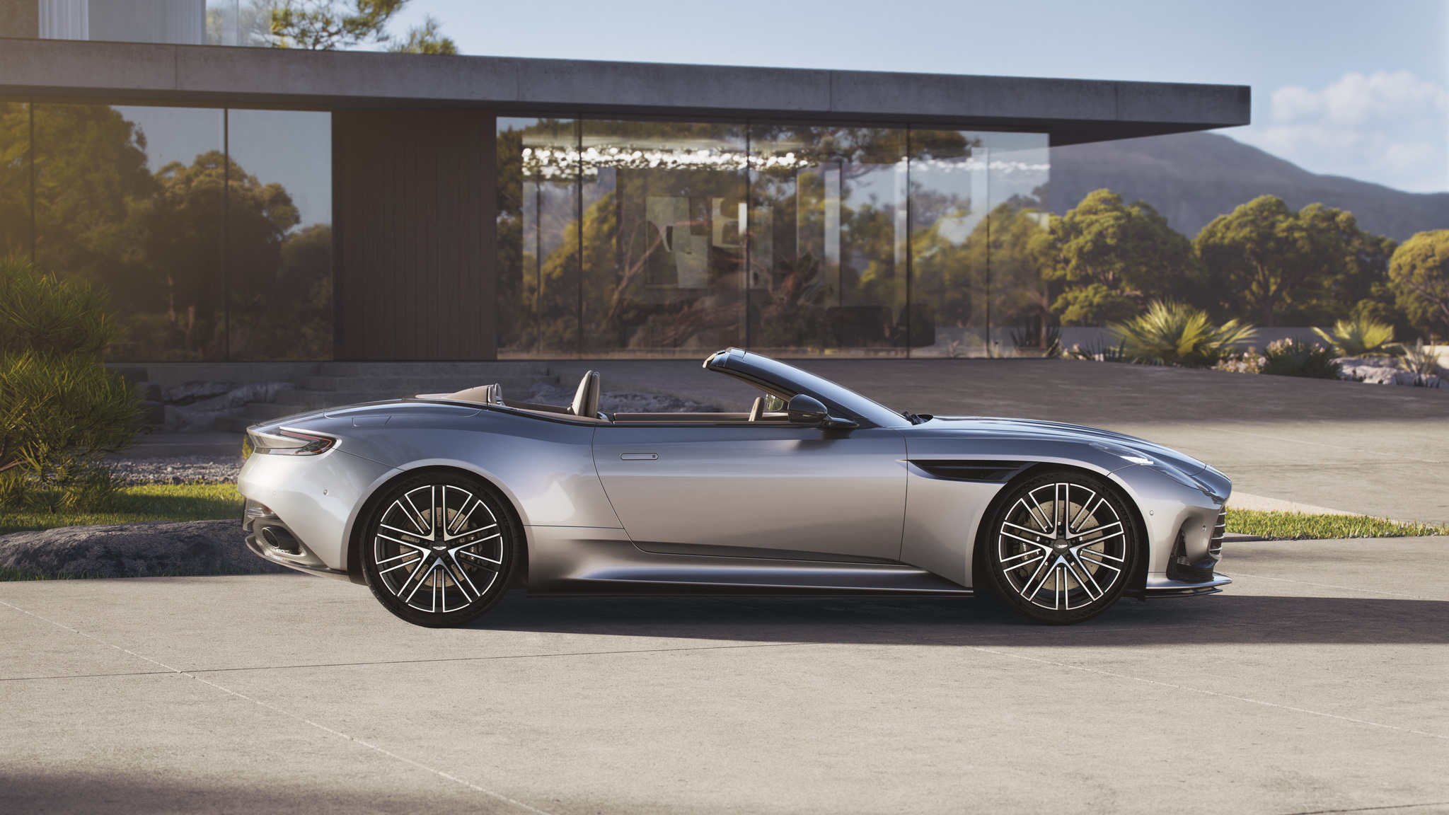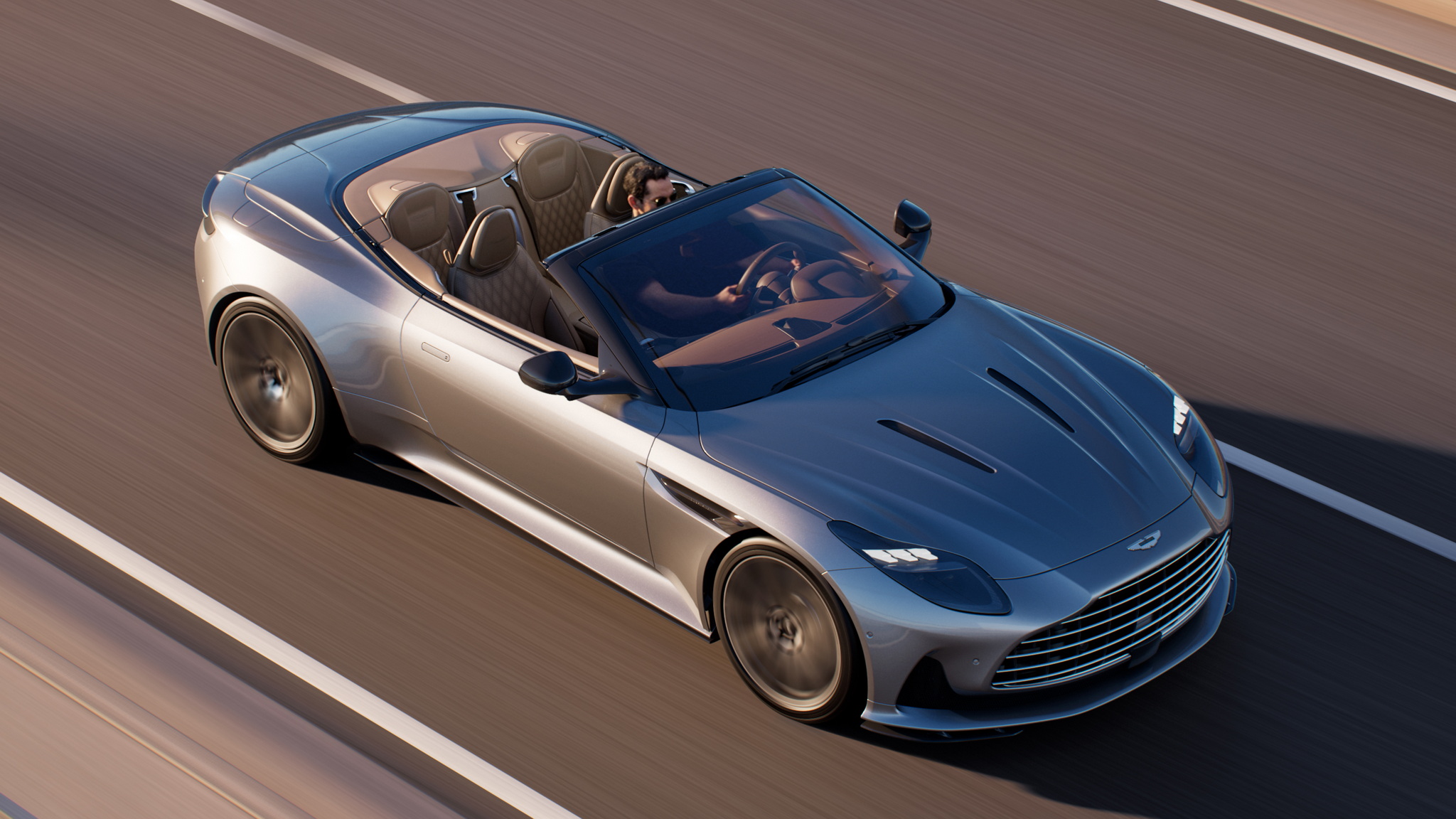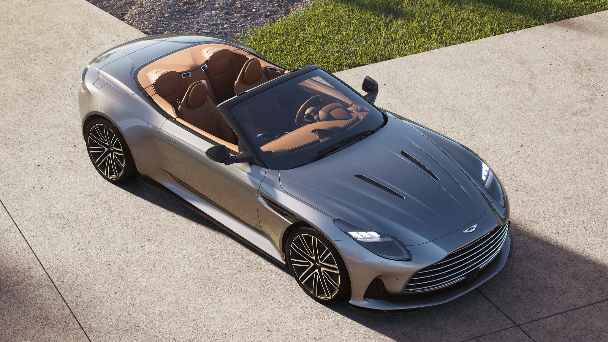 DB12 Volante เปิดประทุนใหม่ล่าสุด มากับหลังคาผ้าใบไฟฟ้า ใช้เวลาเปิด 14 วินาที ปิด 16 วินาที ใช้งานได้ที่ความเร็วไม่เกิน 31 ไมล์/ชม. กลไกแบบ K-fold ถูกออกแบบเพรียวบาง ช่วยเพิ่มความความจุสัมภาระท้ายได้ดีขึ้น ใต้หลังคาบุฉนวนกันความร้อน 8 ชั้น ปรับปรุงด้านเสียงเพื่อความเงียบสงบภายในห้องโดยสาร ตัวรถดีไซน์ดุดันไม่ต่างจาก Coupe เช่น กระจังหน้าที่ใหญ่ขึ้น 56% จาก DB11 แทร็กล้อขยายกว้างขึ้นด้านหน้า 0.24 นิ้ว (6 มม.) และด้านหลัง 0.87 นิ้ว (22 มม.) ช่วงล่างปรับปรุงใหม่ไม่เน้นนุ่ม ล้ออัลลอยฟอร์จให้มามาตราฐาน 21 นิ้ว ควบคู่ยาง Michelin Pilot Sport 5 S สั่งทำพิเศษเฉพาะ DB12 มีรหัส 'AML' กำกับไว้บนแก้มยาง เบรกมาตรฐานเป็นจานเหล็ก ด้านหน้าขนาด 400 มม. คาลิปเปอร์ 6 สูบ จานหลัง 360 มม. คาลิปเปอร์ 4 สูบ พร้อมออฟชั่นเสริมเป็นจานจานคาร์บอน-เซรามิค เบรกดีทนความร้อนสูงกว่า และลดน้ำหนักใต้สปริงถึง 27 กก. เมื่อเทียบกับของเดิม