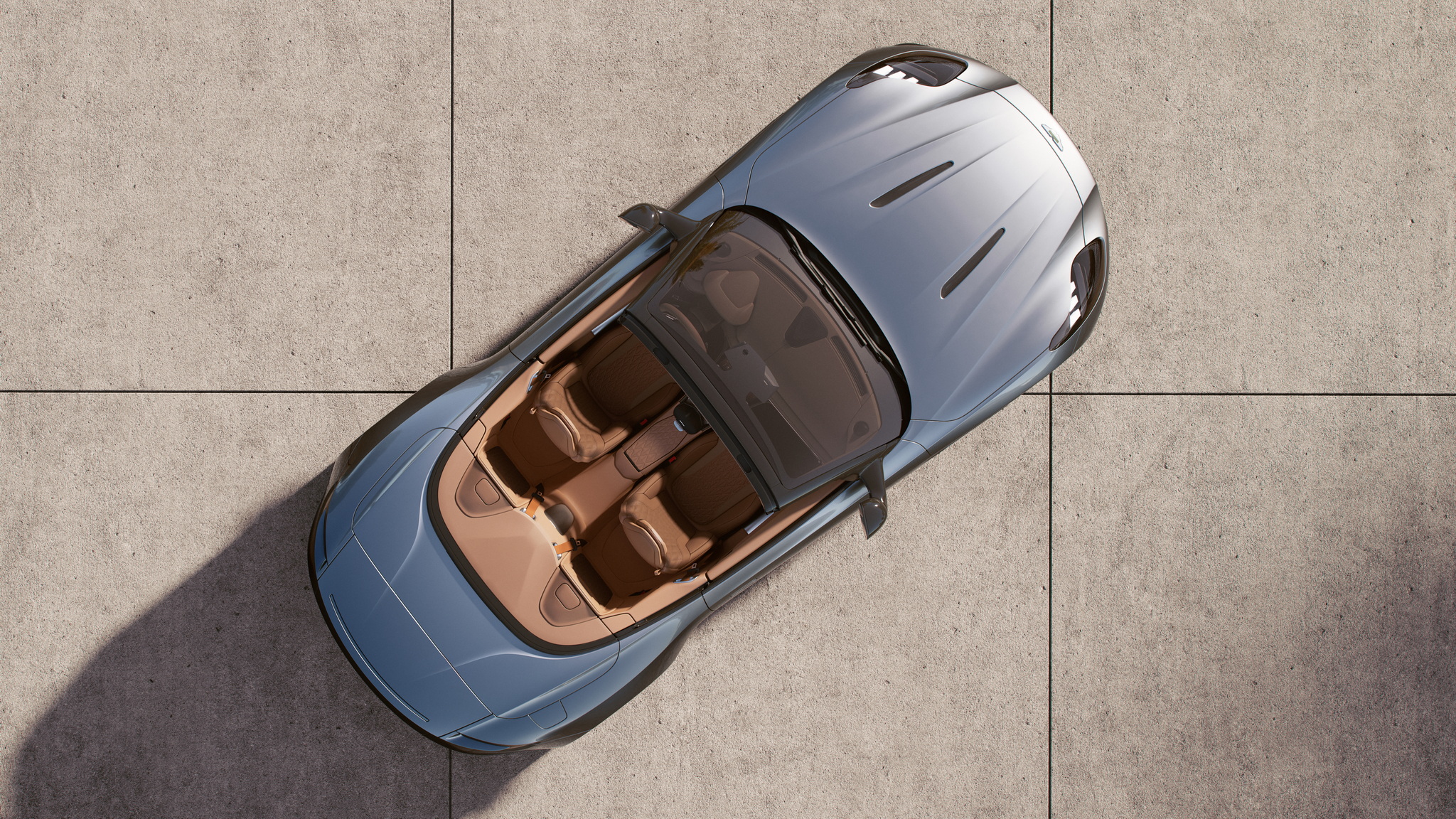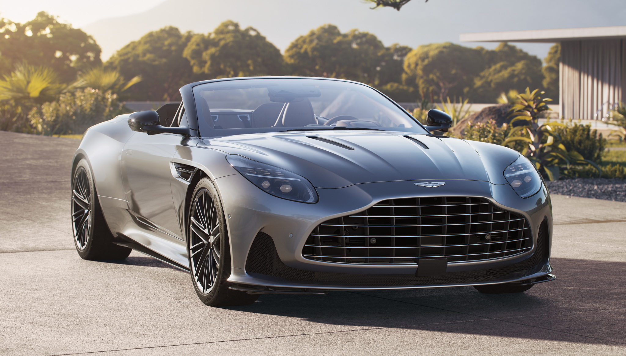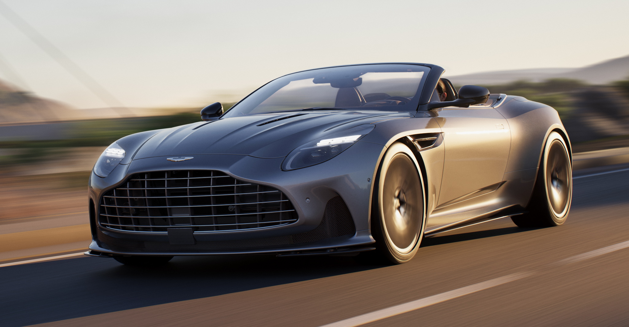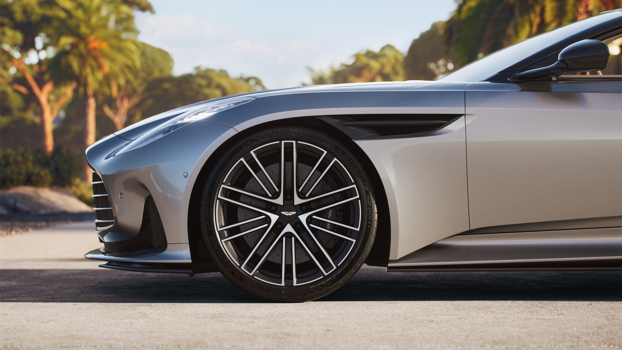 DB12 Volante เปิดประทุนใหม่ล่าสุด มากับหลังคาผ้าใบไฟฟ้า ใช้เวลาเปิด 14 วินาที ปิด 16 วินาที ใช้งานได้ที่ความเร็วไม่เกิน 31 ไมล์/ชม. กลไกแบบ K-fold ถูกออกแบบเพรียวบาง ช่วยเพิ่มความความจุสัมภาระท้ายได้ดีขึ้น ใต้หลังคาบุฉนวนกันความร้อน 8 ชั้น ปรับปรุงด้านเสียงเพื่อความเงียบสงบภายในห้องโดยสาร ตัวรถดีไซน์ดุดันไม่ต่างจาก Coupe เช่น กระจังหน้าที่ใหญ่ขึ้น 56% จาก DB11 แทร็กล้อขยายกว้างขึ้นด้านหน้า 0.24 นิ้ว (6 มม.) และด้านหลัง 0.87 นิ้ว (22 มม.) ช่วงล่างปรับปรุงใหม่ไม่เน้นนุ่ม ล้ออัลลอยฟอร์จให้มามาตราฐาน 21 นิ้ว ควบคู่ยาง Michelin Pilot Sport 5 S สั่งทำพิเศษเฉพาะ DB12 มีรหัส 'AML' กำกับไว้บนแก้มยาง เบรกมาตรฐานเป็นจานเหล็ก ด้านหน้าขนาด 400 มม. คาลิปเปอร์ 6 สูบ จานหลัง 360 มม. คาลิปเปอร์ 4 สูบ พร้อมออฟชั่นเสริมเป็นจานจานคาร์บอน-เซรามิค เบรกดีทนความร้อนสูงกว่า และลดน้ำหนักใต้สปริงถึง 27 กก. เมื่อเทียบกับของเดิม