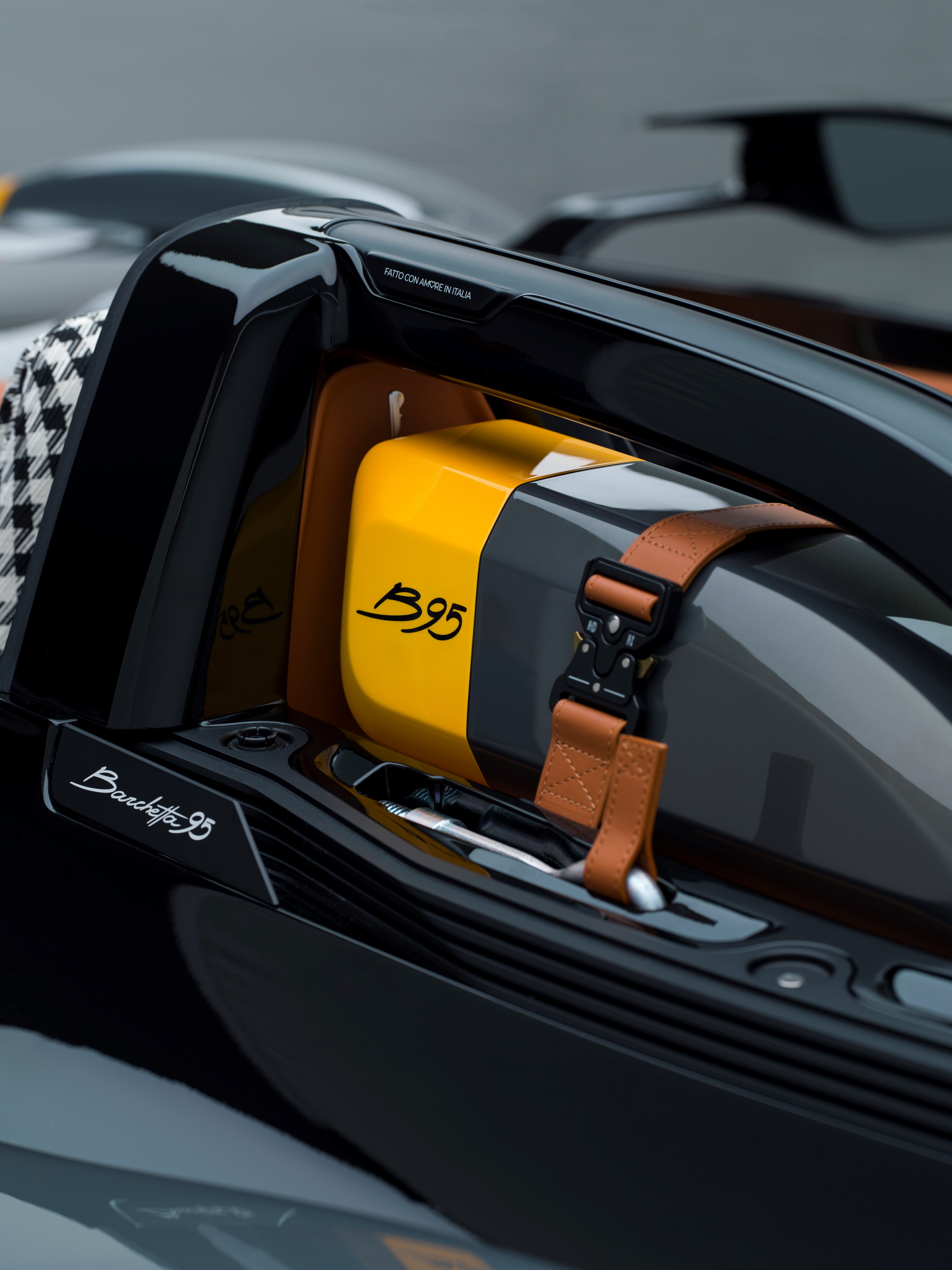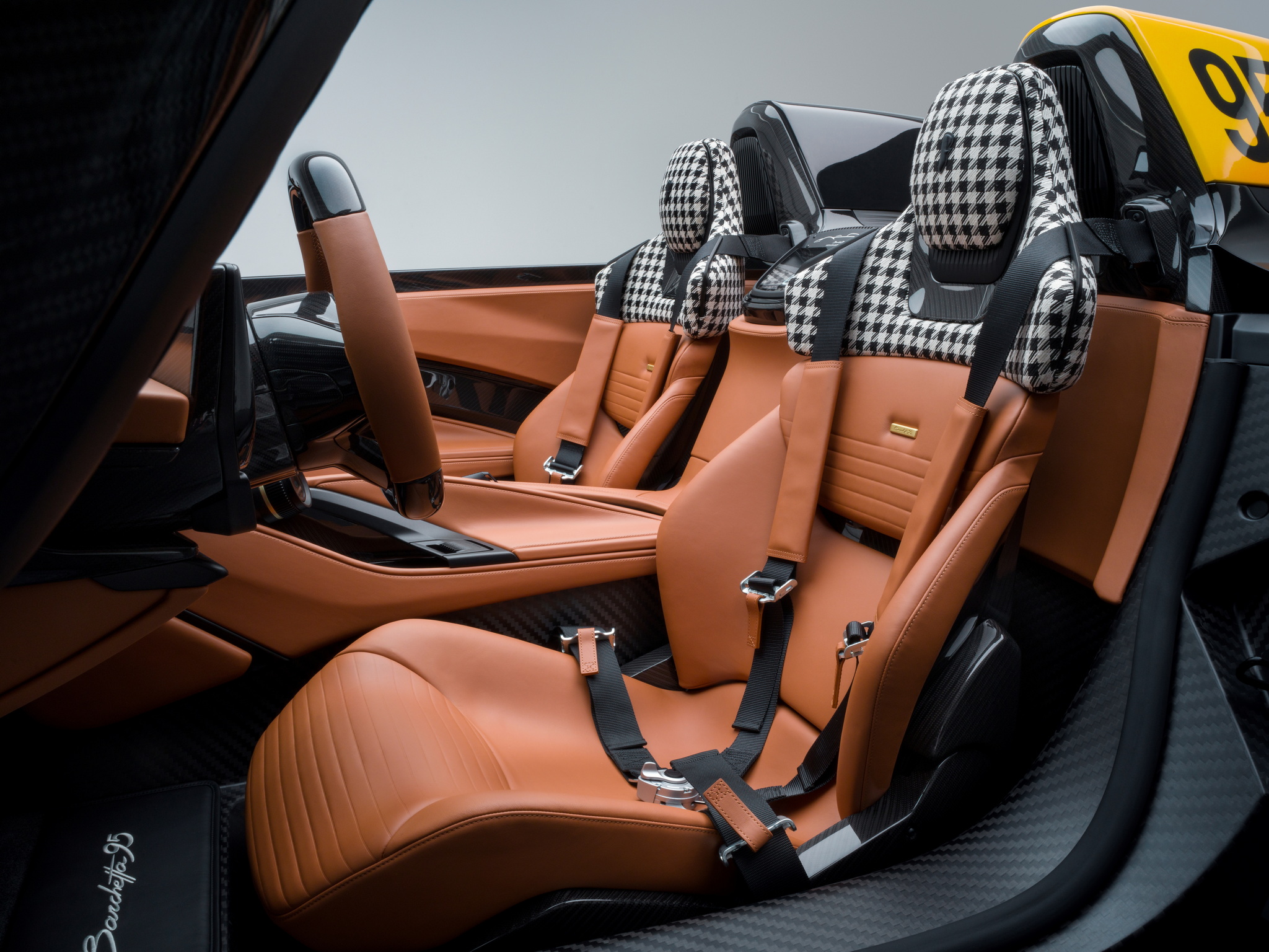ห้องโดยสาร B95 เป็นรูปแบบเดียวกับใน Battista แผงแดชบอร์ดหุ้มด้วยหนัง Tan Sustainable Luxury Leather ทำลายนูนได้ตามสั่ง เบาะนั่งดีไซน์ใหม่เพิ่มความคลาสสิคด้วยผ้า Pied de Poule Houndstooth