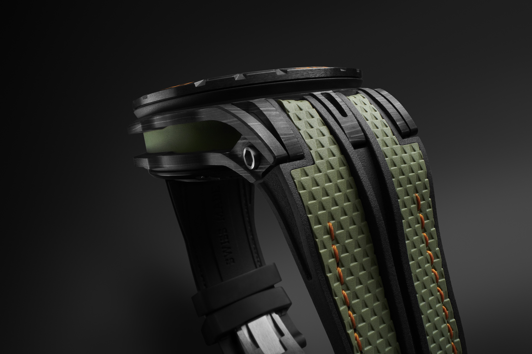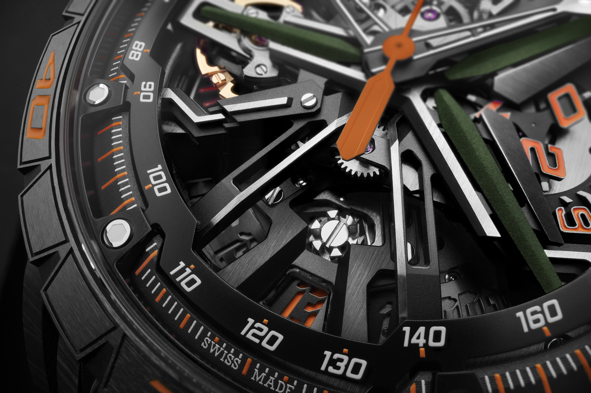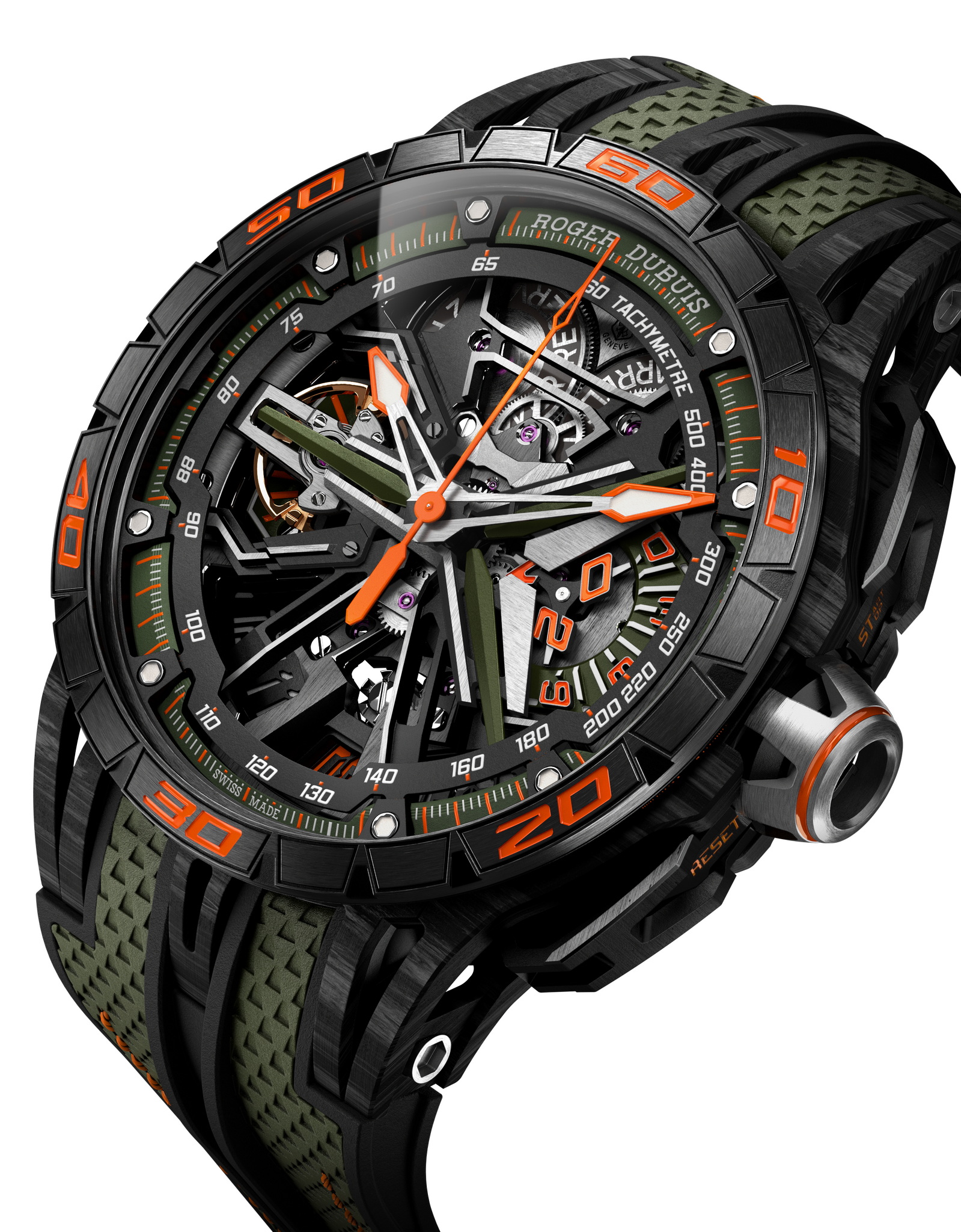 นาฬิการุ่นใหม่นี้ใช้ชื่อว่า Excalibur Spider Revuelto Flyback Chronograph มาในรูปลักษณ์ดุดันสปอร์ตเน้นโทนสีดำ ส้ม เขียว ตัวเรือนขนาด 45 มม. ทำจากคาร์บอนไฟเบอร์ C-SMC ขอบ Bezel ทำจากเซรามิกทนรอยขีดข่วนเป็นพิเศษ ตัวเม็ดมะยมไทเทเนียม DLC สีดำพร้อมวงแหวนแล็กเกอร์สีส้ม หน้าปัดเป็นแบบโคโนกราฟเปลือยโชว์กลไกวัสดุหลักจะเป็นไทเทเนียม พลิกหลังตัวเรือนจะเห็นตัวโรเตอร์ก็ถูกดีไซน์ให้เหมือนล้อของ Revuelto กลไกขับเคลื่อนเป็นรุ่น RD780 สำรองพลังงานได้ 72 ชม. มีชิ้นส่วนภายในถึง 333 ชิ้น ส่วนตัวสายเป็นวัสดุยางสีเขียวตัดกับด้ายสีส้ม ถอดเปลี่ยนสายได้ง่ายด้วยระบบ Quick Release